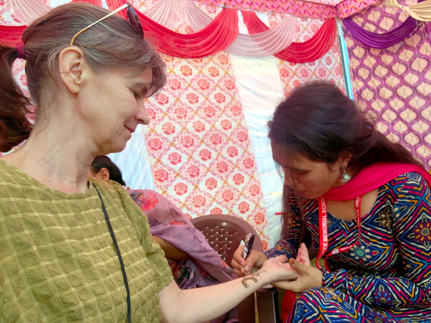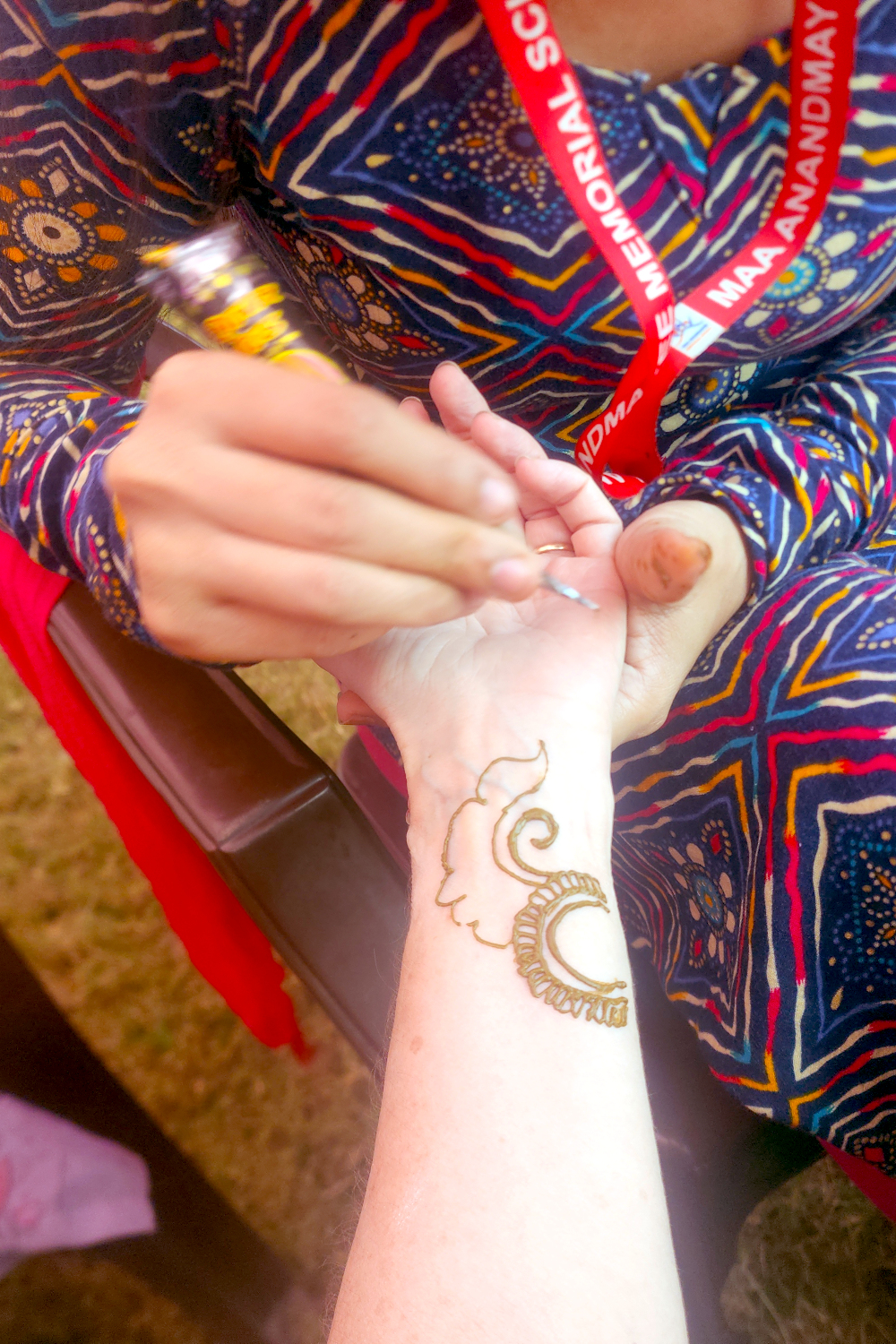 The grounds are festively festooned with colorful booths operated by students and teachers. Kimberly takes advantage of the opportunity to obtain a Mehndi design on her hand by one of the teachers who works with her at the Junior Campus. This is an Indian tradition of decorating hands with temporary tattoos on special occasions. They’re especially popular for weddings — sometimes the bride will have her groom’s initials concealed within the designs, which often include peacocks and lotus blossoms, among others.