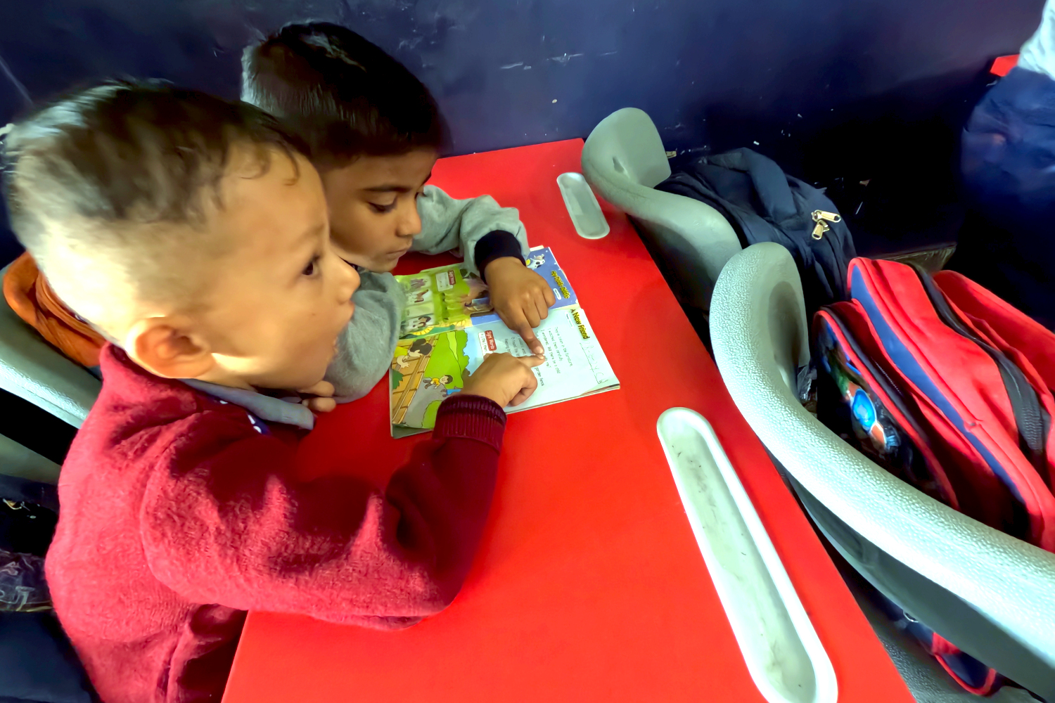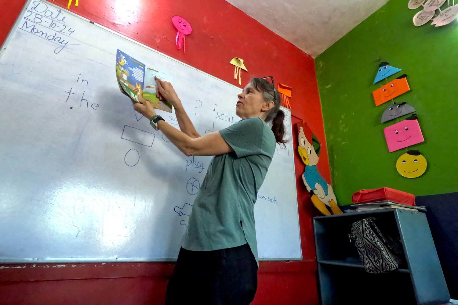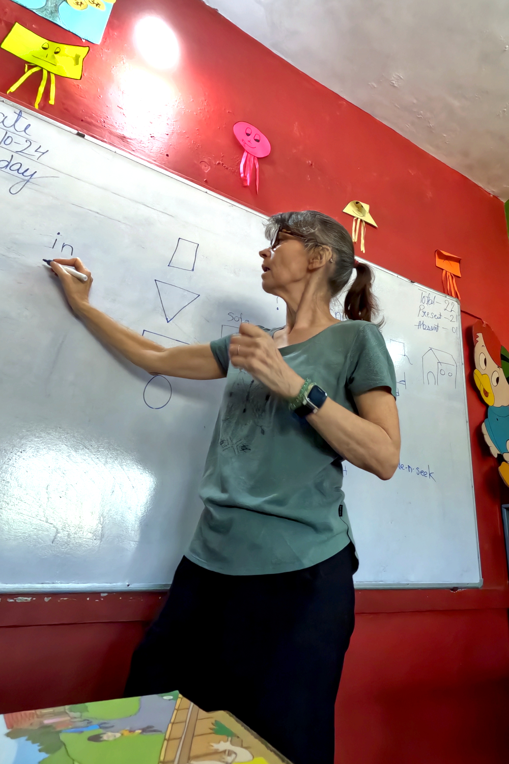 On Monday, the ATMs are functioning again, so we at last can obtain more. Monday is pretty much a full day of classes at Senior Campus, interspersed with last-minute readying for the school Diwali celebration the next day. For Kimberly at Junior Wing, it’s pretty much business as usual. She teaches class from their textbook, without being allowed to stray too much from the material. Just cover the lesson in the book, whether they understood or not. She’ll walk around the classroom to ensure they are following along in their books. Some students have to share books. They share their chairs with their backpacks, as there is no other place to put them.