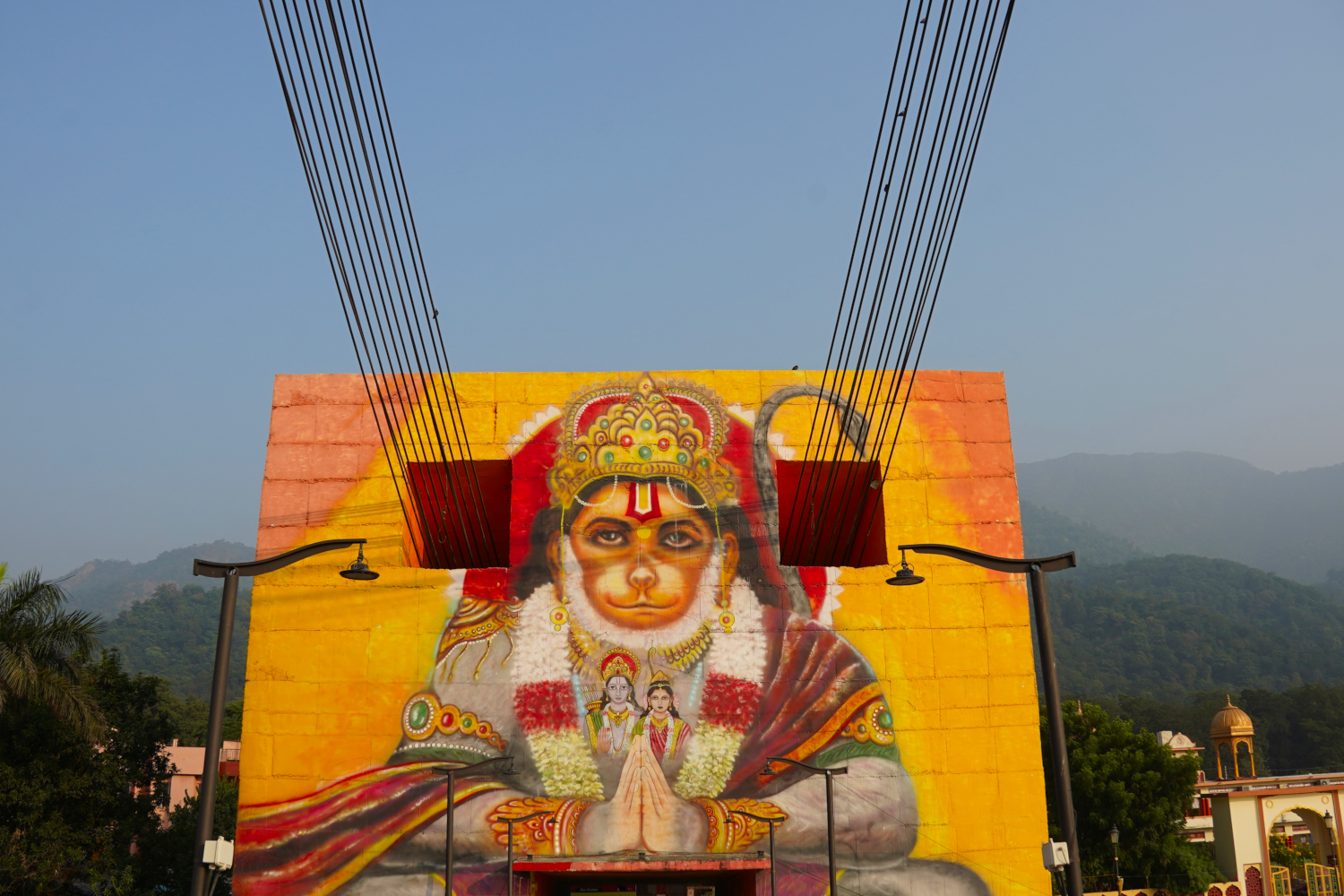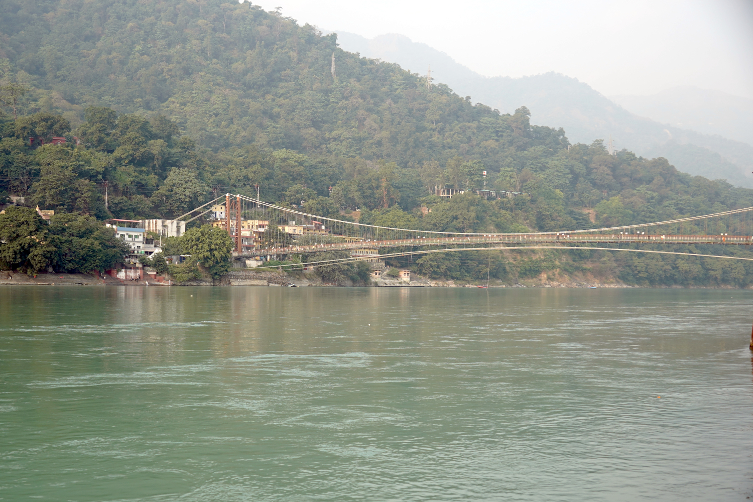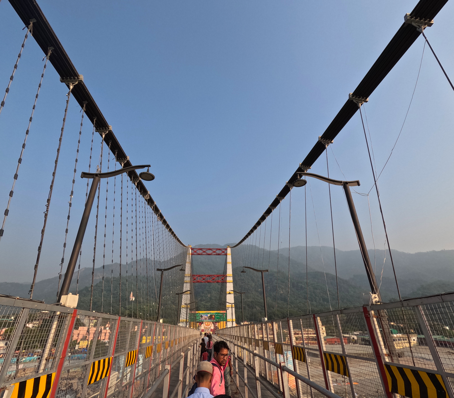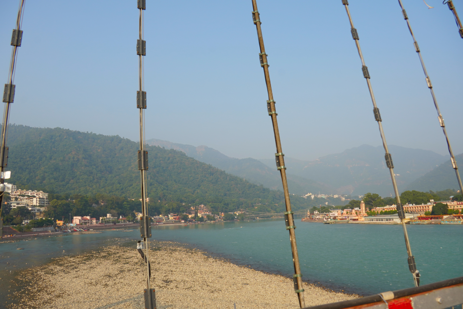 And we do indeed have a good vantage point, crossing the water on the fabulous Janki Bridge (Janki Setu), named after the Hindu goddess Janki, also known as Sita. (Why didn’t they use that name instead? Sita Setu would have been more alliterative.) The first three-lane bridge in Rishikesh, it spans about 900 feet and accommodates both pedestrians and wheels. It features elaborate carvings and paintings reflecting motifs from Hindu mythology.