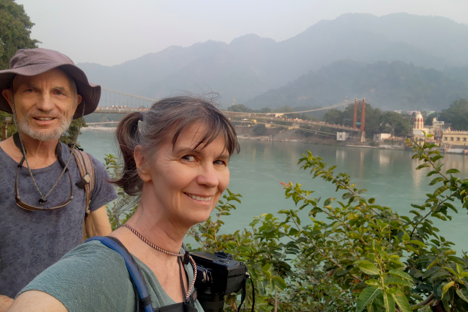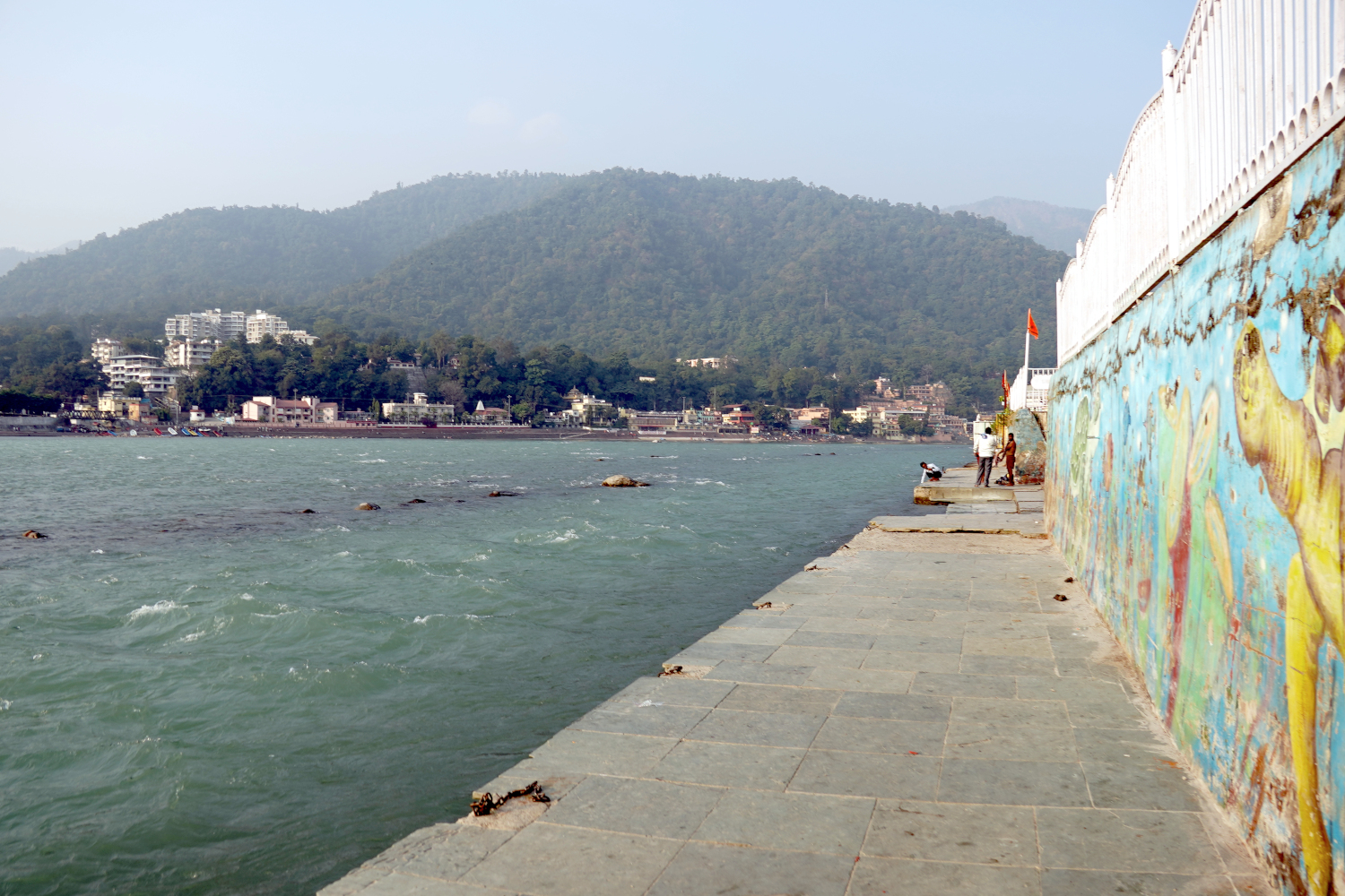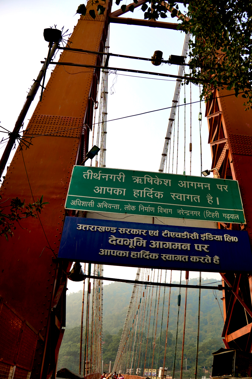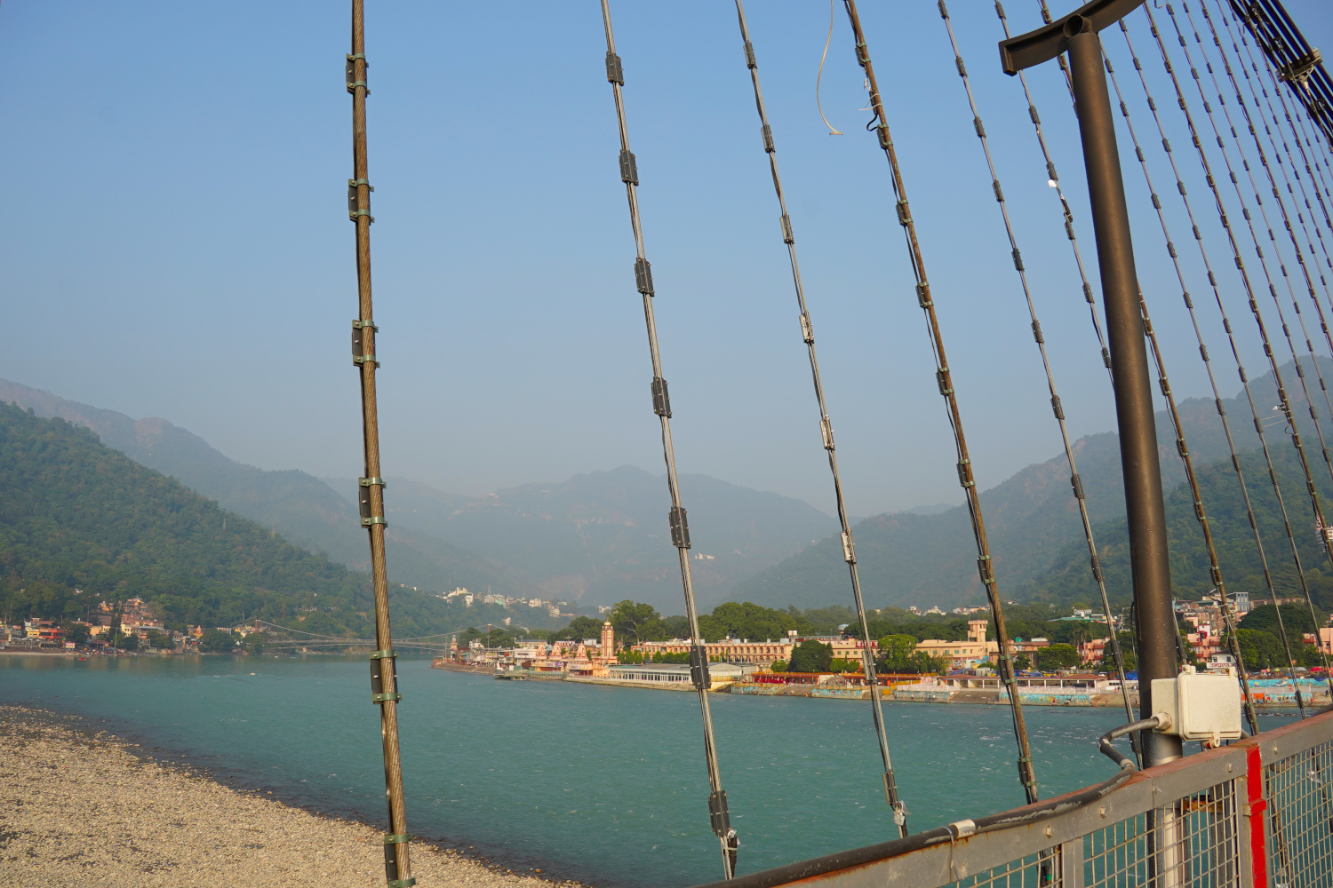 And we do indeed have a good vantage point, crossing the water on the fabulous Janki Bridge (Janki Setu), named after the Hindu goddess Janki, also known as Sita. (Why didn’t they use that name instead? Sita Setu would have been more alliterative.) The first three-lane bridge in Rishikesh, it spans about 900 feet and accommodates both pedestrians and wheels. It features elaborate carvings and paintings reflecting motifs from Hindu mythology.