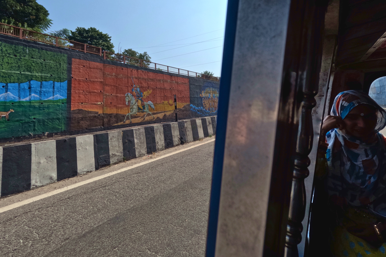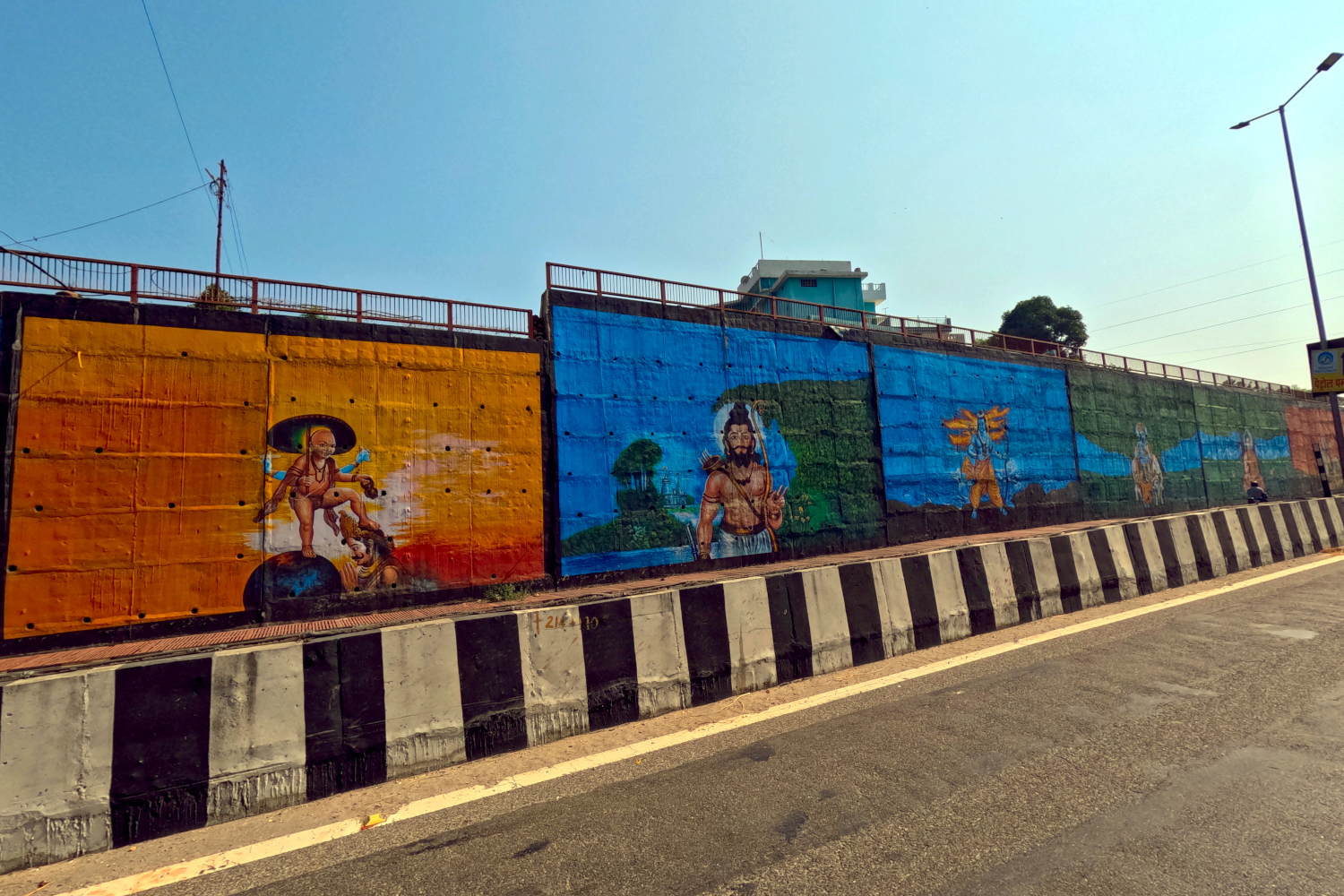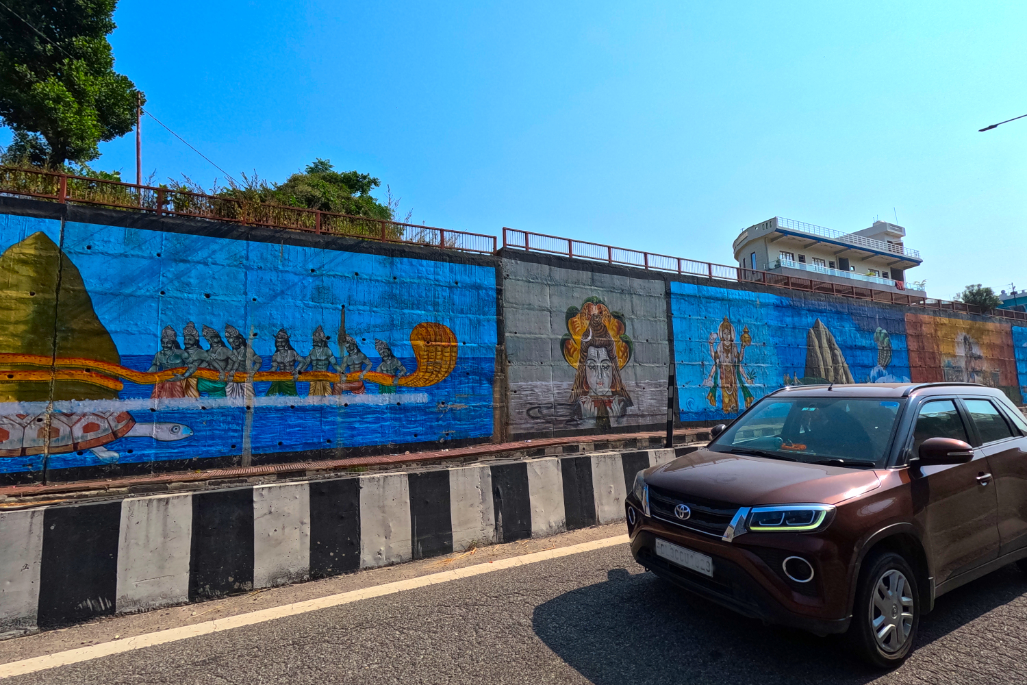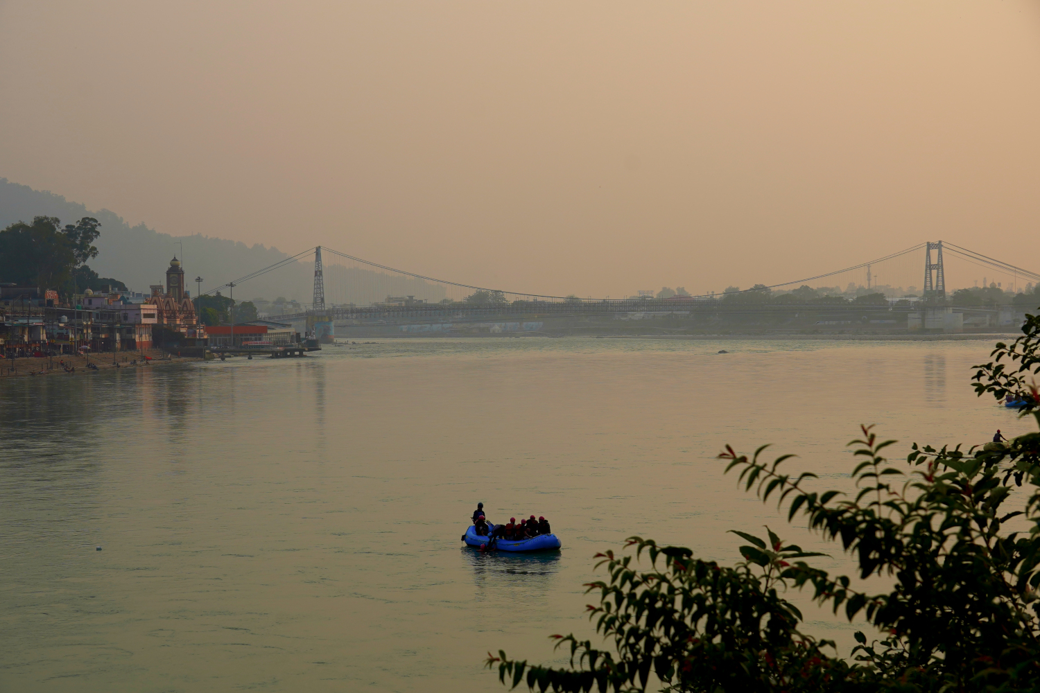 And we do indeed have a good vantage point, crossing the water on the fabulous Janki Bridge (Janki Setu), named after the Hindu goddess Janki, also known as Sita. (Why didn’t they use that name instead? Sita Setu would have been more alliterative.) The first three-lane bridge in Rishikesh, it spans about 900 feet and accommodates both pedestrians and wheels. It features elaborate carvings and paintings reflecting motifs from Hindu mythology.