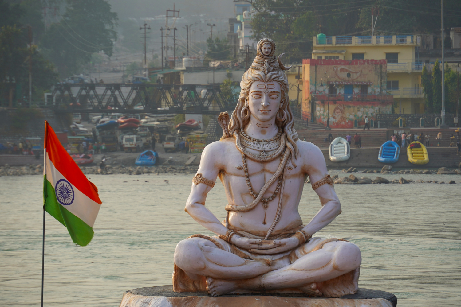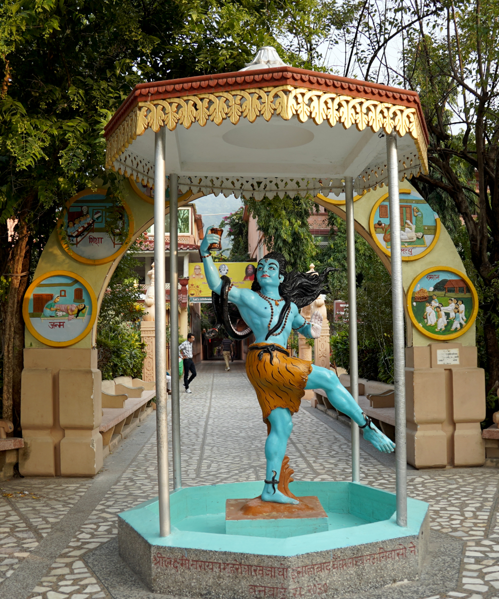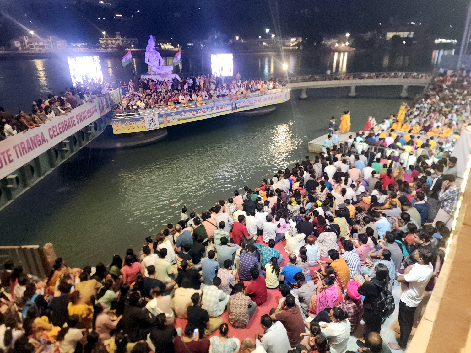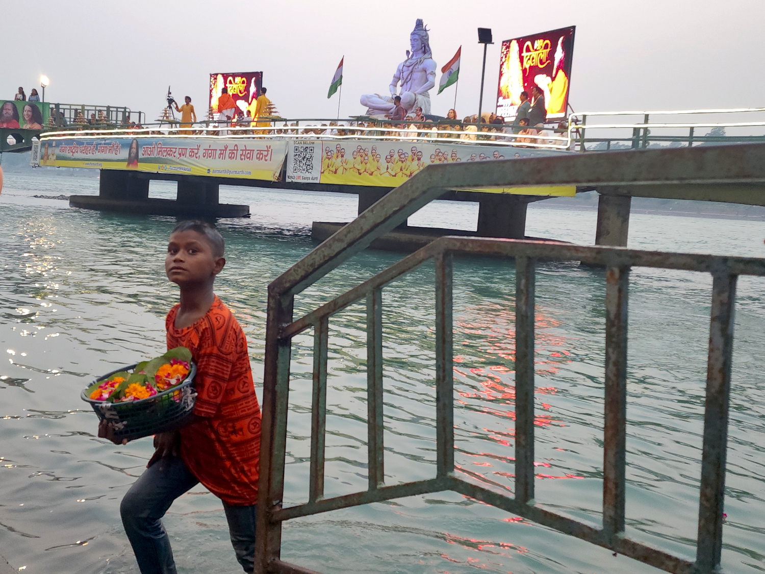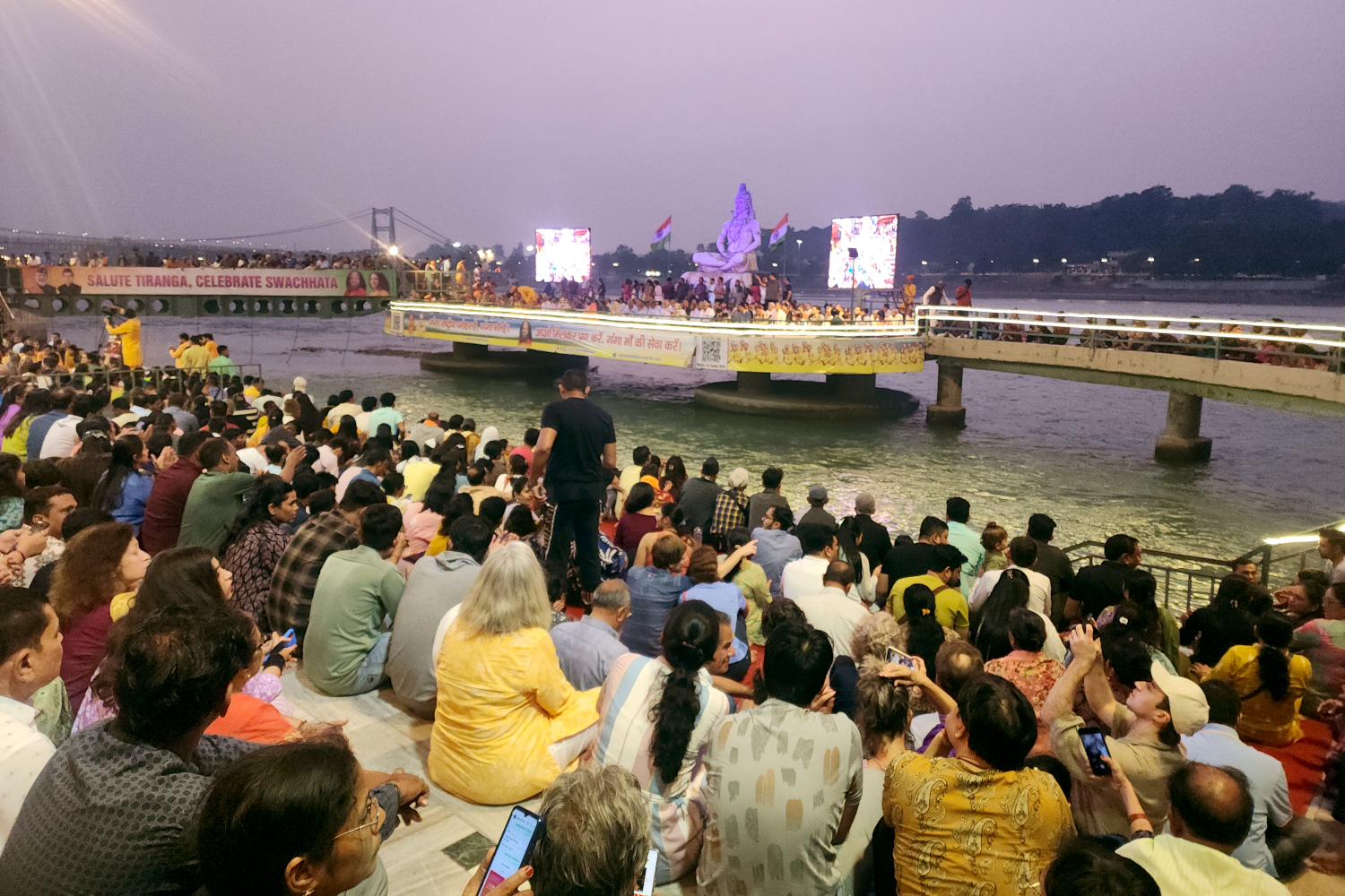 Late in the afternoon, after we’ve had some dinner, we head back to the other side of the river to witness the Ganga Aarti, a twilight ceremony honoring the sacred river. A crowd of hundreds (thousands?) have already gathered on the banks by the Parmarth Niketan Ashram, designated with a striking statue of Shiva.