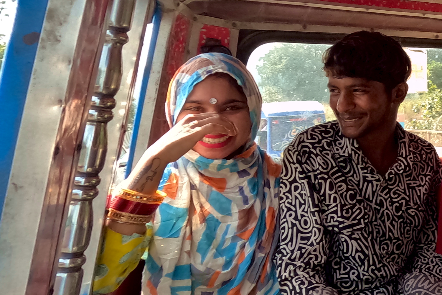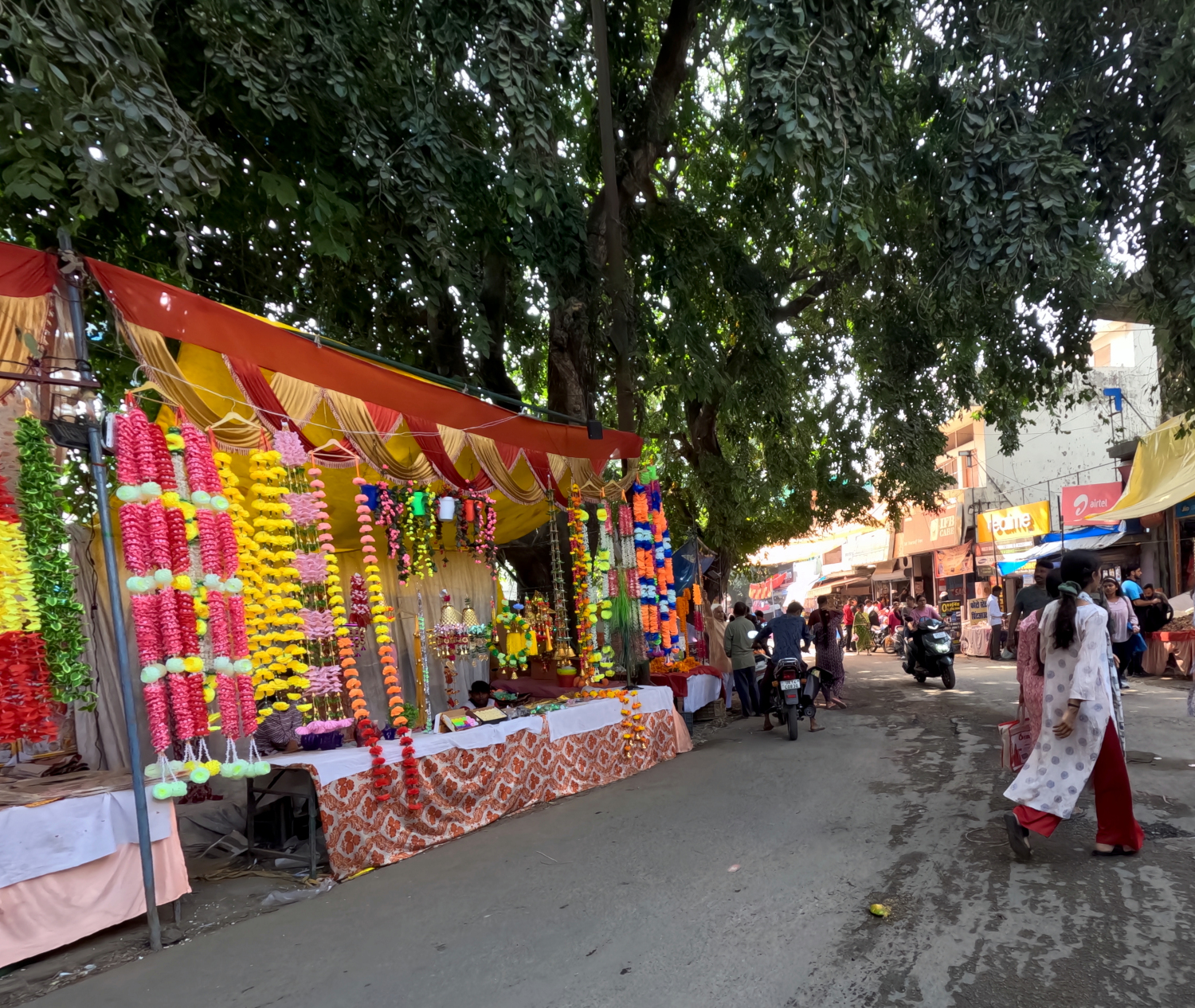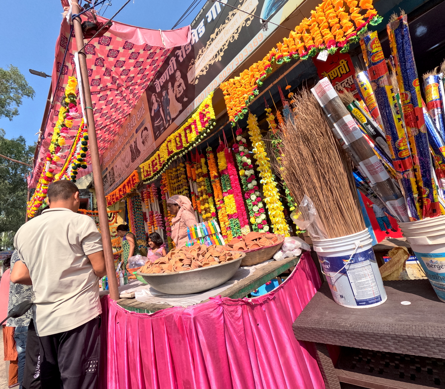 First we hike the two miles through Raiwala to Raiwala Junction, the major thoroughfare. Along the way, we pass booths displaying and selling colorful adornments for the holiday. At the junction we catch a tuk-tuk, jam packed as always with colorful and friendly locals. When we arrive in Rishikesh, we hand the driver 60 rupees to cover the standard fare of 30 each for a shared ride. But he informs us that we owe 20 more — from what we gather, there is a holiday surcharge of 10 rupees each.