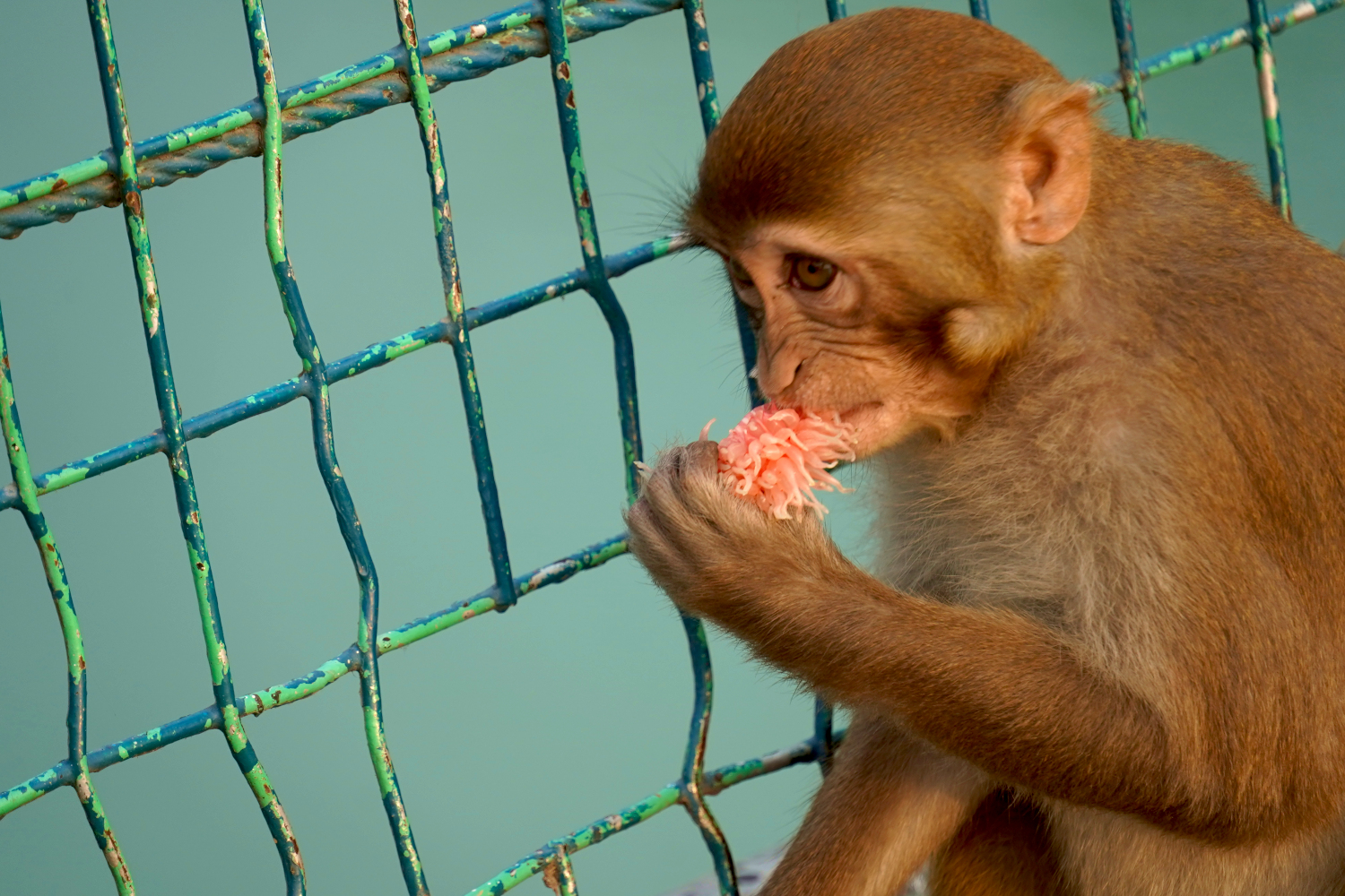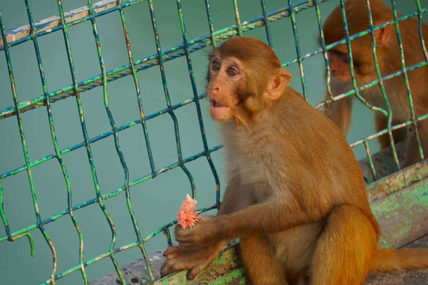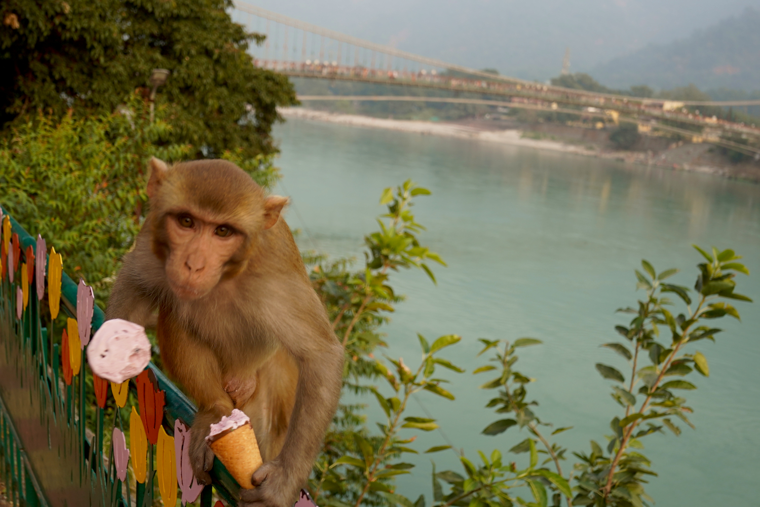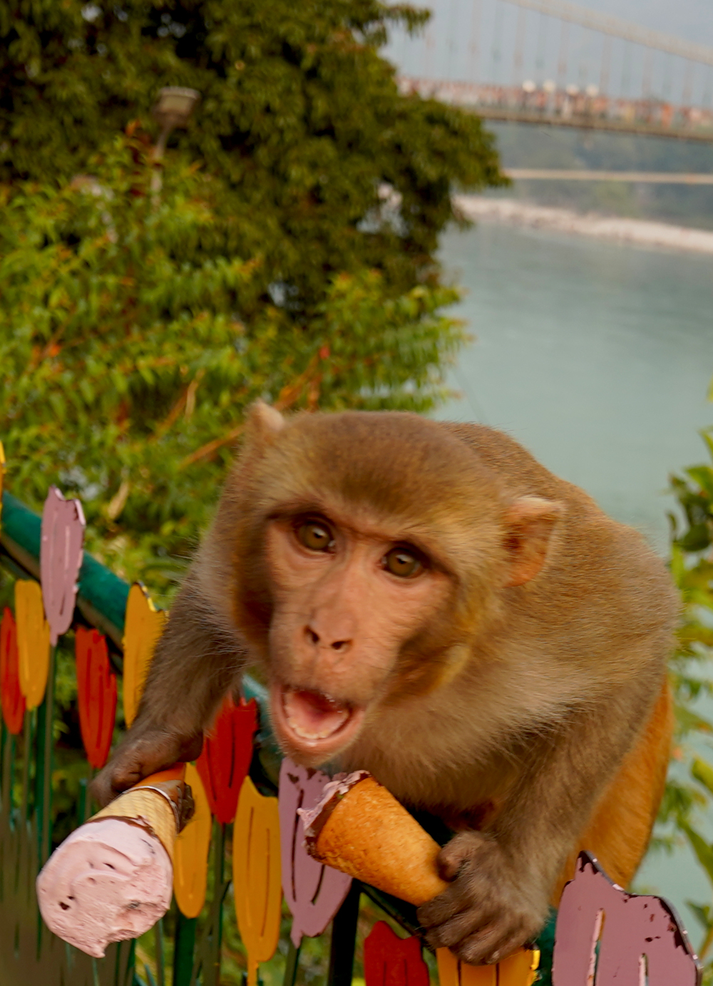 Back on the west side of the Ganga, we find a little park to rest up a bit, in which are a few monkeys cavorting. One of them has acquired not one but two ice cream cones, and is partaking of them alternately, as if trying to decide which flavor he prefers. We never find out what his verdict is, because he seems quite attached to both of them until the bitter (or sweet) end.