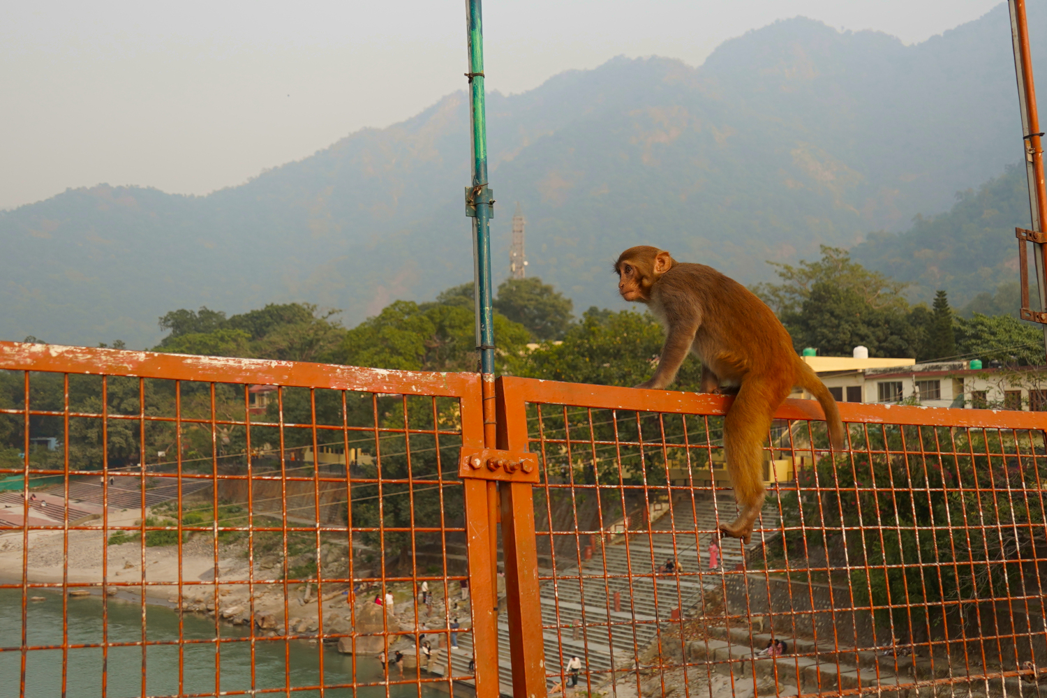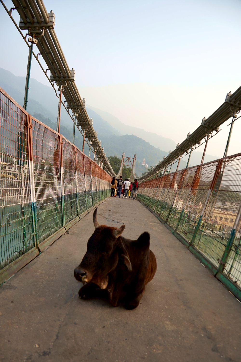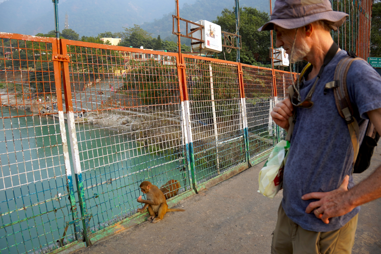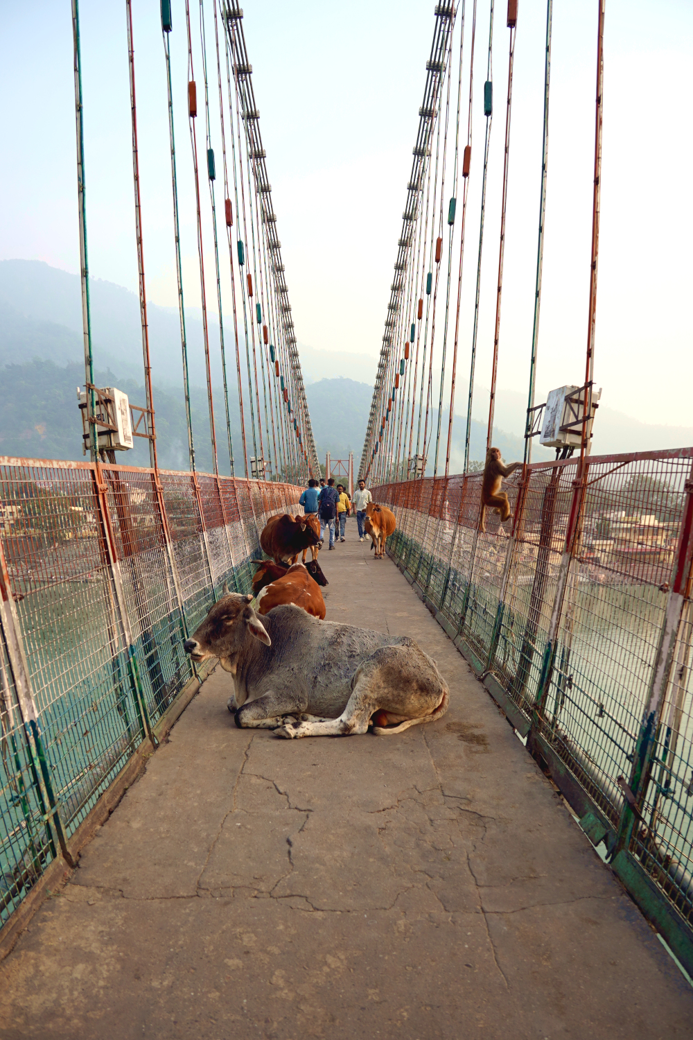 We end up at another suspension bridge, the Ram Jhula, which is about half as long and is limited to pedestrians — though that includes pedestrians with many different kinds of feet, even those with hooves and claws. You’ll encounter cows on the bridge (you’ll encounter them everywhere in India) and monkeys, though the latter are just as likely to be climbing on the cables as to be patiently going the human route.