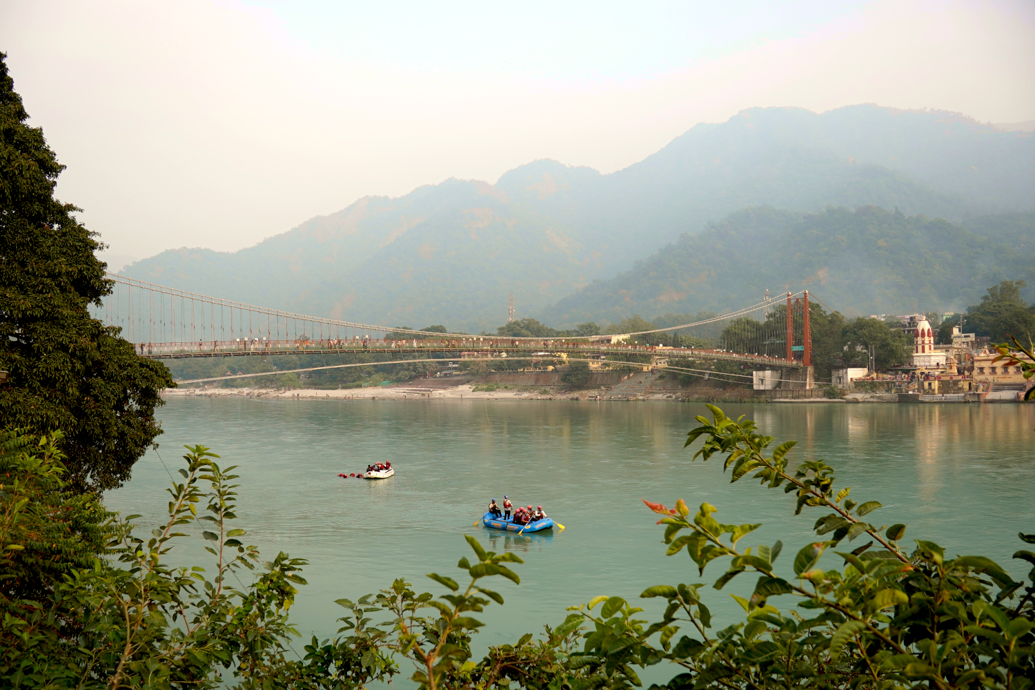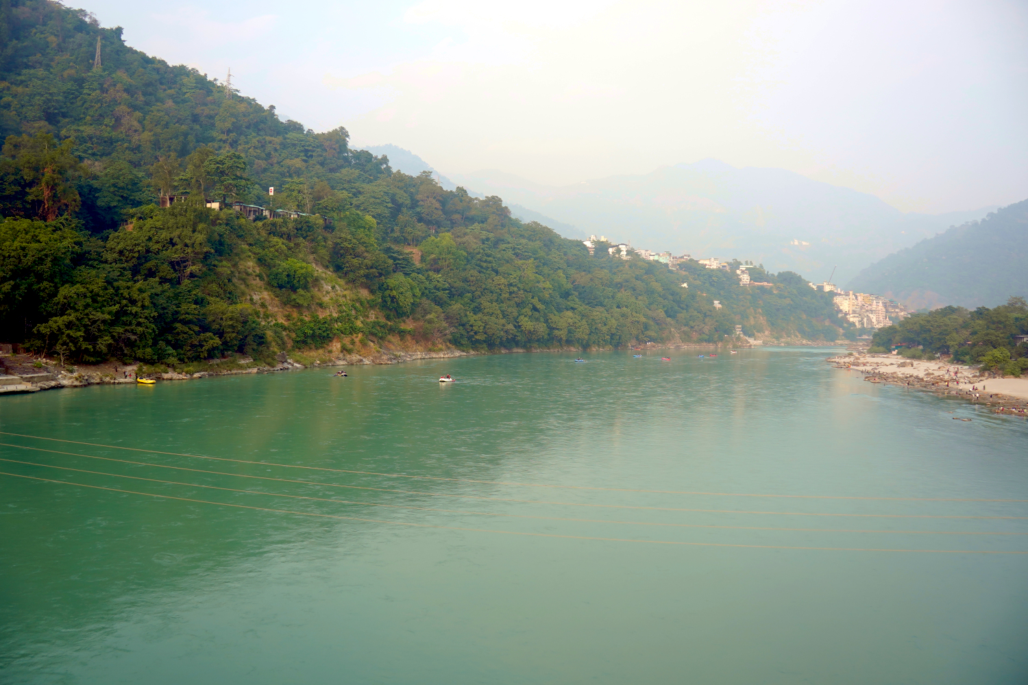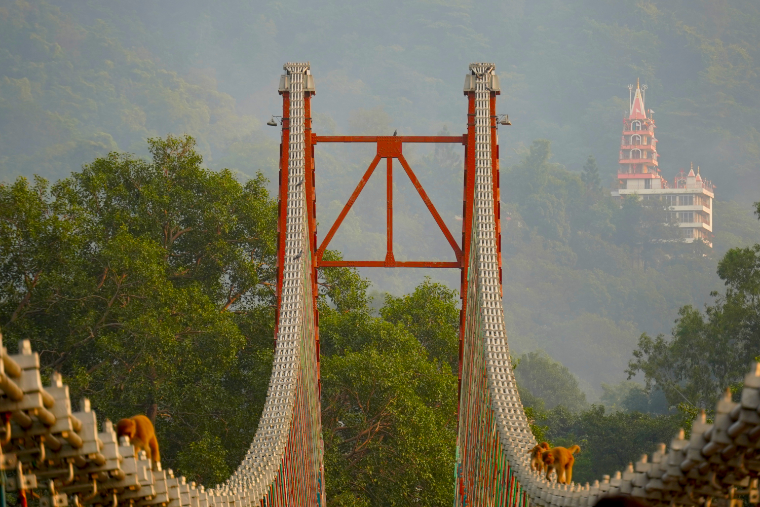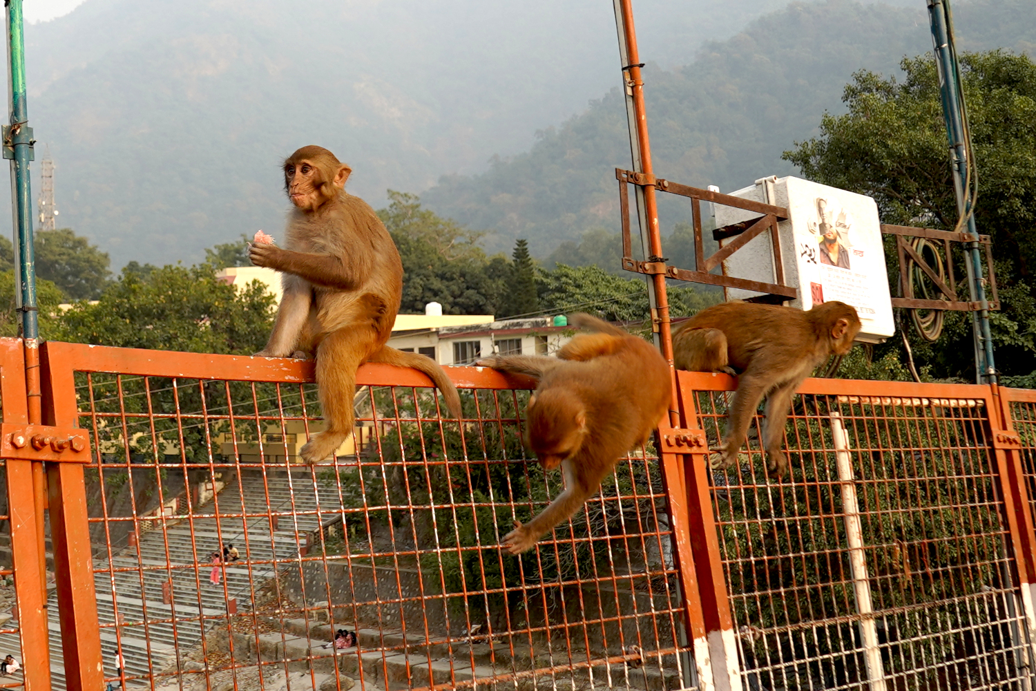 We end up at another suspension bridge, the Ram Jhula, which is about half as long and is limited to pedestrians — though that includes pedestrians with many different kinds of feet, even those with hooves and claws. You’ll encounter cows on the bridge (you’ll encounter them everywhere in India) and monkeys, though the latter are just as likely to be climbing on the cables as to be patiently going the human route.