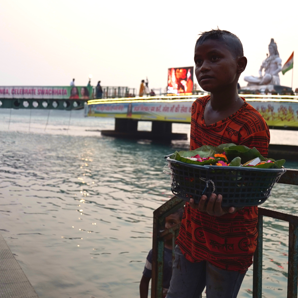 Going down to the water’s edge, we encounter kids and women trying to sell us flowers, apparently for religious purposes. and two boys want to pose with us for a photo – but they have no phone. We finally figure out that they expect us to pay them to pose for our own phone’s photos. No, thanks; we’re not a modeling agency.