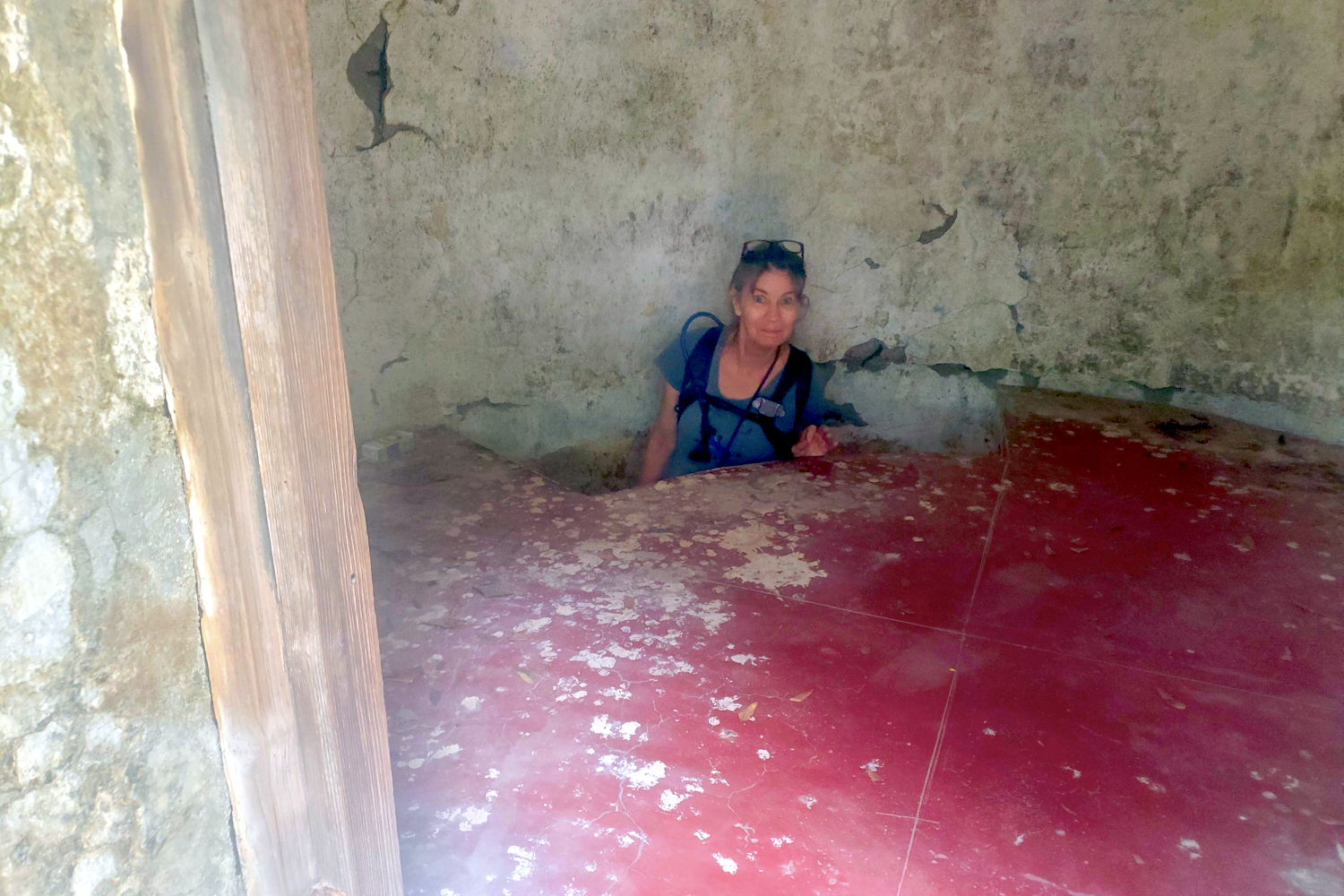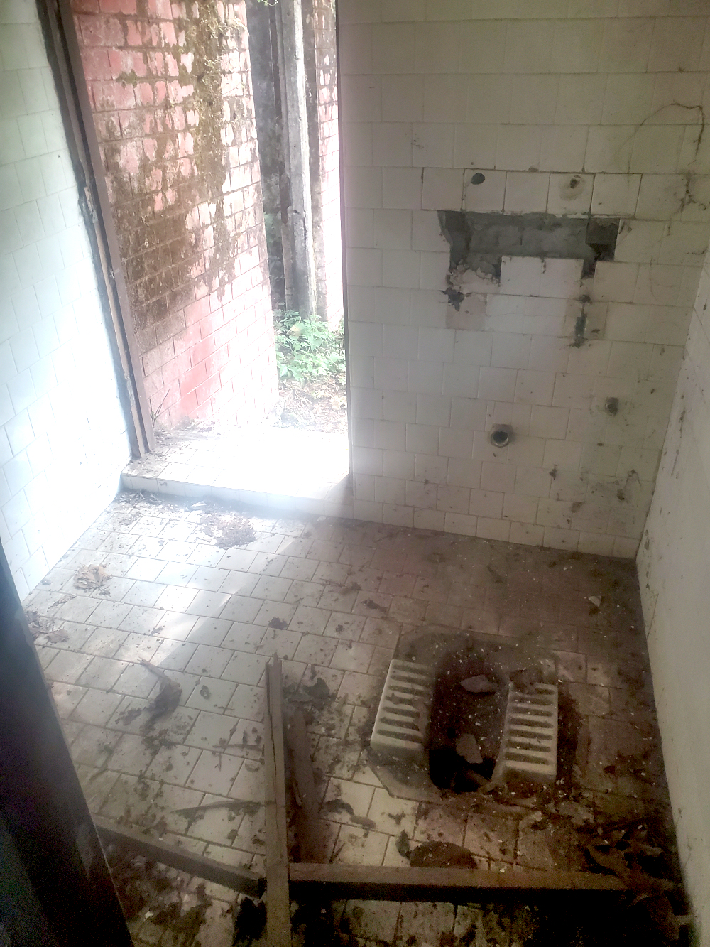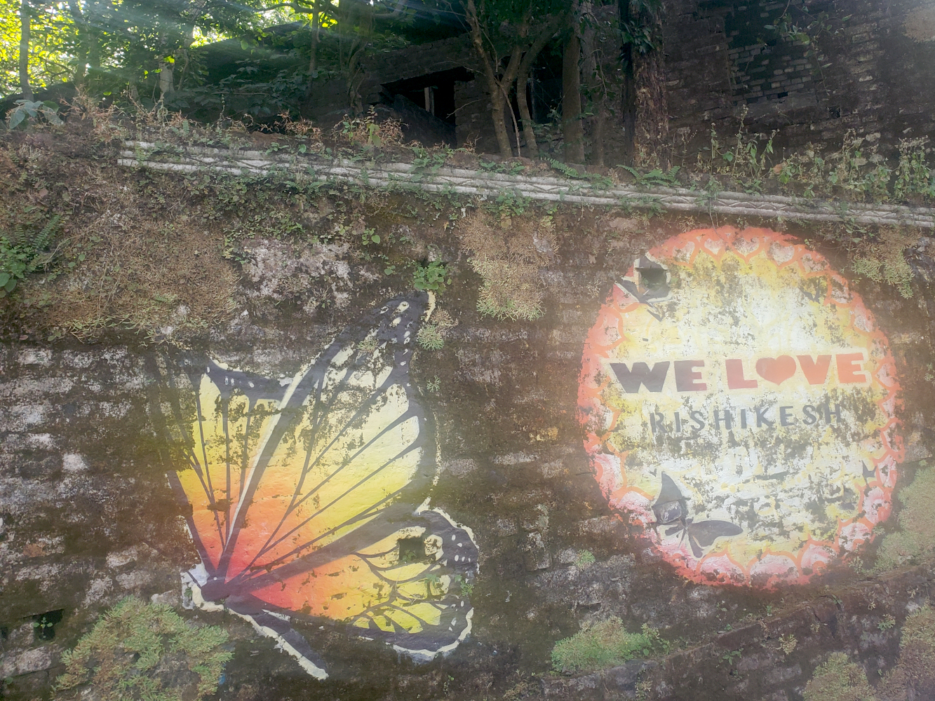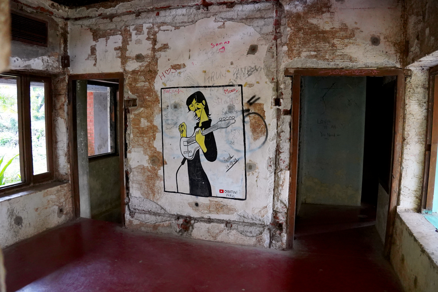 Like several of the other buildings in the complex, the interior walls of the Maharishi’s home have been adorned with graffiti and/ or unauthorized murals during the years the place lay fallow. But since these tended to be rather artistic, and to fit the theme quite nicely — butterflies, messages of peace and love, and likenesses of the Beatles, for instance — they’ve been left in place. Oh, and in our unguided tour of the master’s headquarters, we can’t resist taking a photo of his toilet.