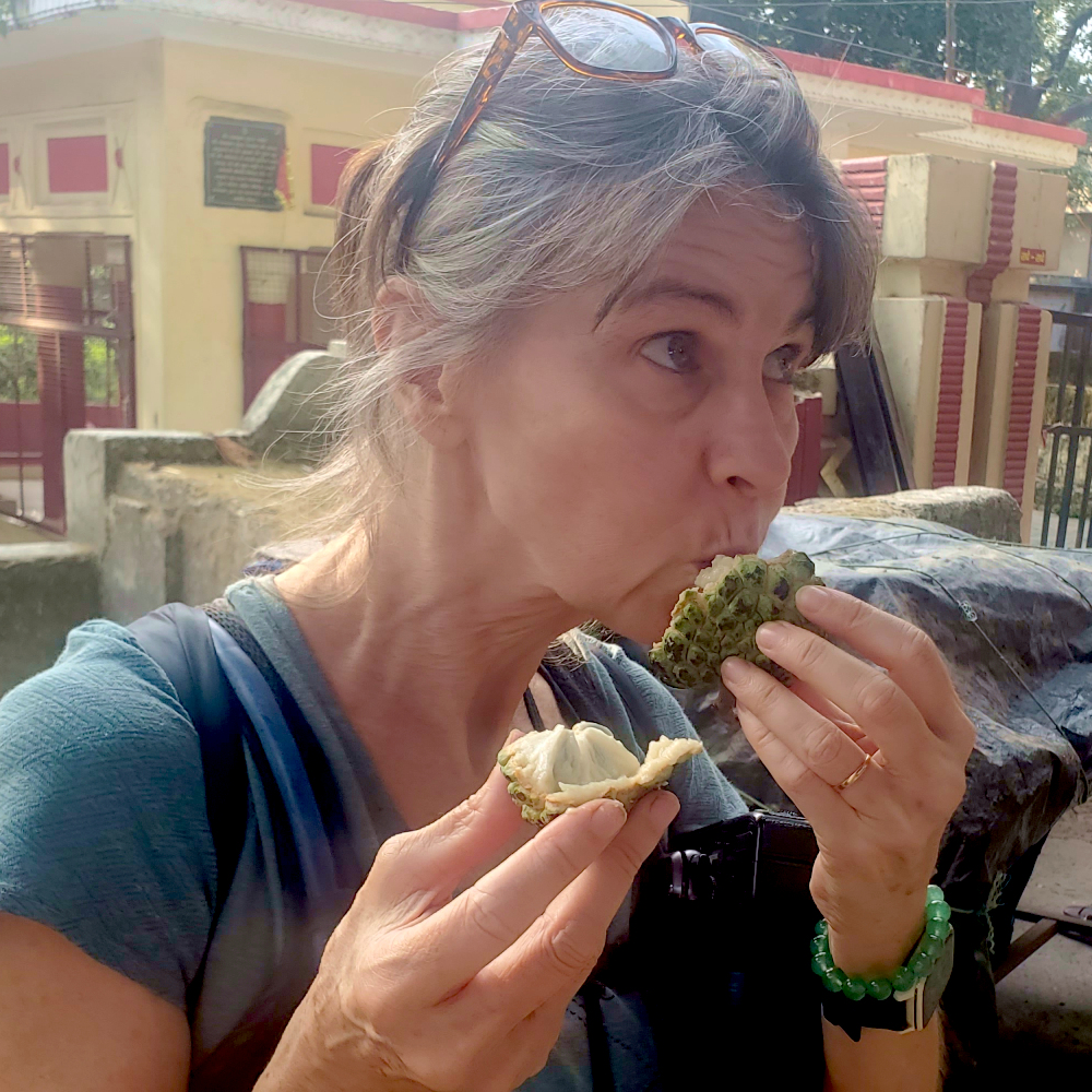 After leaving the Ashram, we make our way toward the riverside restaurant where we’d eaten lunch previously. Along the way, we come upon two Japanese women — we know where they’re from because we hear them speaking in Japanese. So we can’t resist trying out our rusty Japanese on them (we’ve visited Japan twice, and learned a little of the language in preparation for those trips) and they are delighted to hear it. One of them happens to have a GoPro 12, just as we do.