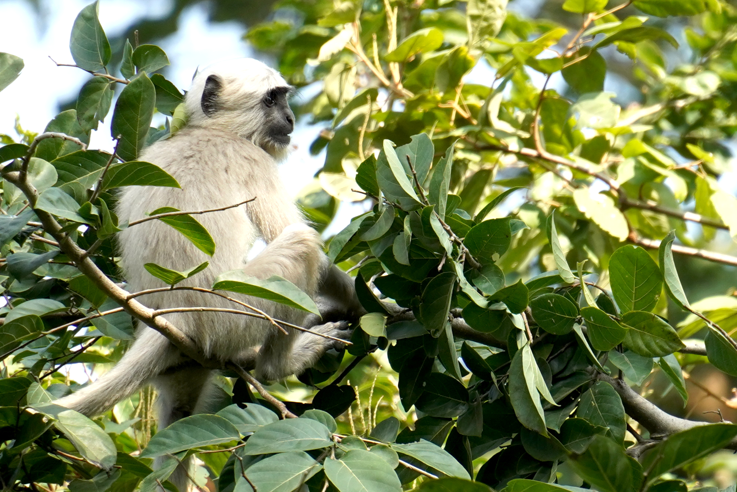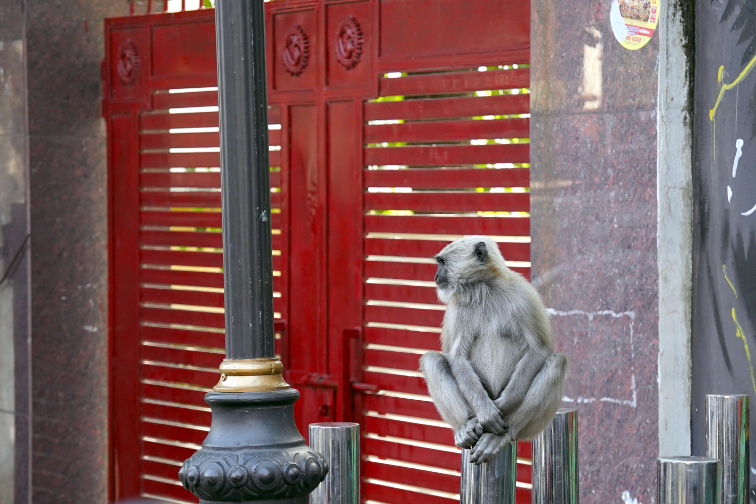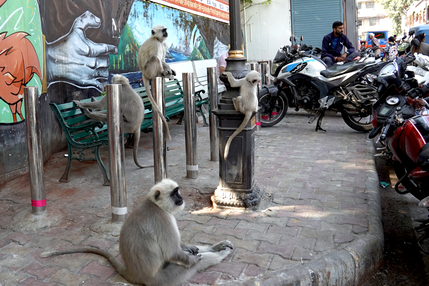 Then we walk back toward the colorful Janki Bridge across the Ganga (Ganges), which we’d crossed on our previous outing in Rishikesh. Near the bridge, we spot a pack of five monkeys (Tarai gray langur) the kind living on the other side of the river in the woods. They have created their own little playground, leaping back and forth between a motorcycle and a lamppost, including the baby of the lot.