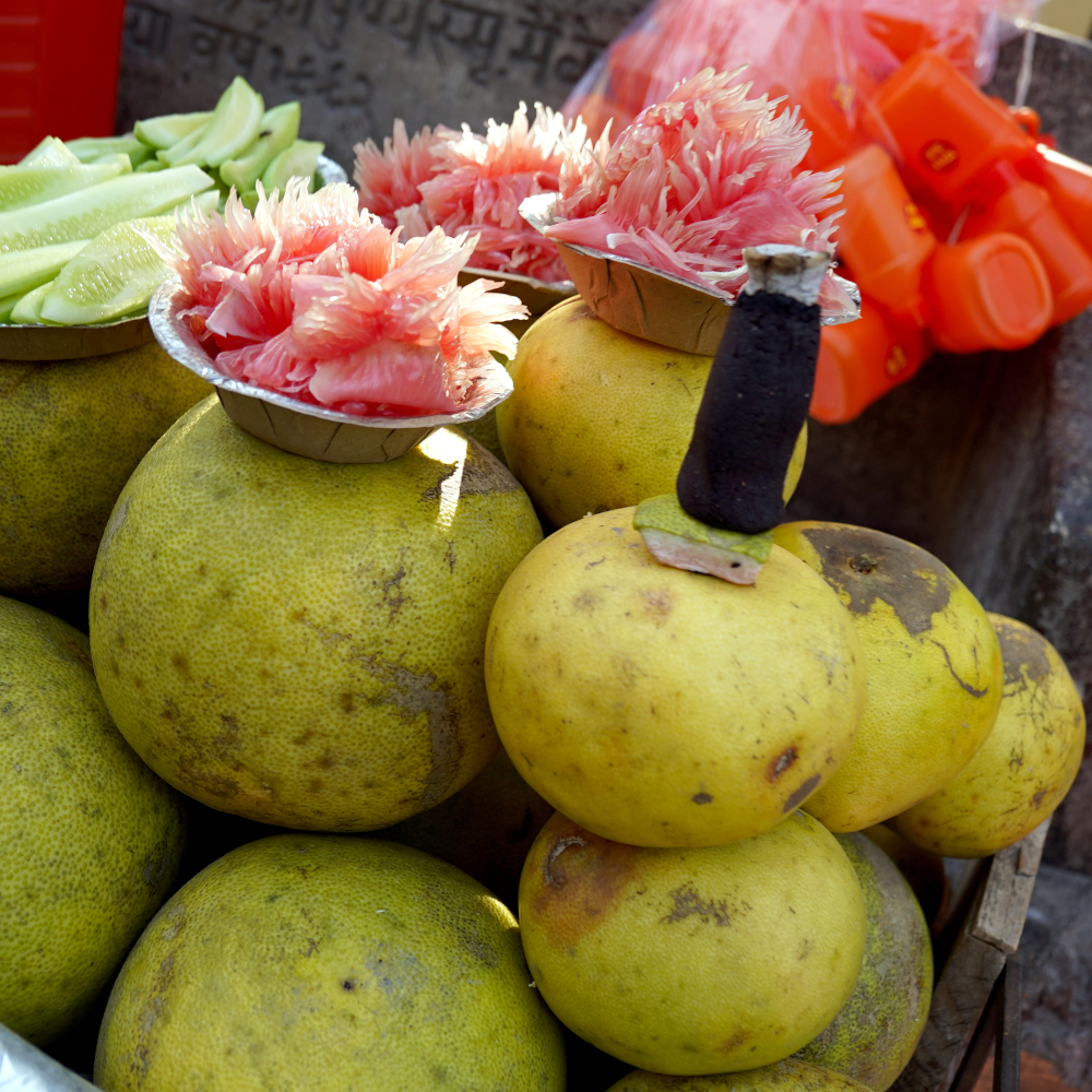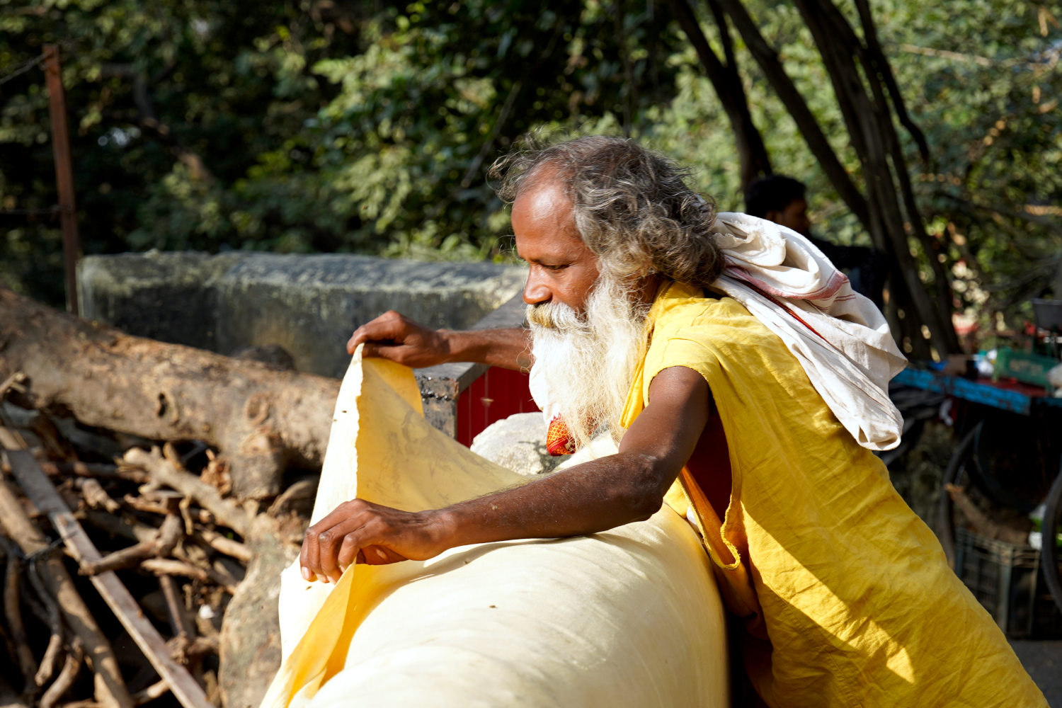 After having another excellent lunch with a view overlooking the Ganges, we go on a couple of wild goose chases — one for an organic store, and one for an ayurvedic store, neither of which actually exists. Walking along the narrow passageway by the river, we suddenly spot four bulls charging toward us. There are often cows of various sorts on this path, but normally they travel in a leisurely fashion. But these appear to have spooked by something and are making a mad dash to who knows where. A man walking behind us pushes us back out of the way, and we flatten ourselves against the wall, hoping the bovines will mistake us for murals and charge on by without paying us any heed. They do, and from what we can tell, nobody is harmed in the stampede.