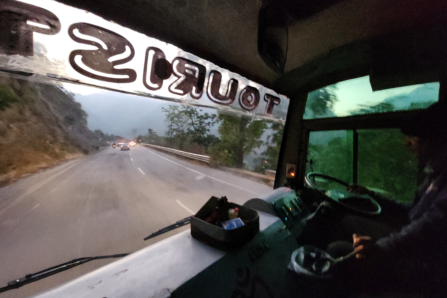 The next day we are treated to another outing included in our Yoga Teacher Training program. This time we are heading to a beach to greet the rising sun and visit a meditation cave. So we strike out on another winding twisting road that prompts passengers who are prone to motion sickness to turn green. I somehow end up in the window seat at the front next to the driver, which provides a great view and is fun, because how often do you get an opportunity to ride next to the bus driver in the States.