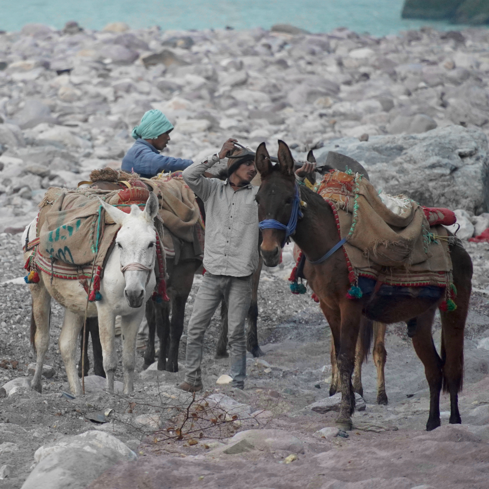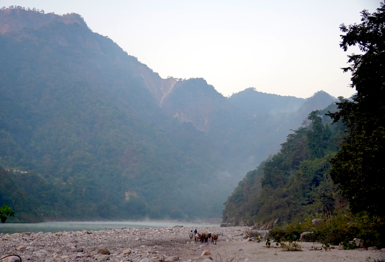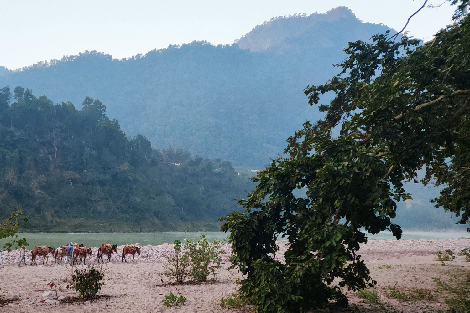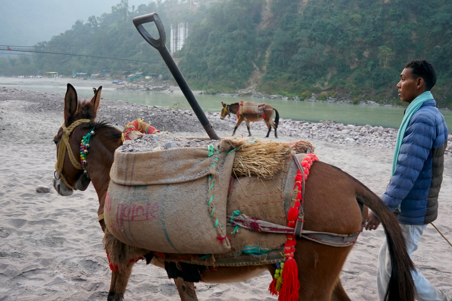 When we arrive at the beach we got a few moments to enjoy the view. The pack mules catch my eye as well as the mist raising from the river and the overall sense of peacefulness. I’ve been curious about the mules, since I’ve been seeing them traipse by my room every morning at dawn down the hill to who knew where. Now I’m able to see what these pack mules have been carrying. Their handlers are loading gravel and rocks into their packs.