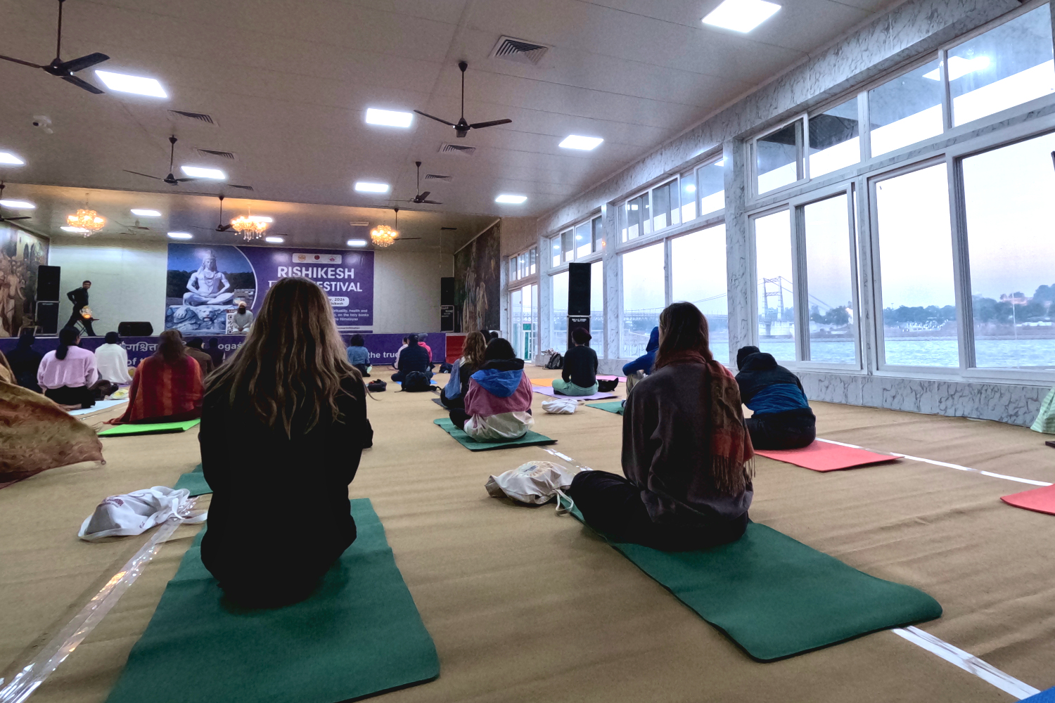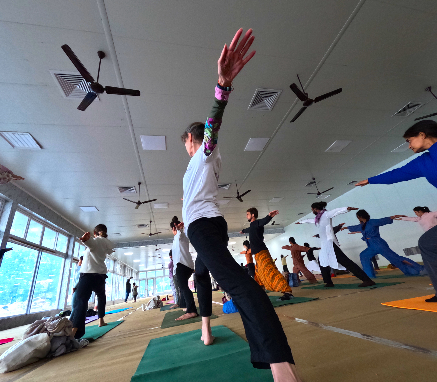 KIMBERLY: What do students training to be yoga teachers do on their day off? Why, go to a Yoga Festival to take more yoga classes, of course! So after a typical 6 day week of Hatha Yoga and Pranayama (breathing) before breakfast, followed by classes in Anatomy, Adjustment and Alignment, Philosophy, Ashtanga and Meditation, we are looking forward to Sunday and an opportunity to participate in the Yoga Festival. Up before the sun, we are off to the festival location on the other side of the river. First Hatha Yoga at sunrise right next to the Ganga River.