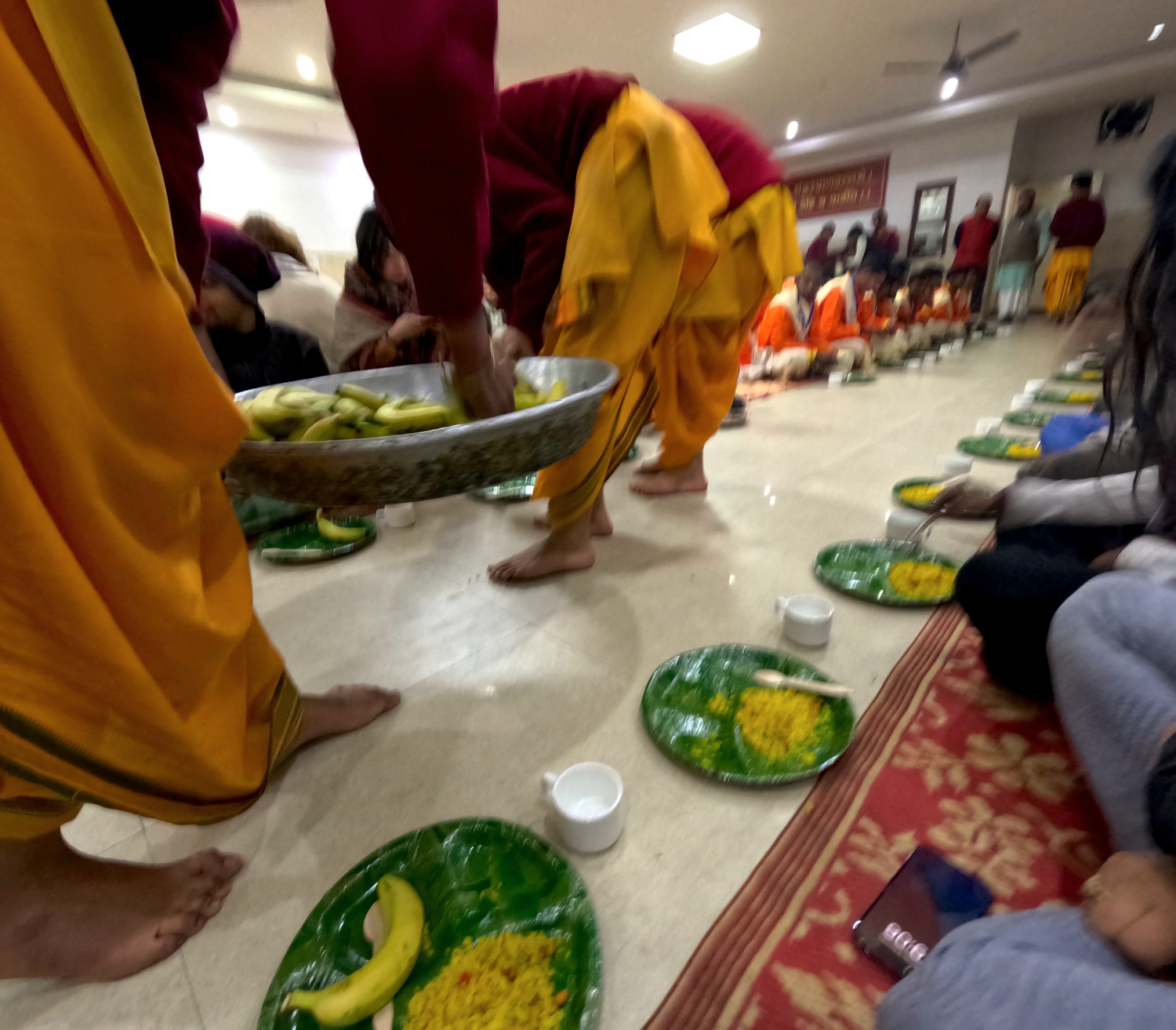 Followed by a fire ceremony and breakfast served on the floor by barefoot monks. Notice the circular pieces in the fire pit we are all gathered around? Why, those are dried cow chips, of course. During the ceremony we toss Havan on to the flames, which is a mix of ghee and 52 different herbs. The herbs produce oxygen, purifying the environment. The offerings symbolize a surrender of attachments and desires. The fire represents the mouth of the universe. In Vedic tradition it is believed to purify both the offerings and the participants, symbolizing a transformation and letting go of negativity. We also chant “swaha” which translates to “Please receive, burn my ego so I can learn”.