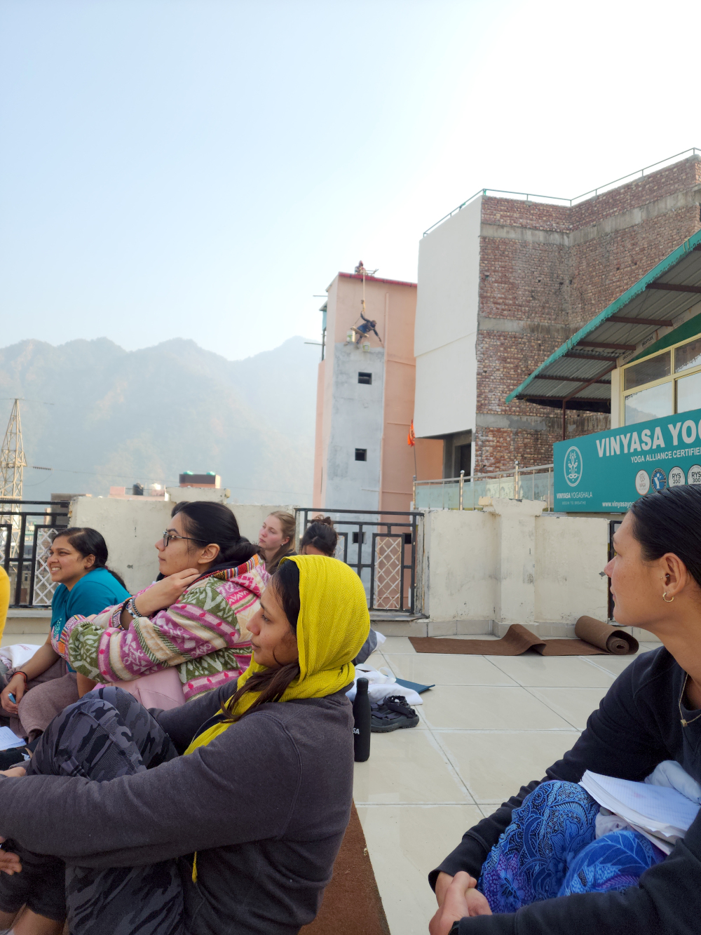 KIMBERLY: My 200-Hour Yoga Teacher Training Course at Vinyasa Yogashala is coming to an end. Our Philosophy Teacher opts to hold our final class on the roof top, although most of us are distracted by the workers dangling from a rope painting the side of a 5 story building next to us with no safety harness.