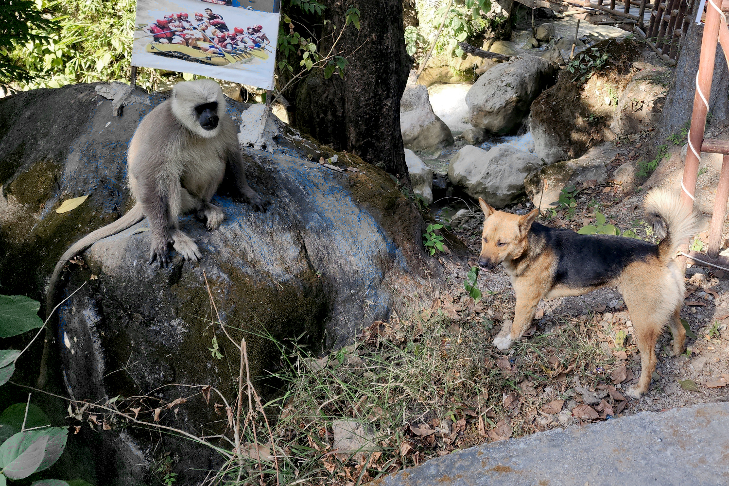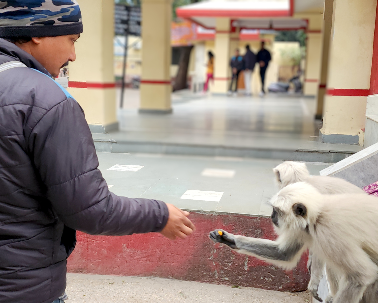 It’s a very quick trip to the other side, and then finally we can walk along the Ganga, past spiritual-minded mendicants in vibrantly colored garments and ladies laughing and chatting around a fire, until we come to Janki Bridge, which will take us back across the river. Along the way, we encounter some of those unusual monkeys (the Tarai Gray Langur, a near-threatened species) that seem to prefer that side of the river, as that’s where the biggest forests are. One fellow has trained them to eat out of his hand. That’s quite a feat (no pun intended), as wild monkeys are both skittish around humans and aggressive if they feel their space threatened.