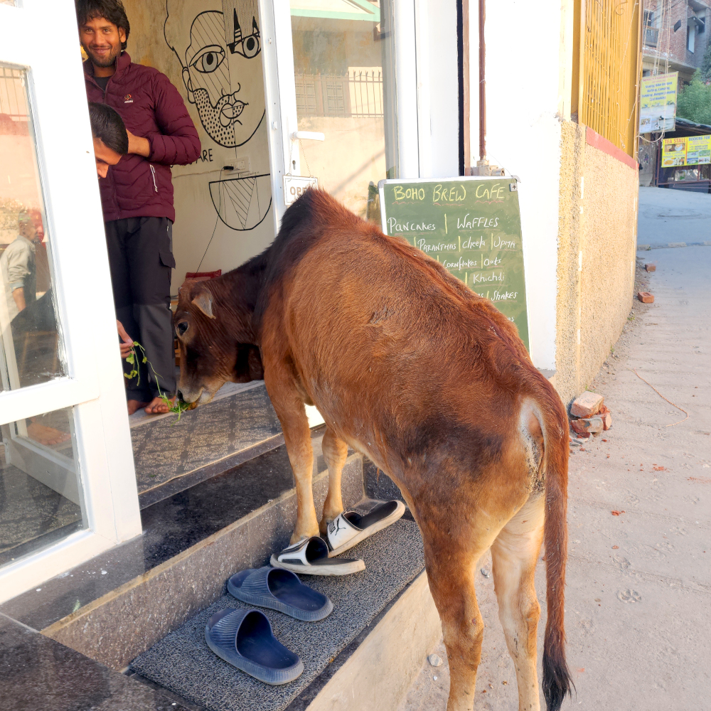 We pass by a monkey hanging out with a dog, and one coffee shop that is currently attending to a curious cow. Another shop on our street that we’re quite enthralled with is a bakery that makes some exquisite sugar-free treats. Our favorite is a chocolate peanut butter ball about the size of a tennis ball. It has become a part of our daily ritual to pick up a couple of these every morning, before they run out. This is one of many intriguing little shops along this hilly narrow street that frequently sees women carrying gigantic bundles of vegetation on their heads, and cows making their deposits wherever they please.