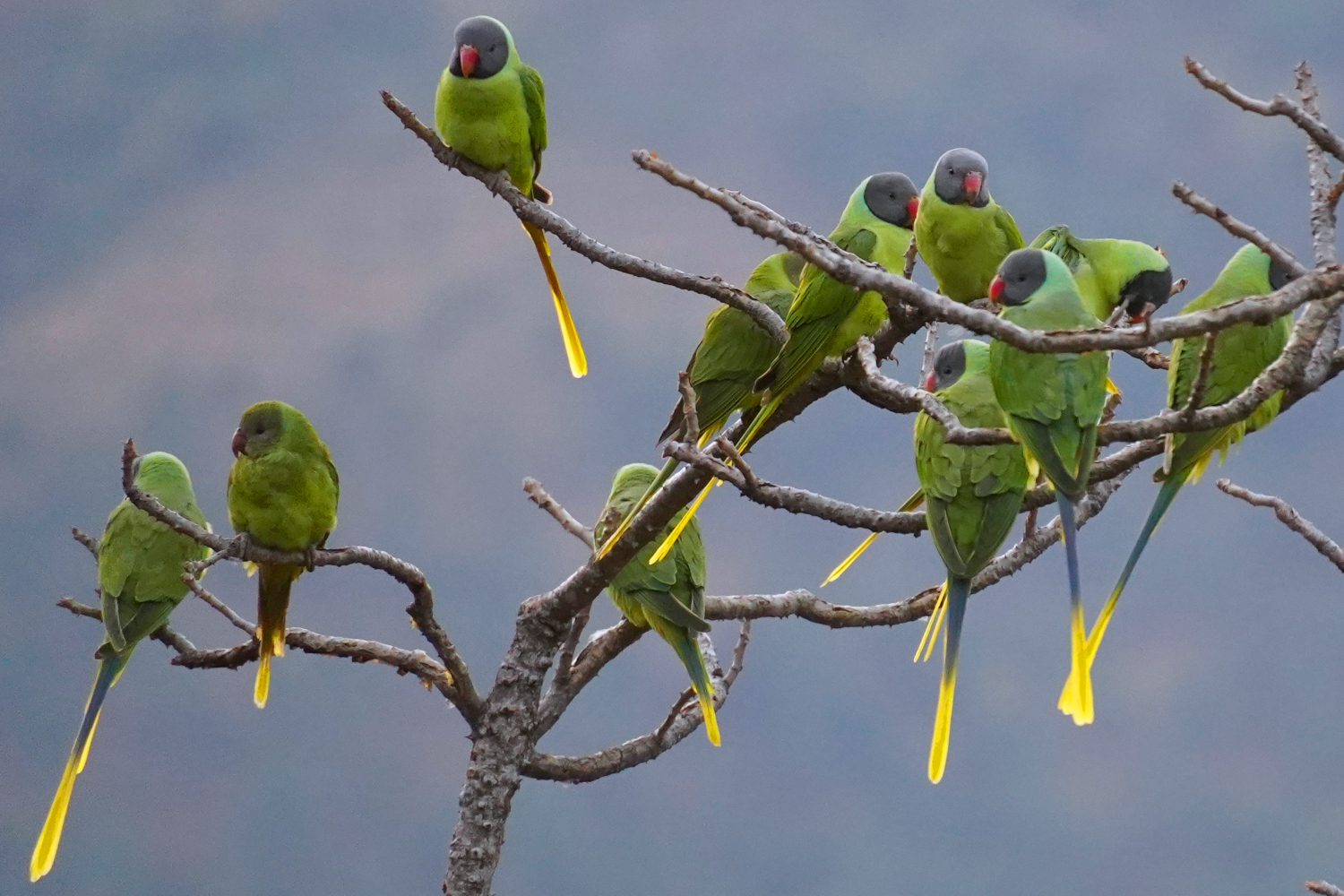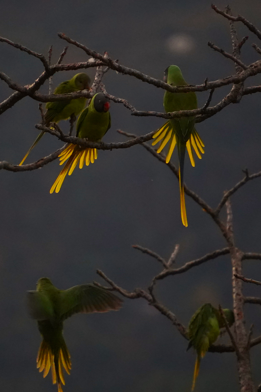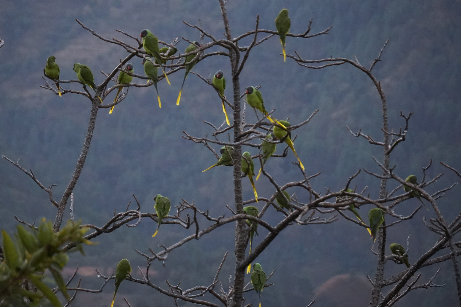 Kimberly, like other volunteers, enjoys doing yoga outside on the sun deck, in front of some truly inspiring scenery. And she’s been going on an absolute rampage with her camera, as there is so much to photograph — from people to cows to vivid scenery to brilliantly colored birds. We spot quite a hullaballoo of the latter in one particular tree during one pre-dawn stroll through the hills.