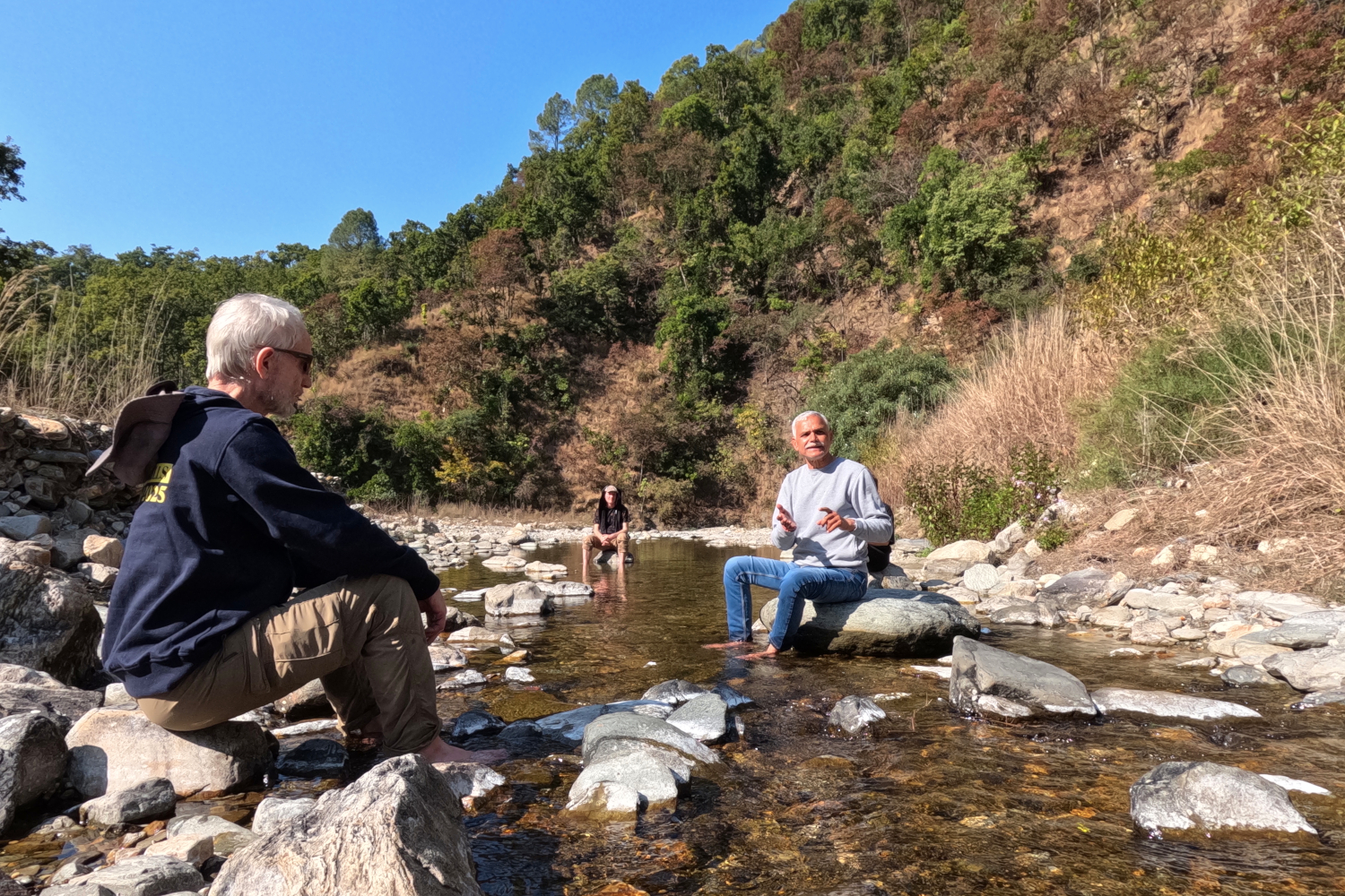 After we all take a break to do our own thing for a while — which for some of us includes following the river around the bend to find a place to create our own facilities. — we all sit on stones by the river’s edge and place our feet into the water, whereupon we indulge in another guided meditation. The element of feet immersed in water adds a whole new level to the experience.