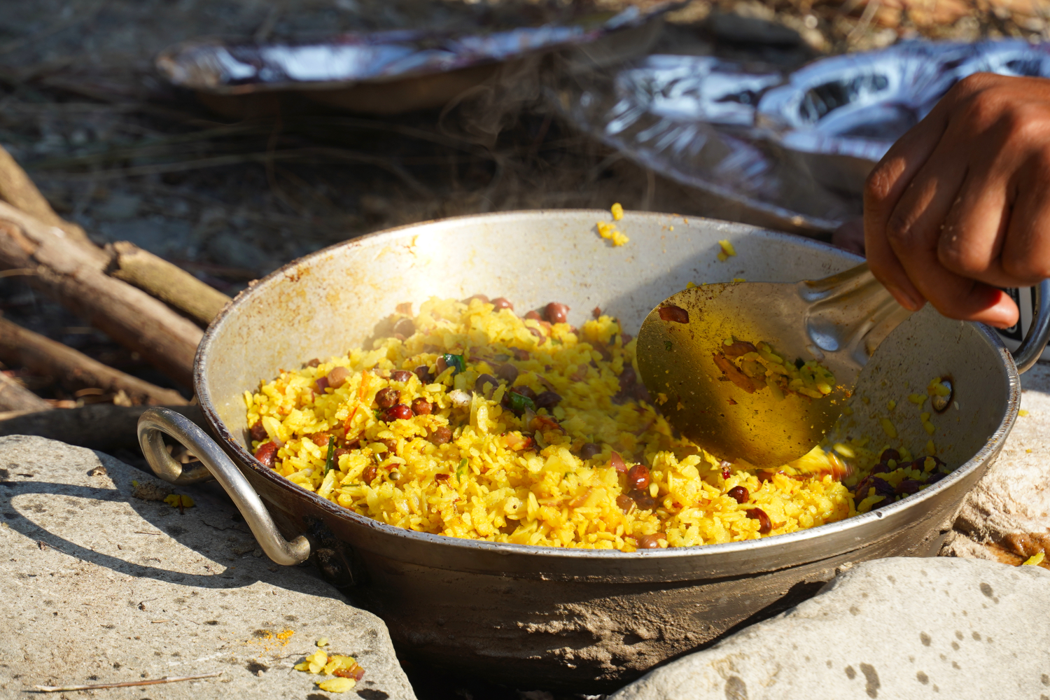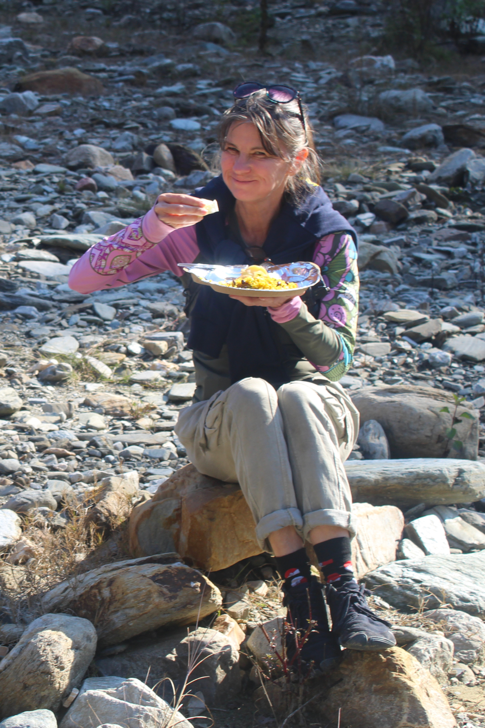 The three assistants who have hauled our collective gear build a fire on the river bank, and prepare a little dish containing garbanzos and peanuts, roasted in spices. It’s served in compostable paper bowls, with a leaf to use as a spoon. Assuming this would be our only lunch, we have about two and a half servings each of these little vessels full. Then we learn that in fact, this is merely a snack, and the guys are now about to proceed putting together the real meal. This is a most savory spicy concoction featuring potatoes and rice, followed up by one of those delectable Indian sweets that do not have equals anywhere else in the galaxy.