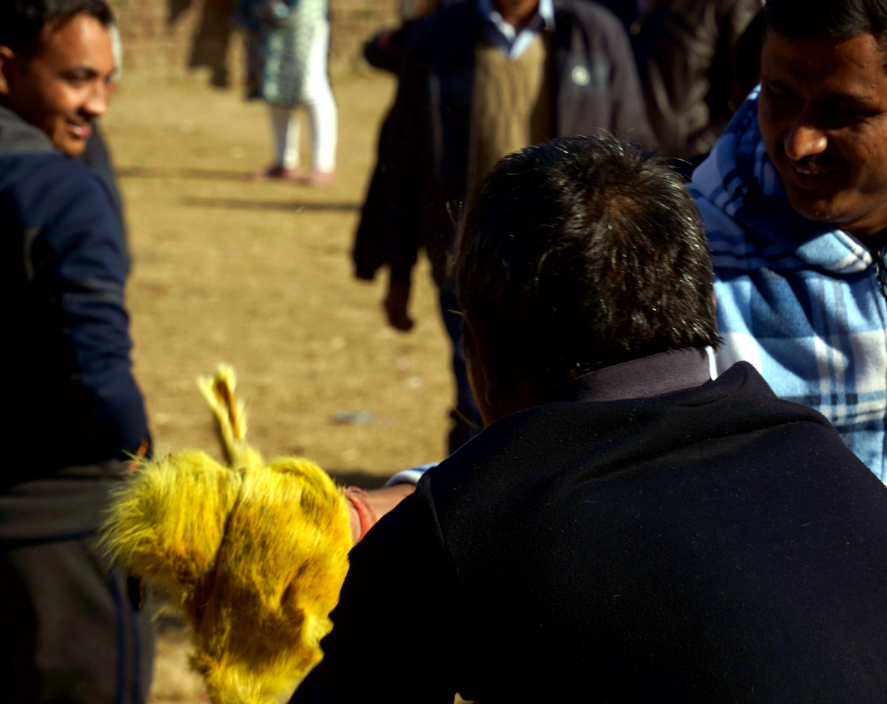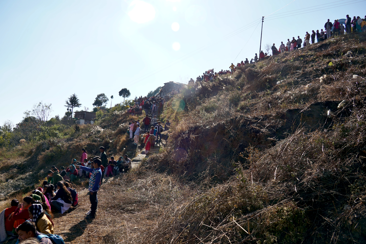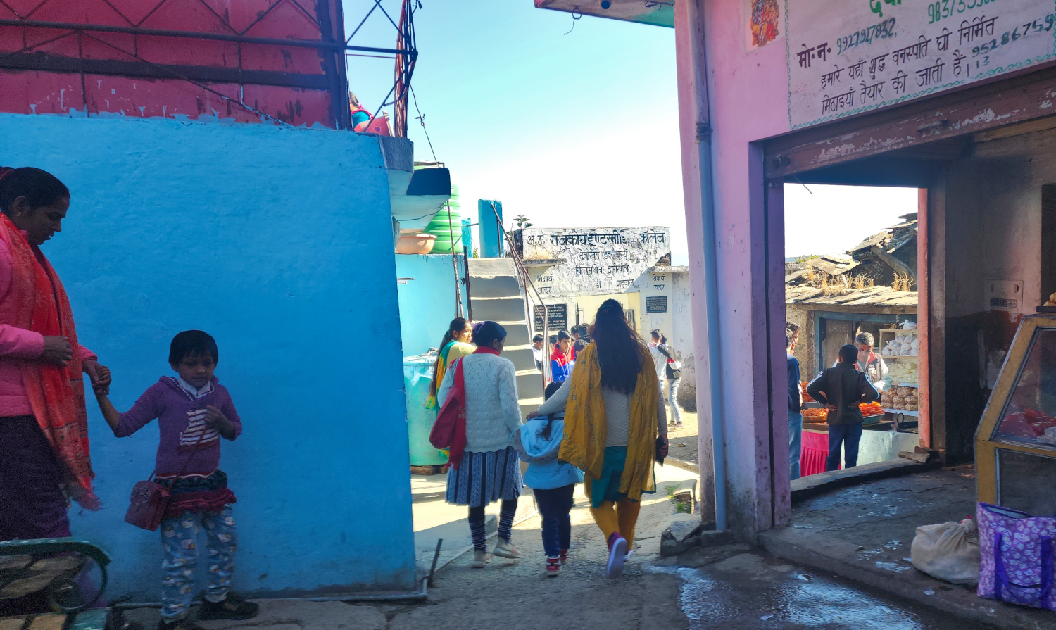 In the morning, we strike out on the long, steep hike up the hill (mountain?), taking only one little shortcut, toward Devikhet. We are accompanied by most of the volunteers who have come, like us, through Workaway, to assist in the village of Shri Timli, which is only a couple of miles down the hill, but which might as well be ten, given the angle of slope we have to negotiate. As soon as we get into town, we almost wonder if it is indeed the same town. Because suddenly it’s been transformed from a snoozing little village to a highly caffeinated jubilee, from a quasi-ghost town with few souls stirring, to a hot spot with folks cluster as thick as Wal-Mart shoppers on Black Friday. (And it keeps getting thicker as the day wears on.)