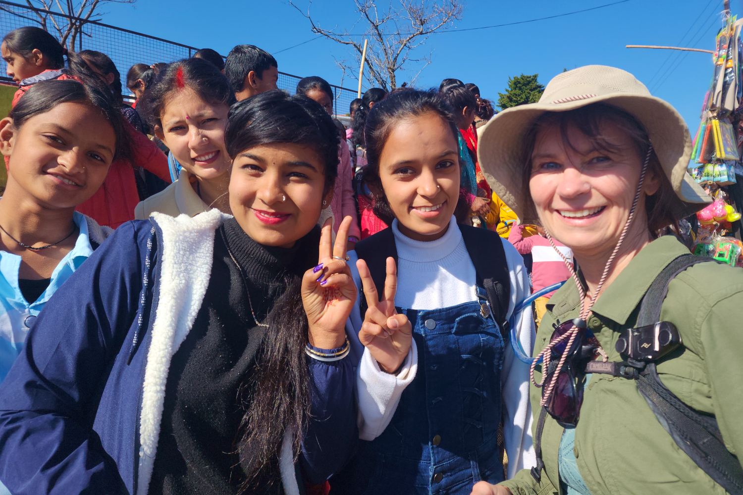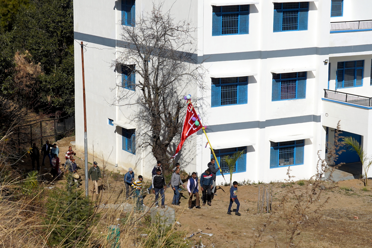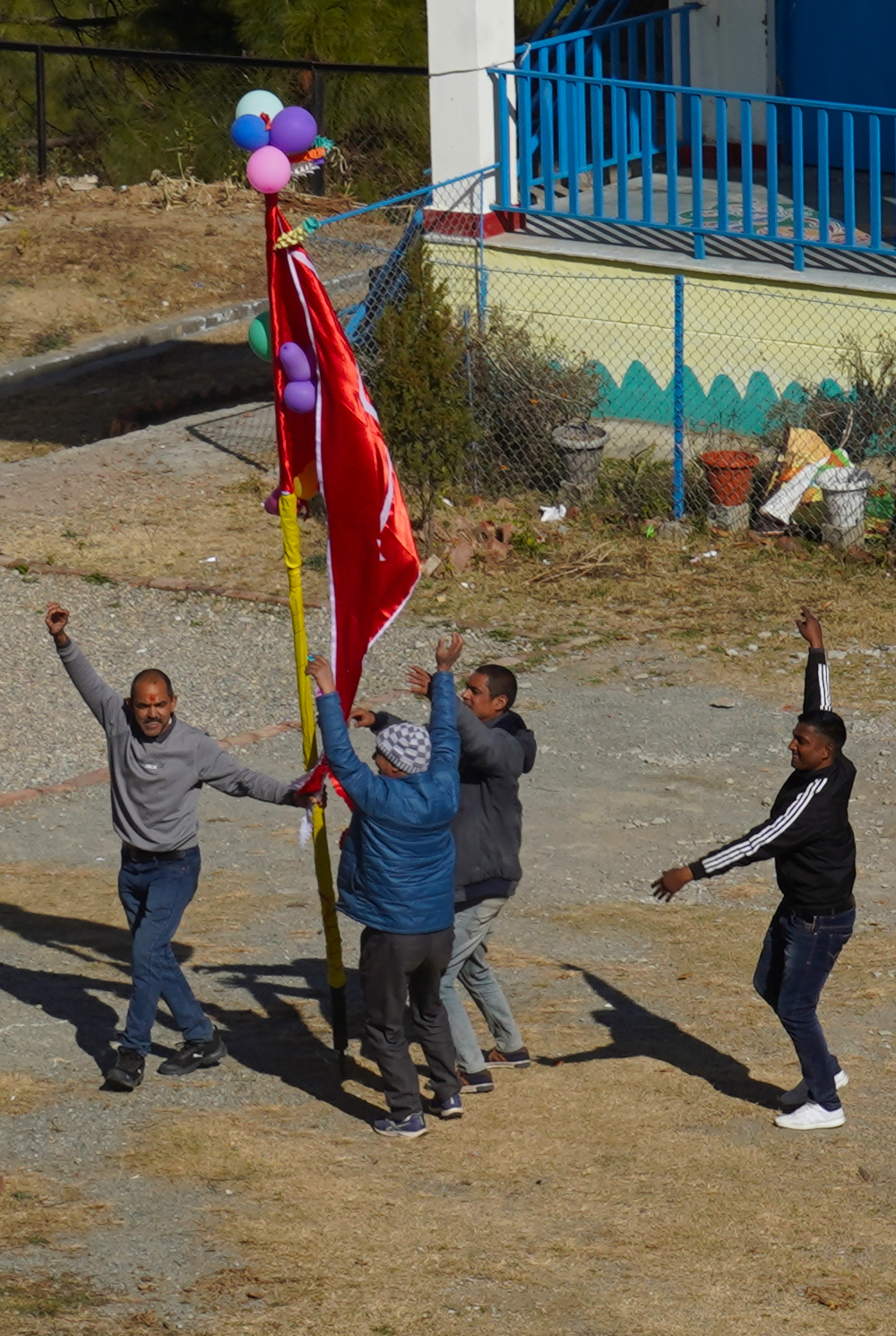 In the morning, we strike out on the long, steep hike up the hill (mountain?), taking only one little shortcut, toward Devikhet. We are accompanied by most of the volunteers who have come, like us, through Workaway, to assist in the village of Shri Timli, which is only a couple of miles down the hill, but which might as well be ten, given the angle of slope we have to negotiate. As soon as we get into town, we almost wonder if it is indeed the same town. Because suddenly it’s been transformed from a snoozing little village to a highly caffeinated jubilee, from a quasi-ghost town with few souls stirring, to a hot spot with folks cluster as thick as Wal-Mart shoppers on Black Friday. (And it keeps getting thicker as the day wears on.)