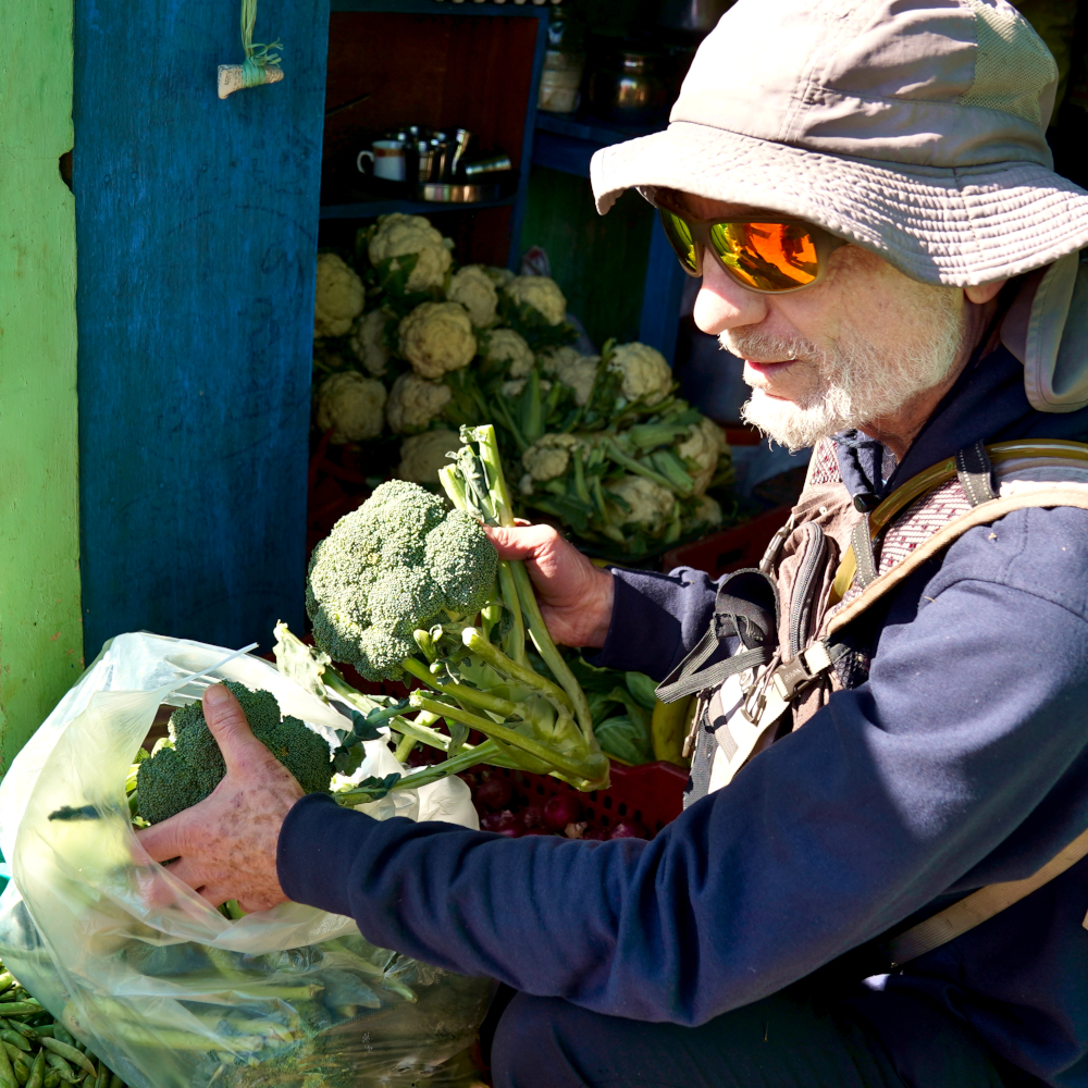 Almost directly across the street is a produce stand, pretty much the only one in town. So we mosey over there to see what they have in stock, and more people came to talk with us, greeting us warmly. The selection is the best we’ve seen yet; there is even, wonder of wonders, broccoli, which has been a scarce commodity around here. So we buy enough produce to fill the bags we carry, even knowing that we’ll have to haul it around for the rest of the day.