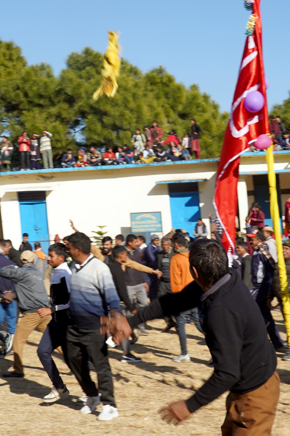 The competitors are so scrambled together, with body parts so intertwined like a haystack, that it’s really difficult to get a glimpse of the yellow prize, or see exactly what’s going on or which side is winning — if indeed victory is really going to be a thing at all.. Dennis creeps up toward the tangle of bodies, and manages to get some fair video footage, fearing all the while that his phone may get knocked out of his hand and lost in the ruckus.. Then at one point the players, for whatever reason, (we have no idea exactly how this game is supposed to be played) abruptly clamber to their feet, throw the “ball” over his head, and begin rushing after it — right in his direction. So he makes an executive decision that the time has come to beat a hasty retreat.