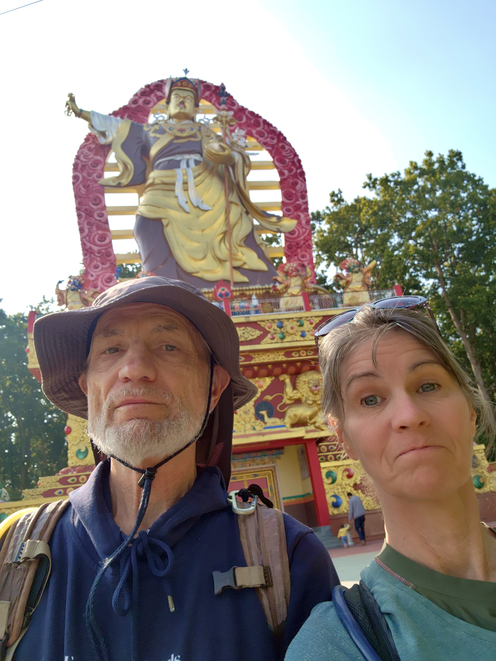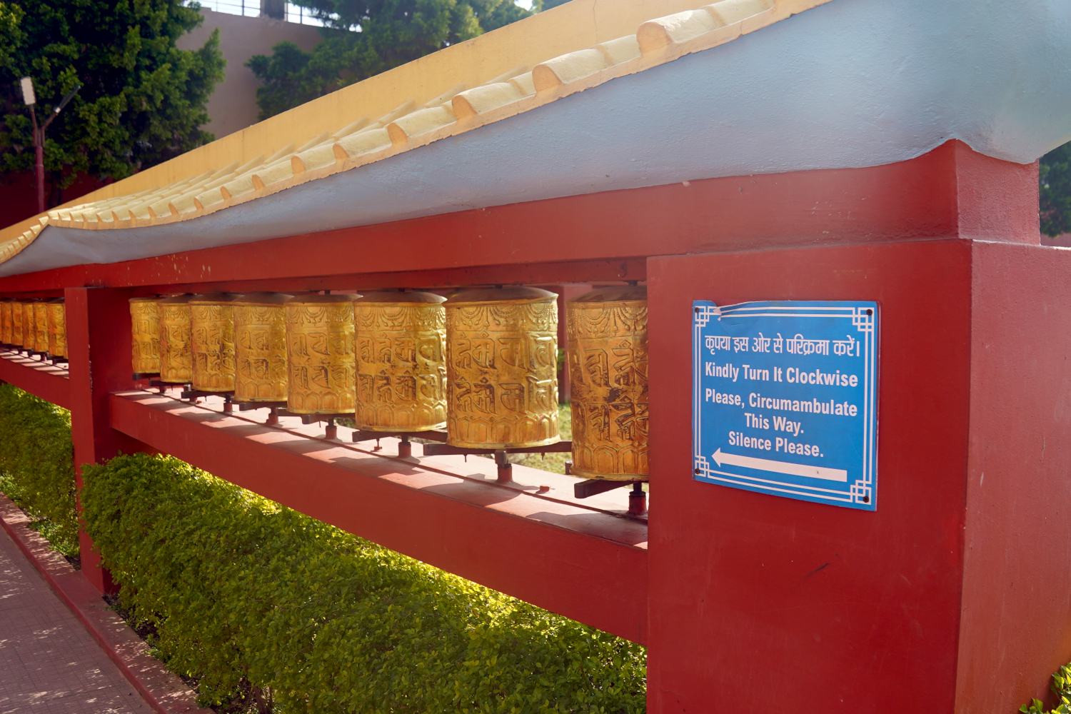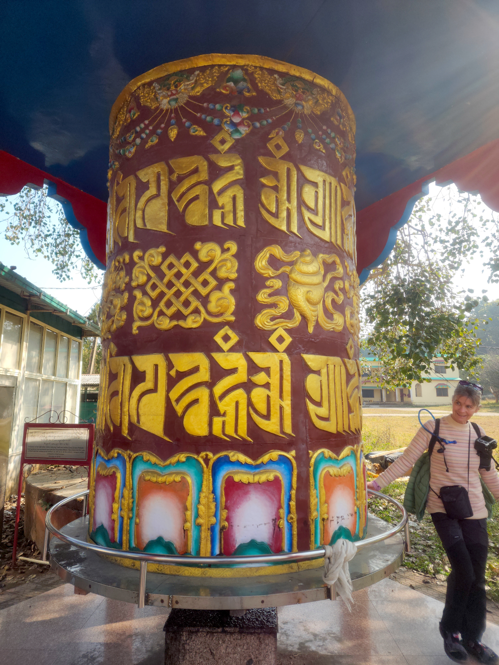 Strolling around the grounds, we encounter some rather head-scratching signs, including one warning that public display of affection is prohibited, and another forbidding the consumption of peanuts. And if you get caught making out under the trees with a jar of Planters in hand, you’re really in deep doo-doo. There are also prayer wheels, or more precisely prayer cylinders, of various sizes. They have mantras and other texts inscribed on them, so you can “recite” them by giving them a spin if you don’t want to get vocally involved.