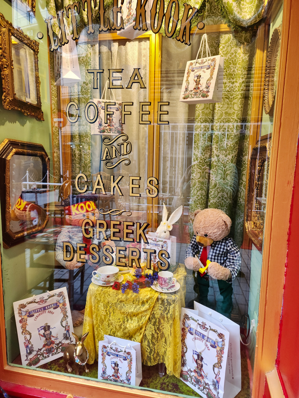 In the course of getting from point Alpha to point Beta, we pass through an area called Little Kook, which is a storybook neighborhood (and by “neighborhood”, we mean a block or so) featuring quaint tea rooms that look as if they’d been snatched from the pages of Winnie-the-Pooh. We contemplate returning for tea the following day, since it will just happen to be Valentine’s Day. But upon investigating we find that the cuisine is so abominable, not at all up to the decor in our estimation, that we nix the notion.