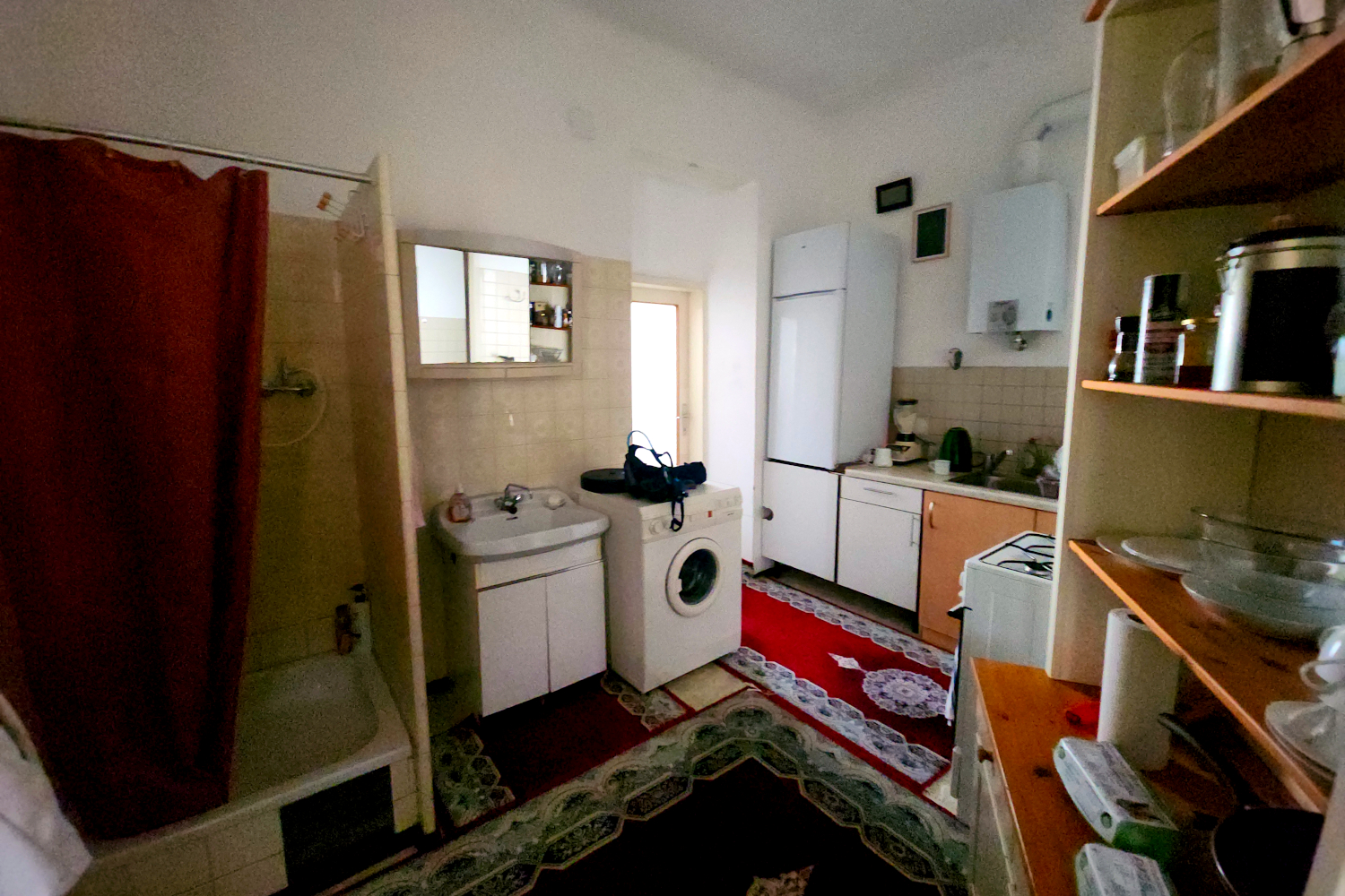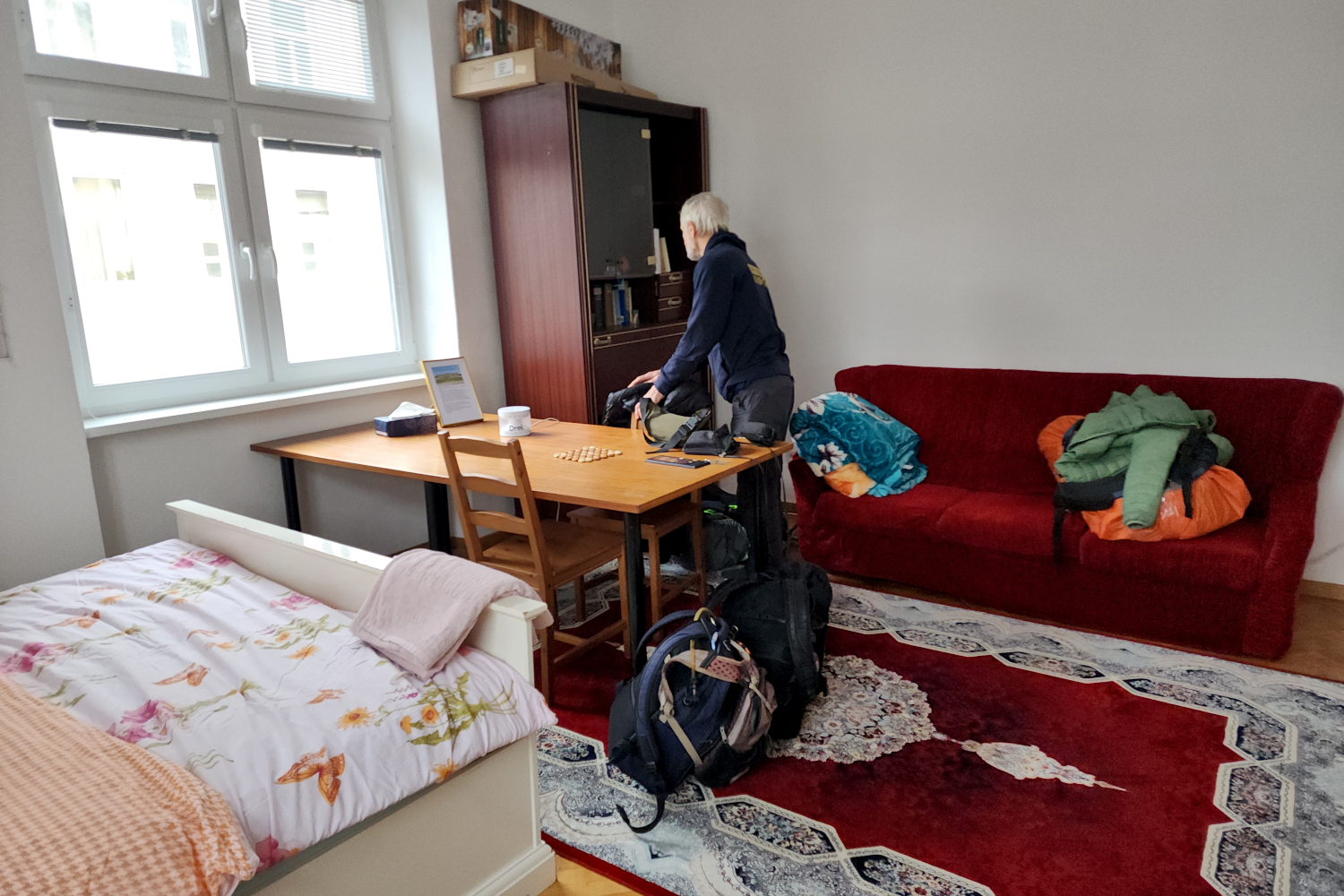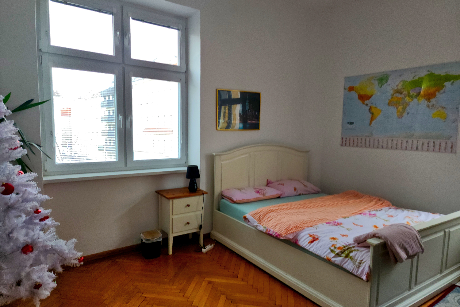 The apartment is on the third floor (which Europeans and Asians call the second floor) of a classic old building with hardwood floors and wooden doors as heavy as railroad ties. We’ll be staying in a large, comfortable room with a Christmas tree still in place (white with red trim) and an electric heater that makes a humming noise, but you get used to it. To get to the kitchen, bathroom or shower, we have to pass through a corner of the host’s bedroom, but he assures us it’s never been a problem, and it isn’t. He’s gone much of the time, and even when he’s there, he’s absorbed in doing his own thing. The oddest thing is that the shower is located in the kitchen — it’s just a little cubicle with a curtain. But again, no problem.