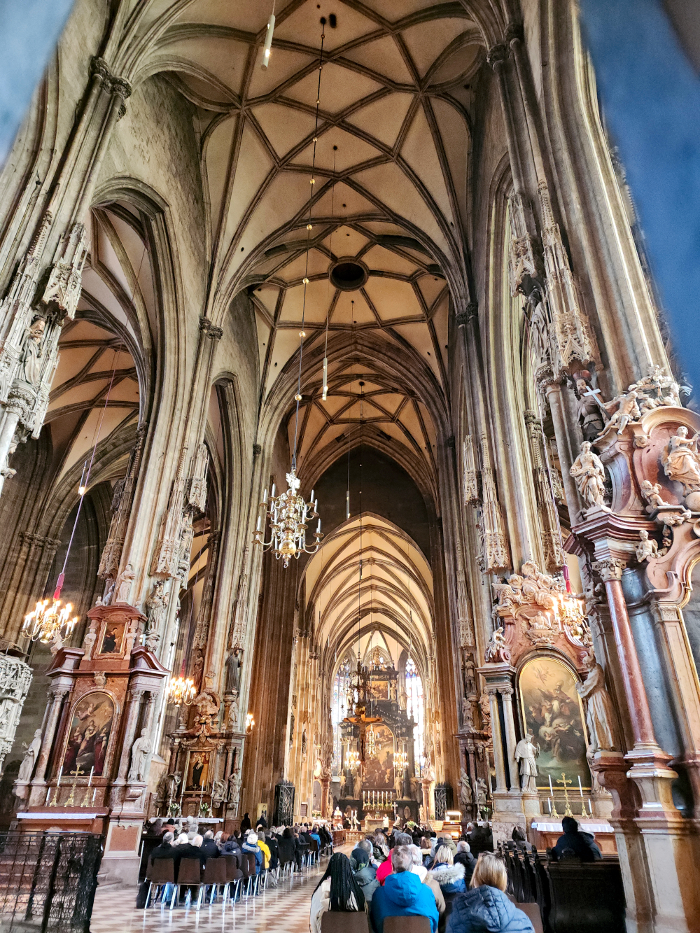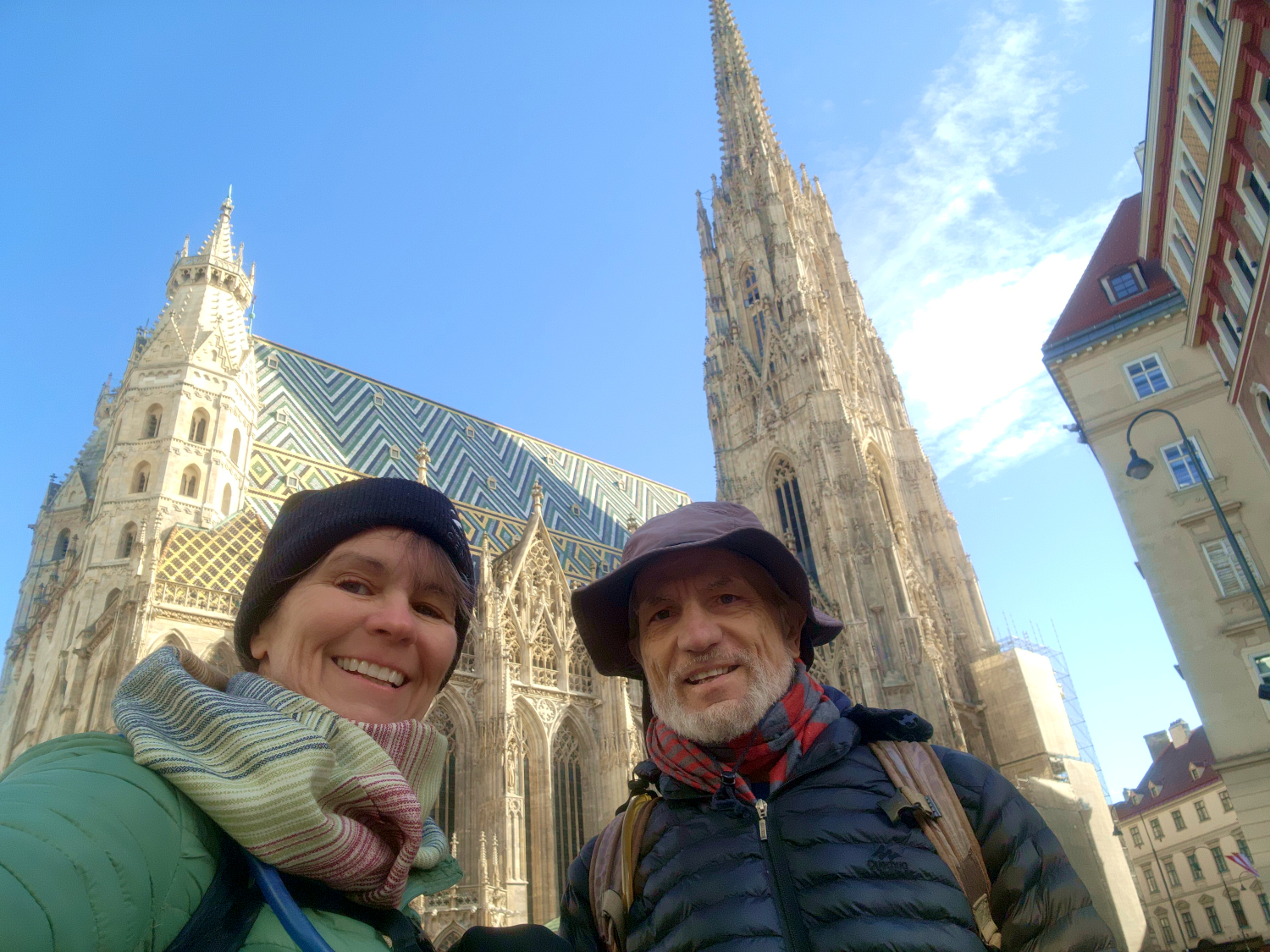 Fortunately, the restaurants and cafes are open on Sunday. And that includes Sacher Cafe, home of the legendary Sachertorte, the chocolate cake at the end of our rainbow. We take a Metro to Stephansplatz. the central square of Vienna. The centerpiece, of course, is St. Stephen’s Cathedral, an imposing Medieval/ Renaissance church constructed in stages between the years 1137 and 1578. A skyscraper before skyscrapers were a thing, the steeple towers over the urban skyline at a height of 448 feet, making it one of the very tallest churches in the world. We peek inside, largely just to warm up, and there is a mass in progress. We’ll come back and examine the interior more closely later.