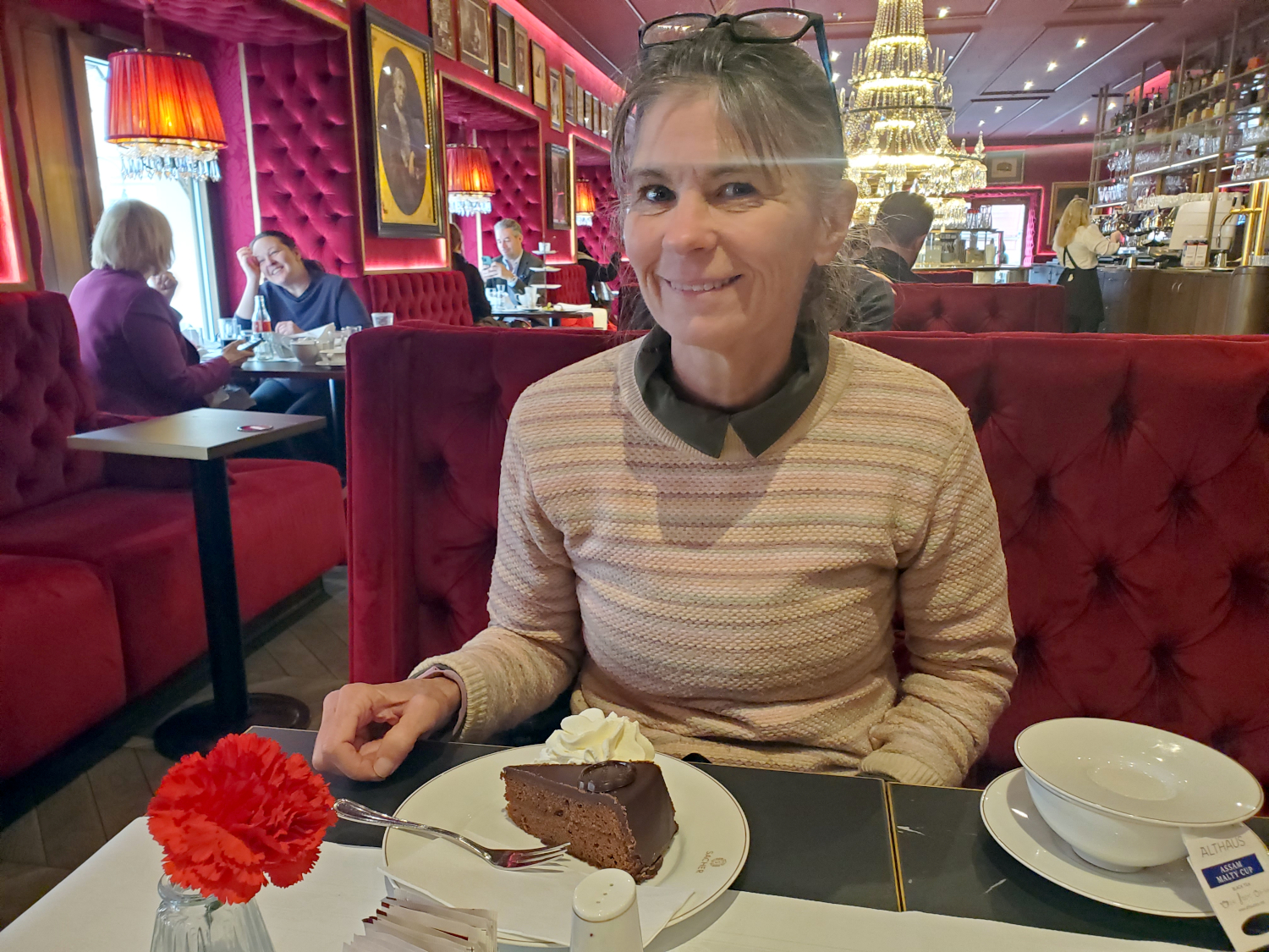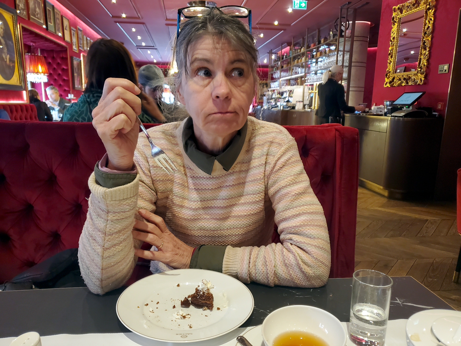 Then we order our torte, and when it arrives, the rest of the world fades away. It ain’t cheap: about 10 euros per wedge of cake, and another 7.5 euros for a cup of tea to keep it company. But you’re not just paying for cake and tea: you’re buying an experience — and a slice of history.
