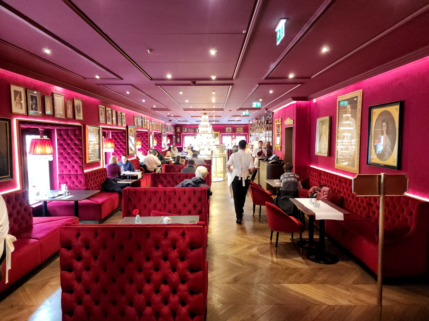 You wouldn’t be wrong if you deduced that after serving this exquisitely elegant treat to the public for several generations, the word has gotten out. There is generally a line outside the door of the cafe, and today, it’s a wait of about 20 minutes in the nippy air outside and the foyer, until we are ushered into the upstairs dining area, resembling a smoking and brandy parlor from the Gay Nineties, with its plush red upholstery, white marble tabletops, quaint portraits and paintings on the walls, and crystalline lighting fixtures.