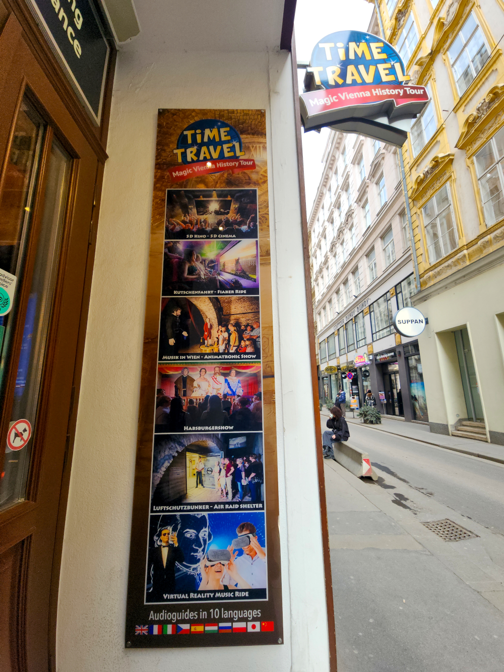 Having sated our appetites for confectionary indulgence (at least for the time) we opt to try out another tourist draw before heading back home. This one is called Time Travel Vienna, which bills itself as a “5-D” immersive experience. We suspect that it’s probably pure kitsch, but we figure it’s worth a shot; and we feel somewhat obligated to investigate it, since our son Zephyr works for a related type of venue back in the States.
