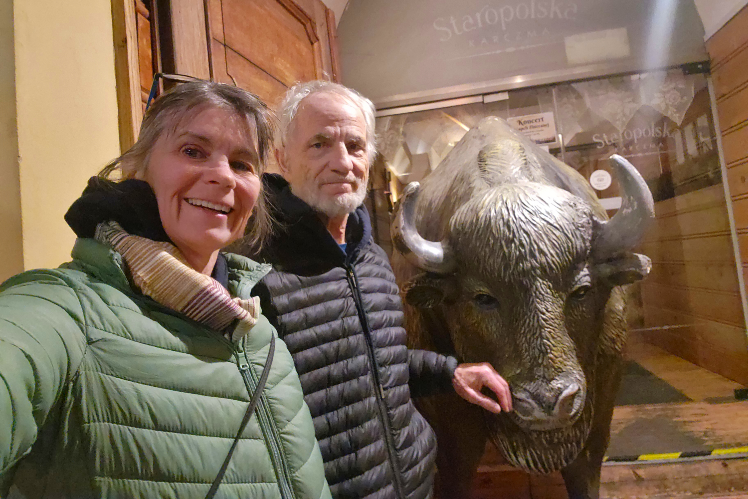 Even after we have the cash in hand, and the groceries in our larder, we decide that we want to have dinner out. Because we’ve been itching to return to a serendipitous dining discovery we made on our first visit here, a little restaurant called Staropolska (“Old Poland”). At first sight we’d been skeptical because it has a statue of a bull outside, and if that was a portent of what was served inside, it didn’t bode well for us non-bovine consumers. But we gave it a shot anyway, and were delighted with the outcome: the best potato pierogi (covered with caramelized onions) and latkes (crisp and smothered in a scrumptious portabella gravy) we’d ever salivated over, at an extremely reasonable price.