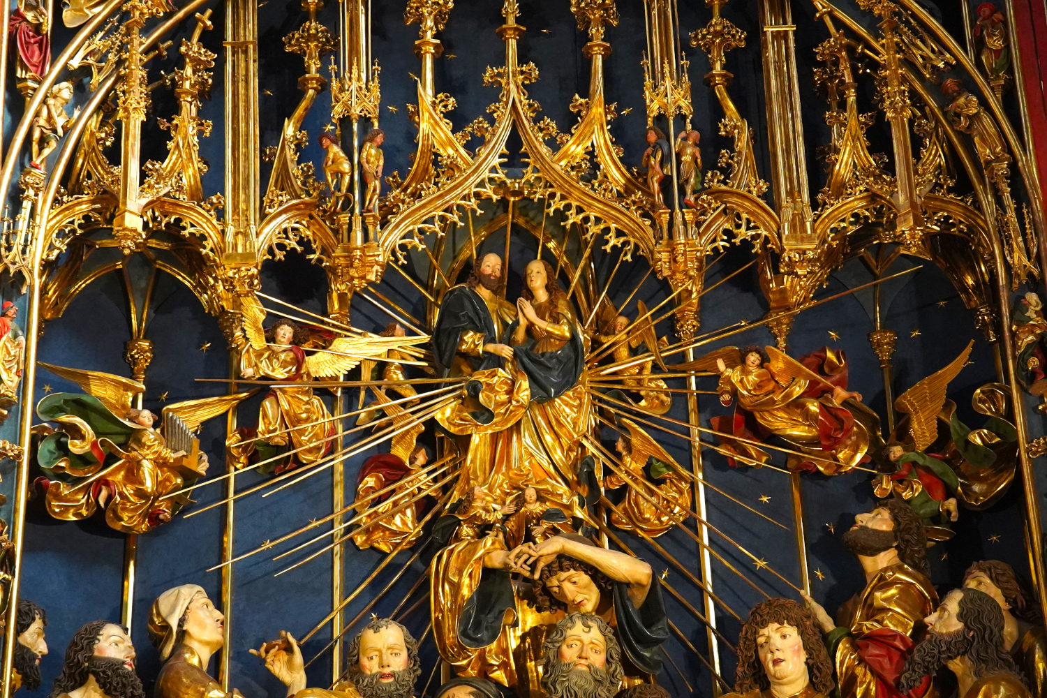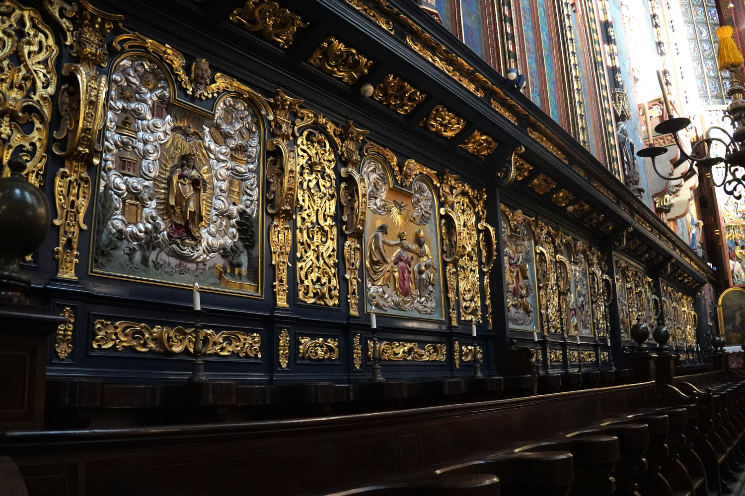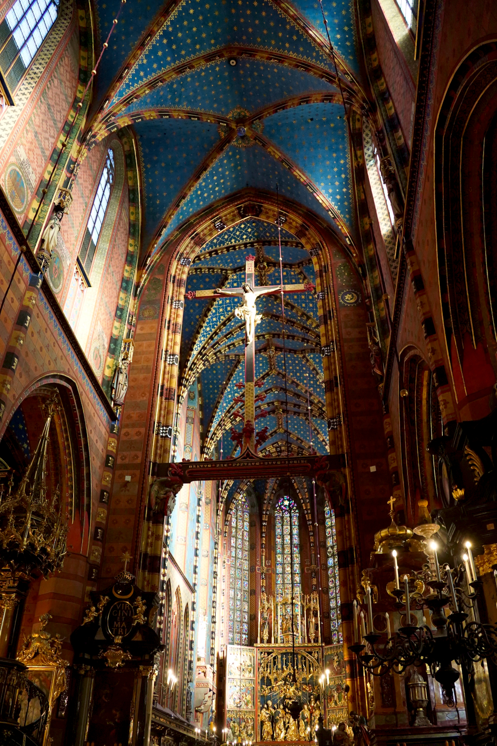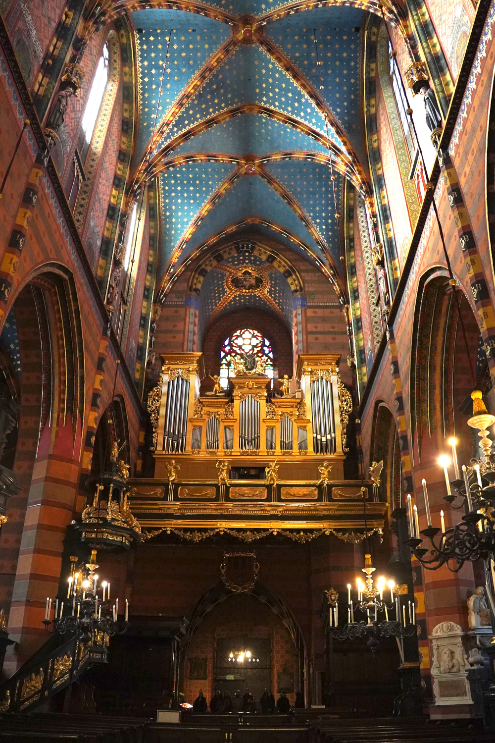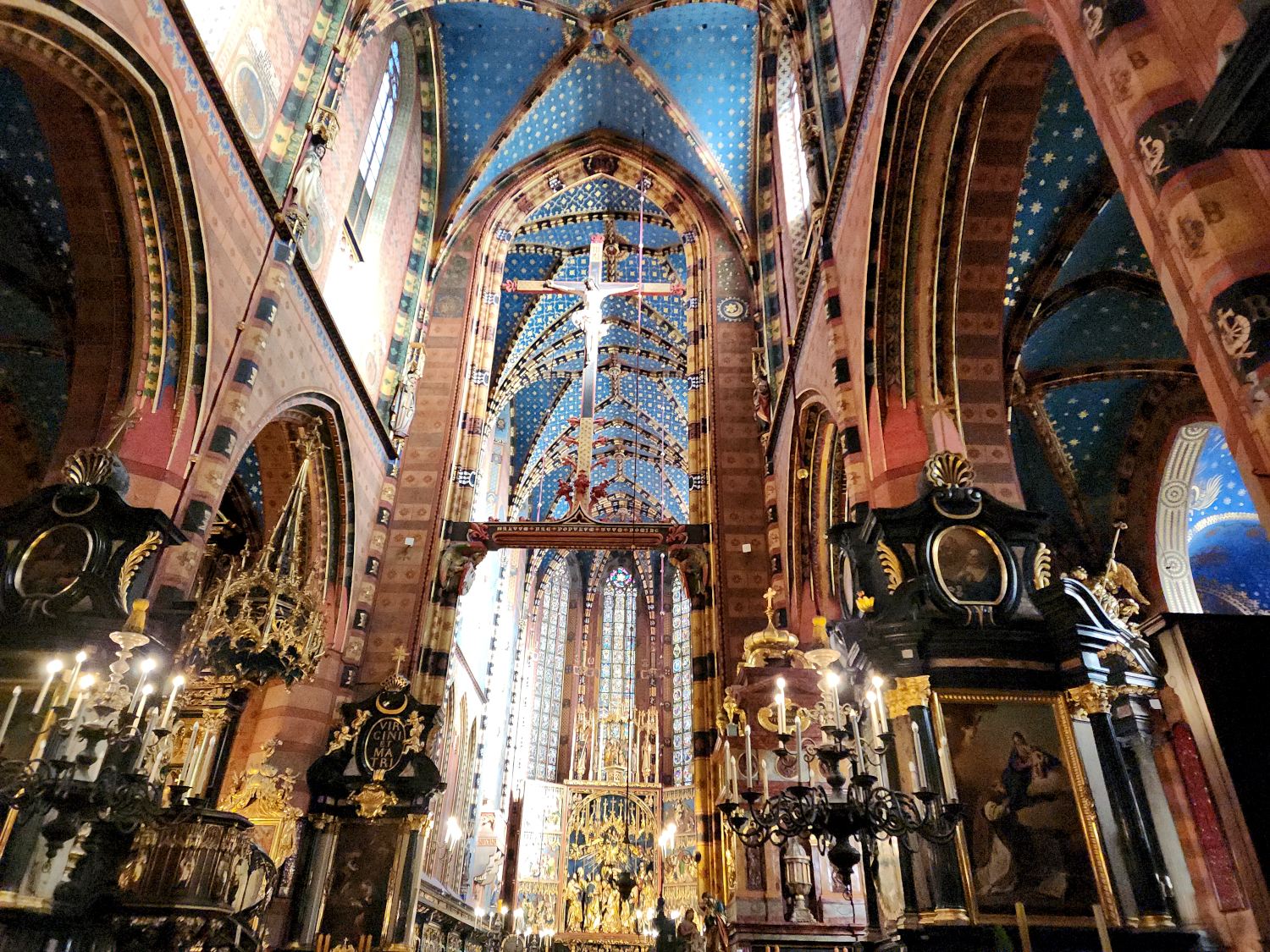 The next day, our target is the crown jewel of Old Town, St. Mary’s Basilica. A distinctive sight on the skyline of this relatively non-vertical medieval quarter, St. Mary’s looms large with its pair of oddly mismatched towers. The first time we ever set foot in Krakow, on a foggy evening, we saw those towers rising up to welcome us, and it was a sight we’ll never forget.