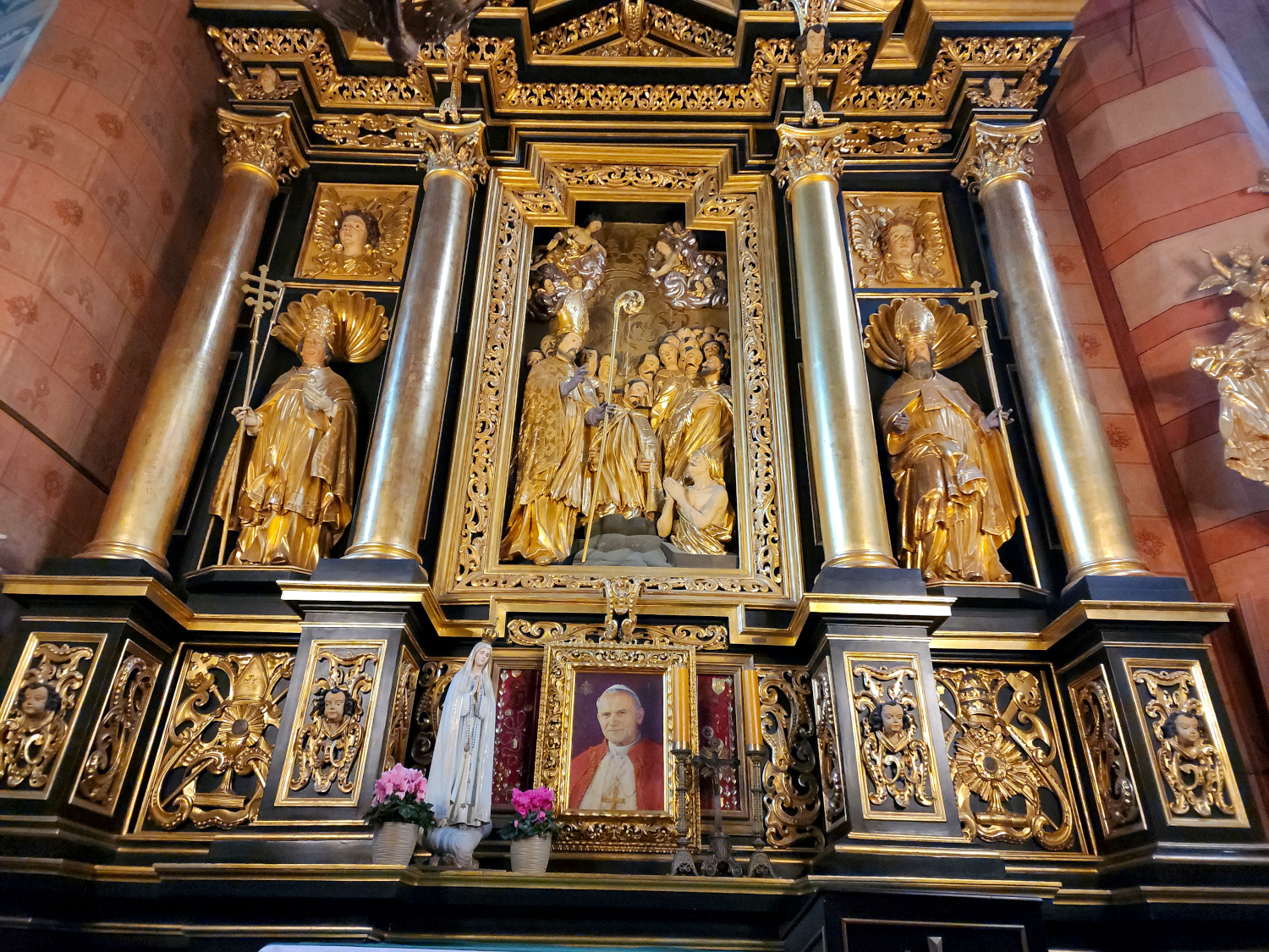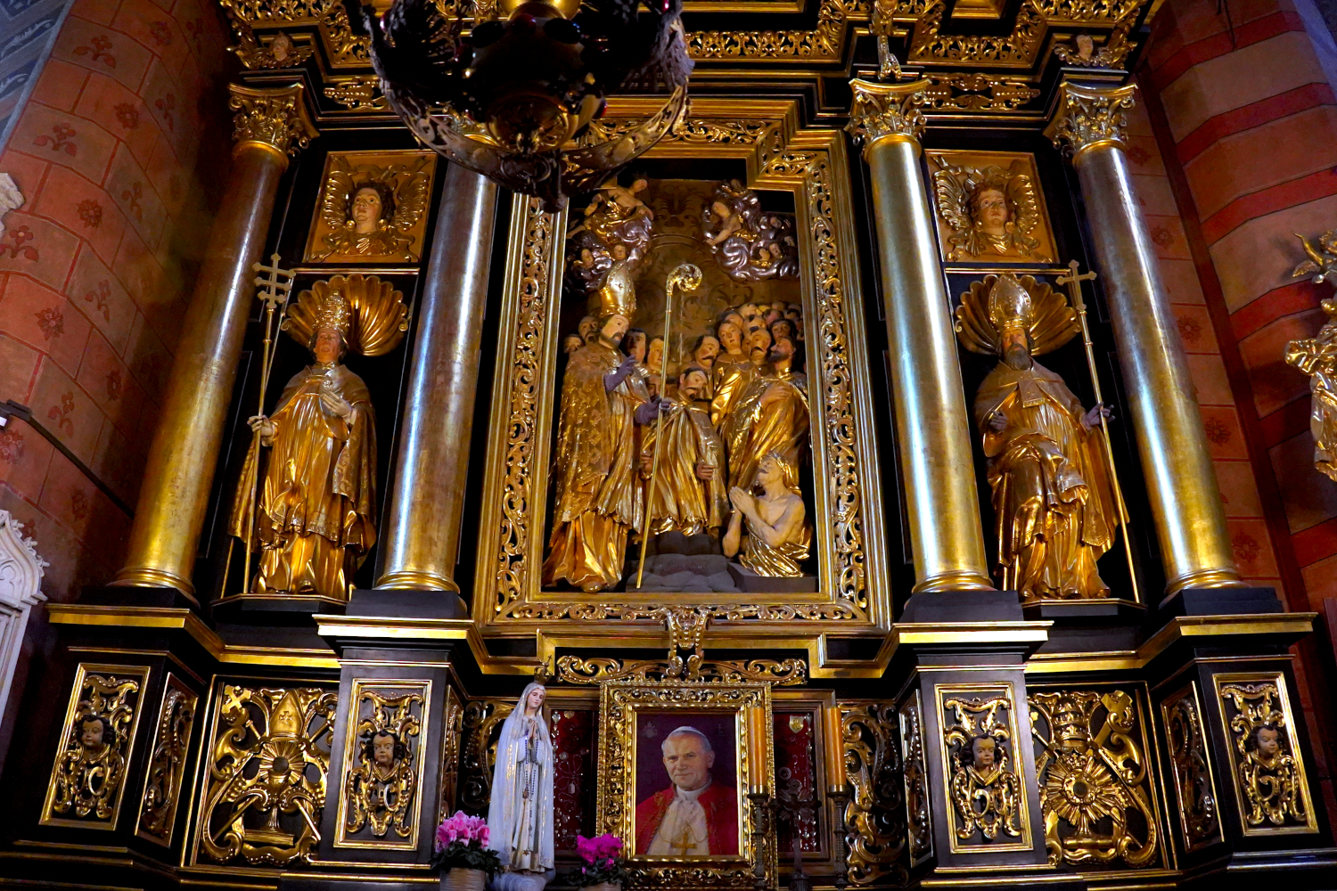 As a consolation prize, we mosey up the hill to Wawel Castle and Wawel Cathedral. The castle, constructed in the 12th and 13th centuries (long after the dragon was slain by whomever), was the official residence of the Polish king for many centuries, but now houses a museum. Next to it is Wawel Cathedral, where kings were coronated. The current cathedral wasn’t built until the 14th Century, making it the new kid on the block; but it sits (or stands, or whatever a cathedral does) on the same site as two previous churches bearing the same name, dating back about a millennium. It was here that local boy Karol Wojtyla, later known as Pope John Paul II, delivered his first mass. (We just might be crossing paths with him again.)