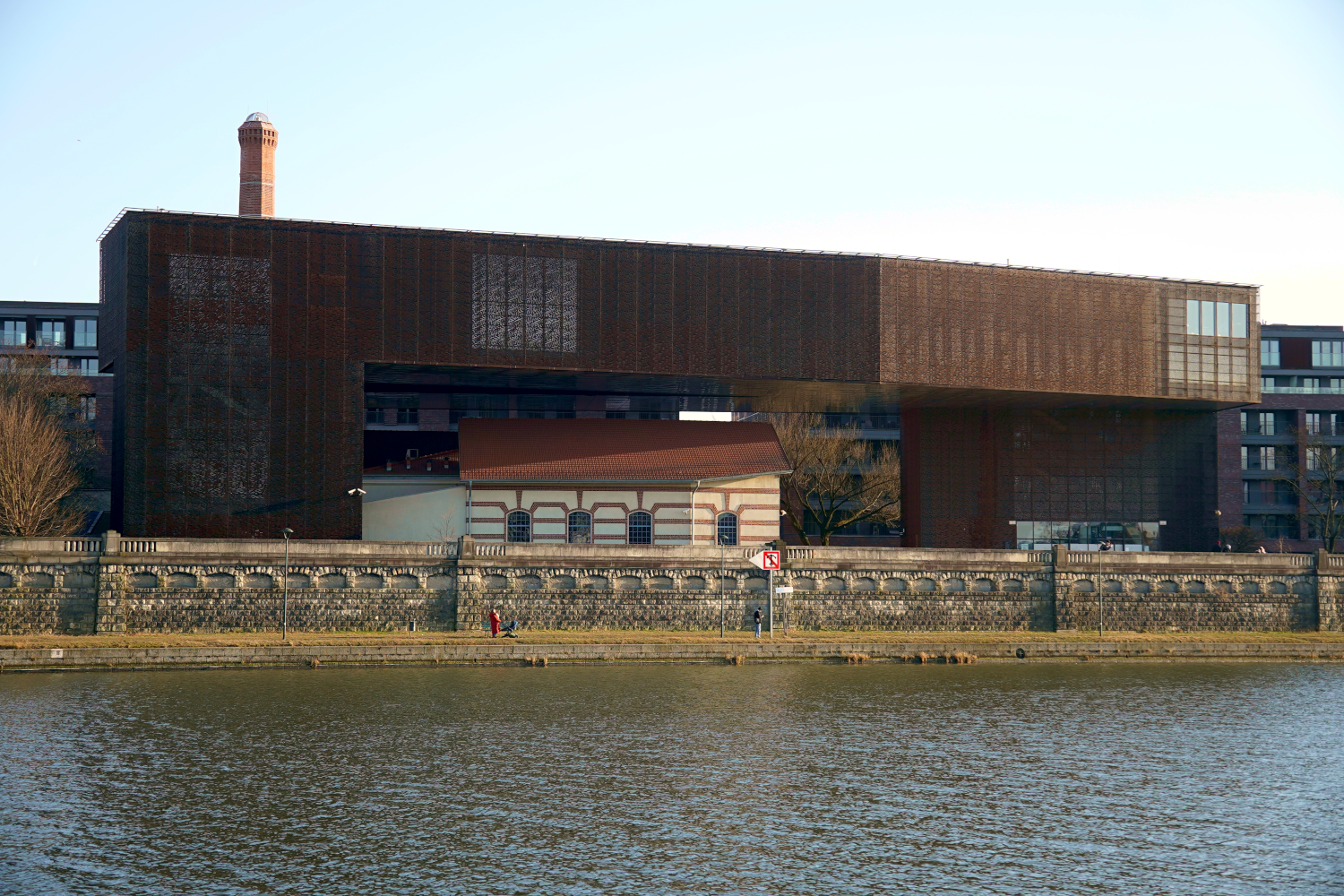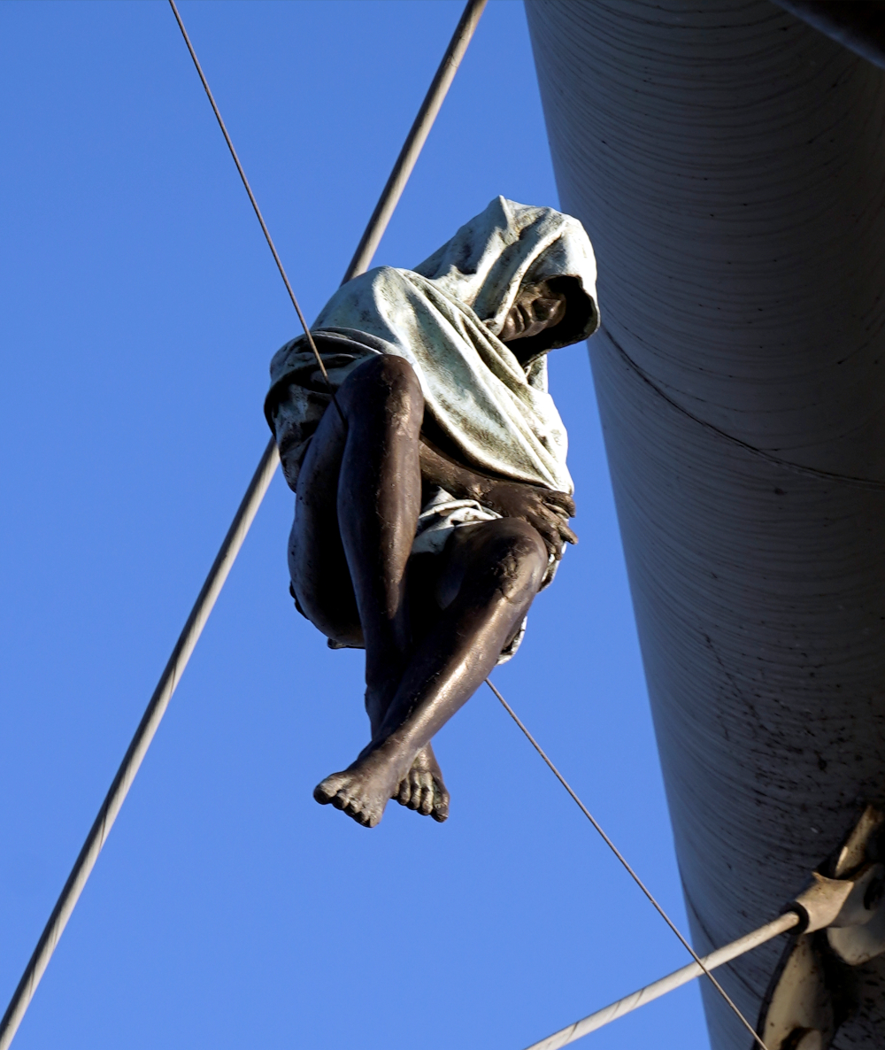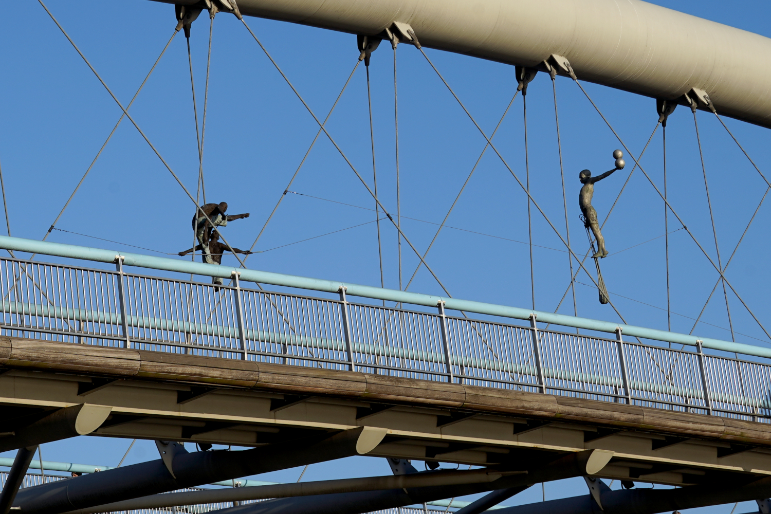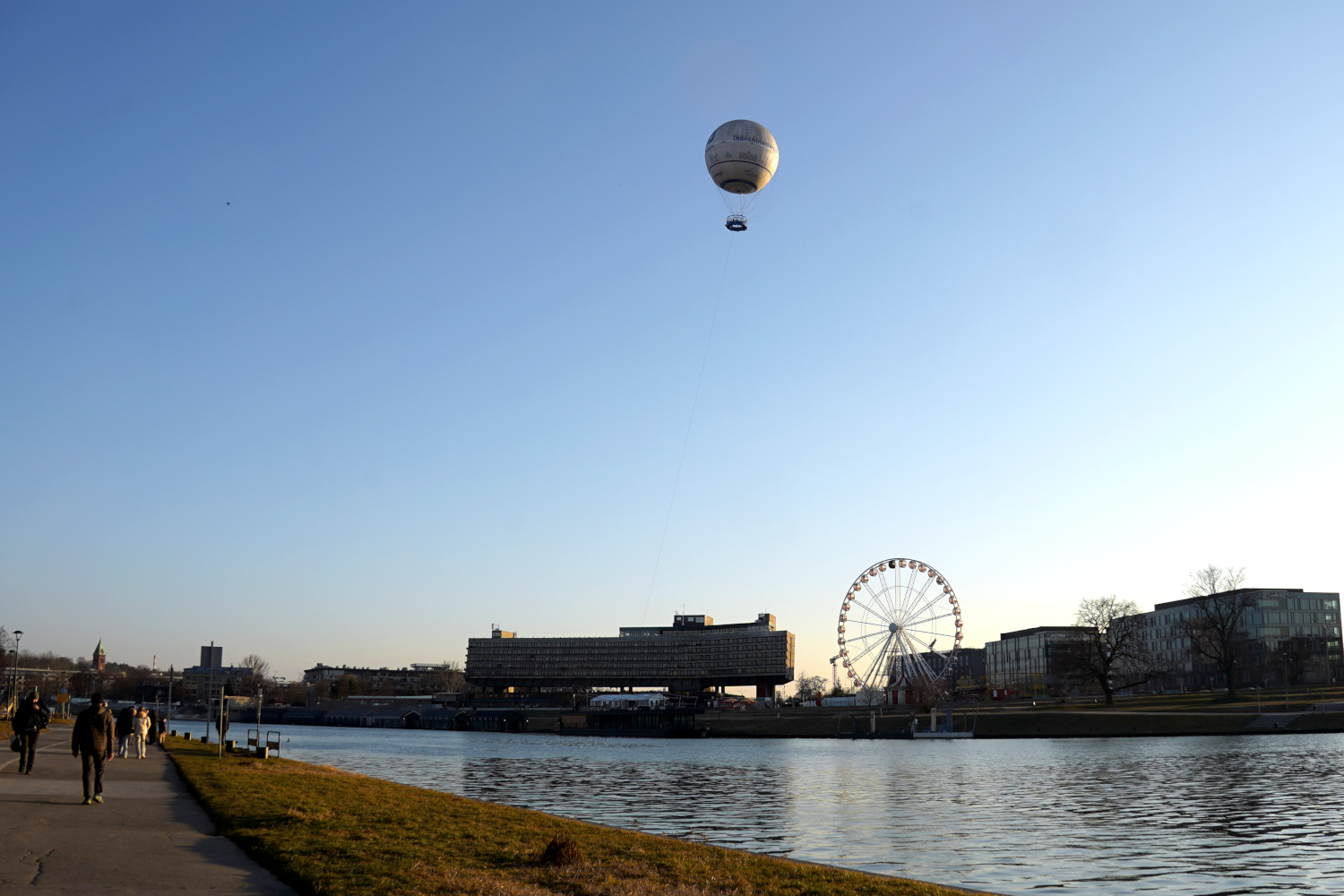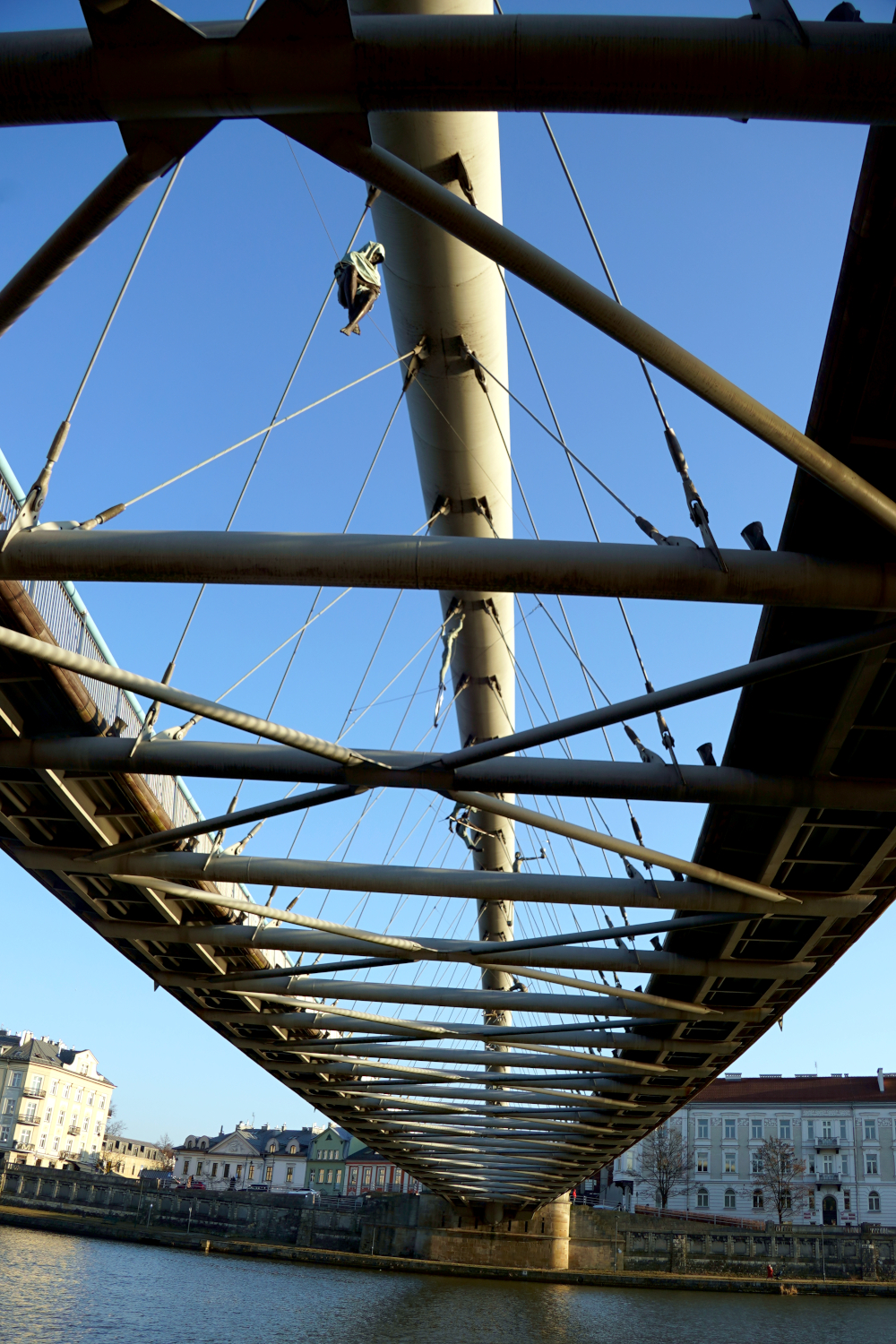On the way, we pass a bridge over the Vistula with a curious art installation that is easy to overlook, because you have to look over your head. These are on the Father Bernatek Footbridge, which features metal acrobatic sculptures by artist Jerzy Kedziora. They are balancing on wires and performing other gravity-defying stunts that are much easier to do when you’re permanently moored by steel cable.