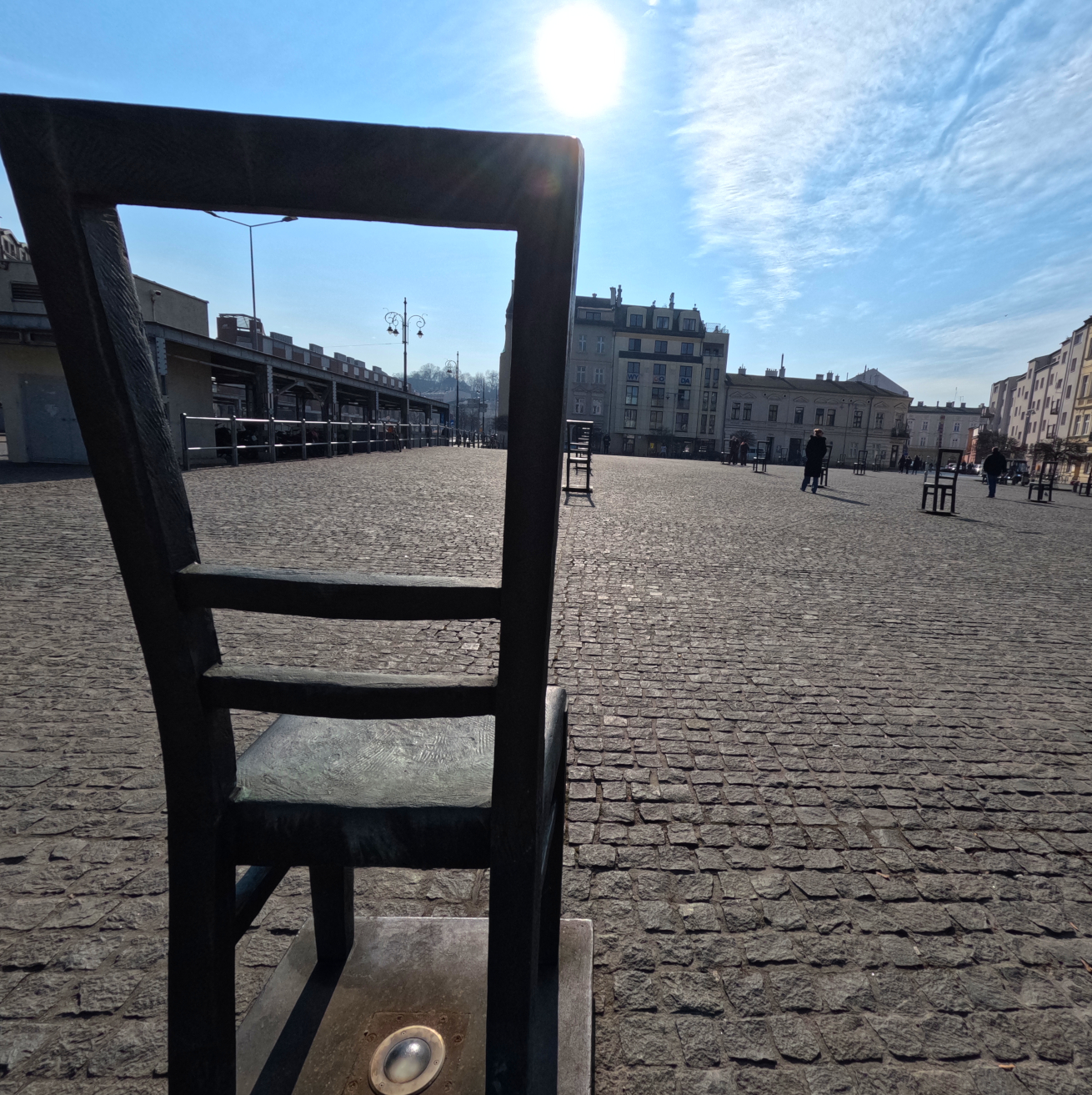 More conspicuously, the square is the location of the Empty Chairs Memorial — which brings to mind a similar memorial in Oklahoma City. This installation, unveiled in 2005, consists of 70 bronze chairs, each representing approximately 1000 local victims of the holocaust. A chair is an especially appropriate emblem, since the square is where the Jewish detainees in the ghetto discarded their furniture. At dusk, the plaza is illuminated with soft lighting, causing the chairs to cast appropriately eerie shadows.