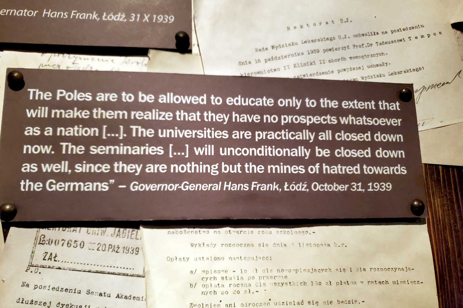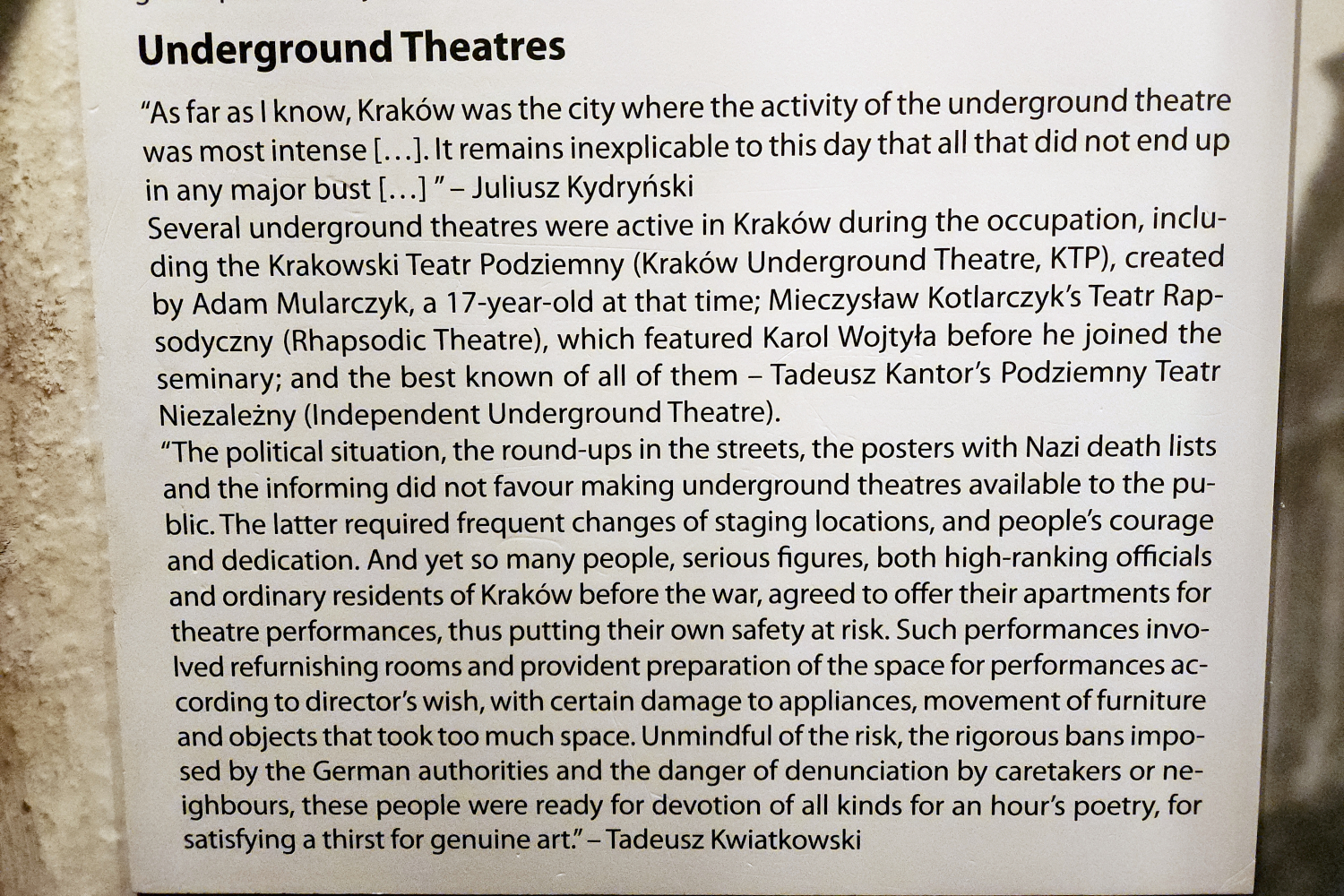 Amid all the grim reminders, the museum also offers a few mementos of joy, hope, and defiance in the face of brutalization. There are promotional materials for a circus that came to town during the height of the occupation, And relics of the “theatre underground” that operated — as former theatre creatures ourselves, the very concept of taking theatre underground and using it to thumb your nose at oppressive authority sounds just positively delicious. Although these individuals operated at the risk of their lives.
