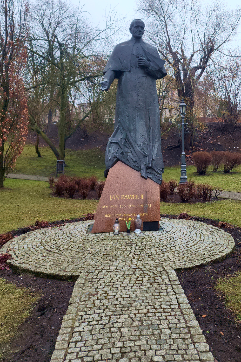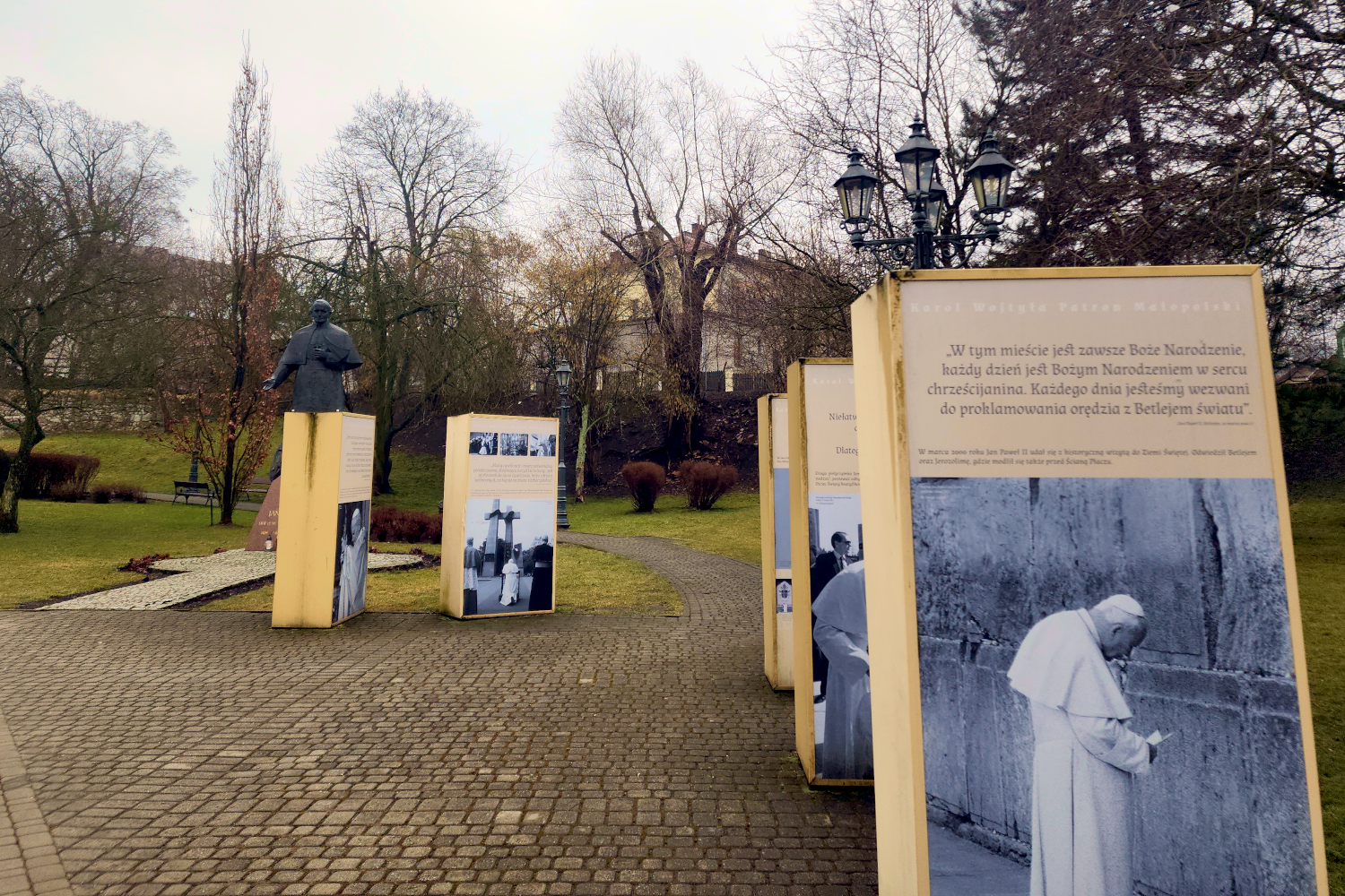 The signs we are supposed to follow are confusing; we have to go across the street, then across a big plaza, past some displays honoring Pope John Paul II (who was a product of Krakow), until we finally locate the entrance to a lobby where we are told to sit and wait. There are just a handful of others waiting for this tour, and eventually the full contingent will reach only about a dozen — not nearly as many as took the touristy tour, the wimps.
