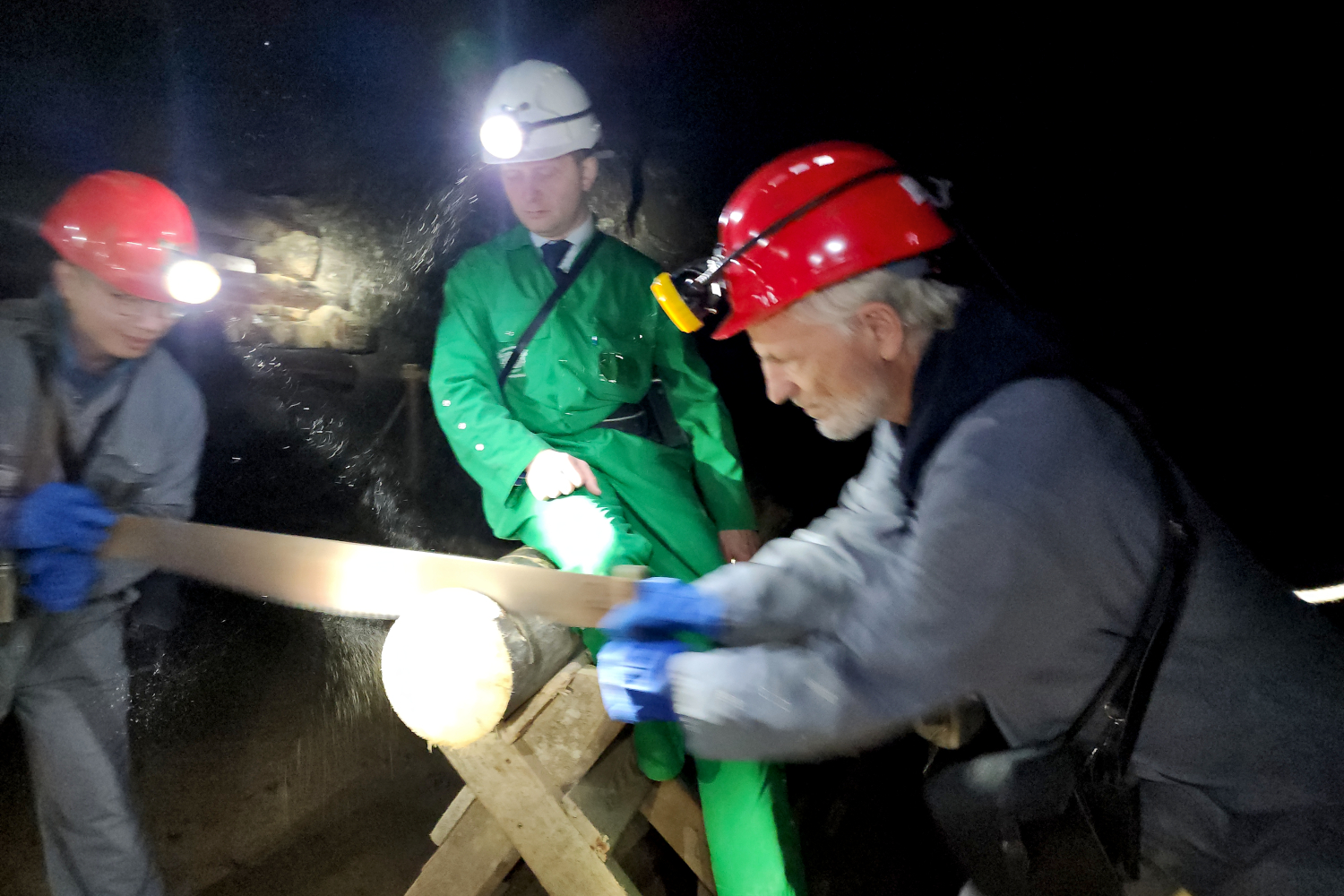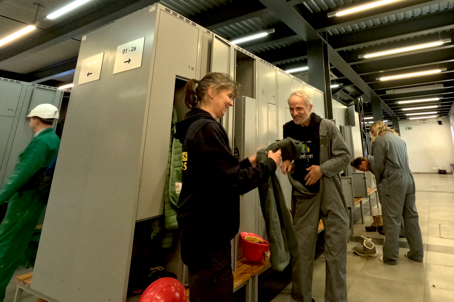 After a few minutes, along comes our guide, a fellow named Stefan, who checks us in and leads us to the lockers, where we will stash any cumbersome belongings and don gray coveralls — not as snazzy as the bright green coveralls he wears, but they’ll do. We’re also issued a hard hat with a lantern mounted on it — unlike on the tourist route, we have to illuminate our own path — and two shoulder packs: one containing a battery for the lantern, and one containing an oxygen mask in case of emergency. The impression they try to give you is that things could get rather gritty and grubby down there. But this appears to be mere performance art, especially given that under Stefan’s coveralls, he is wearing a necktie.