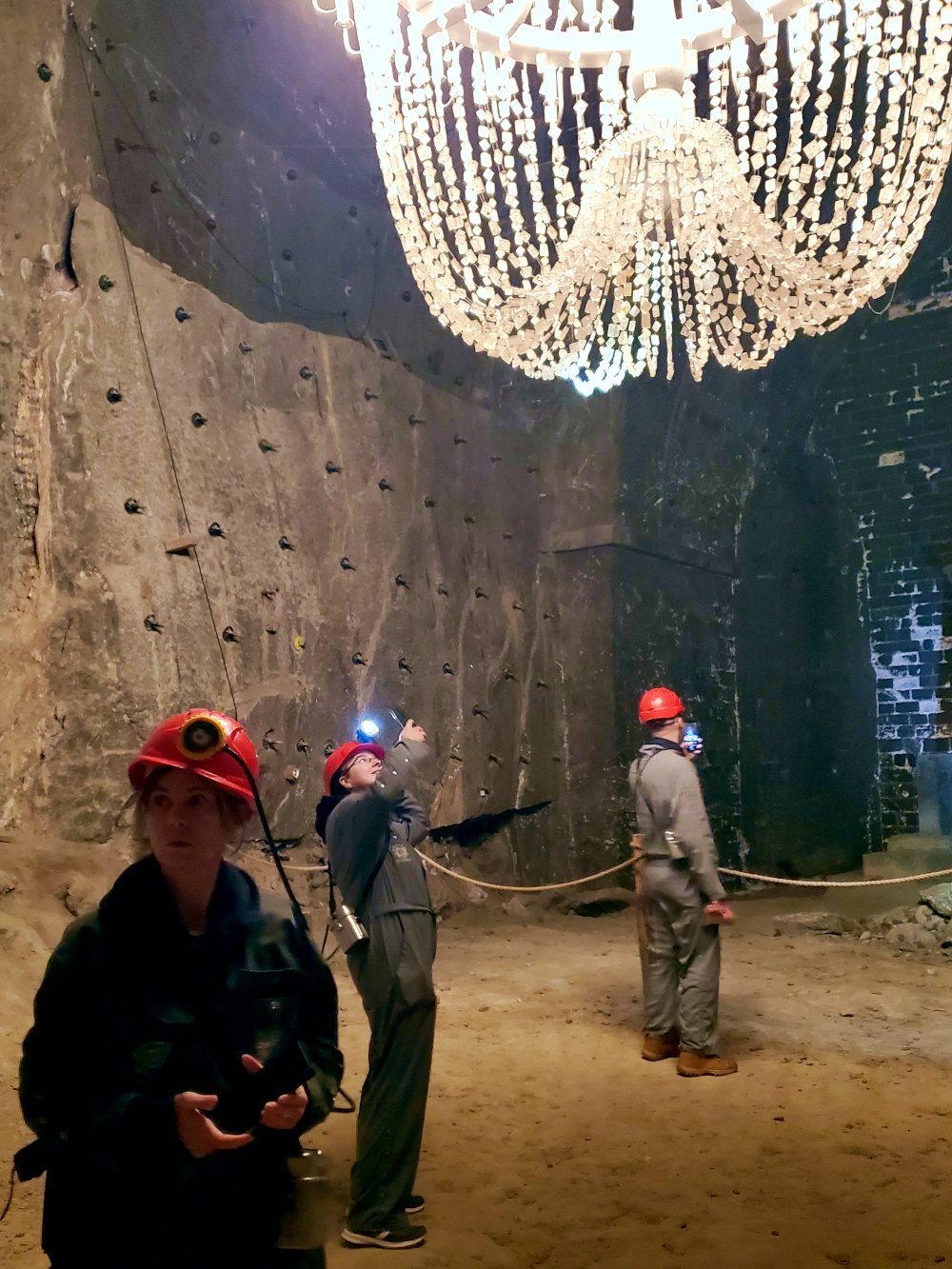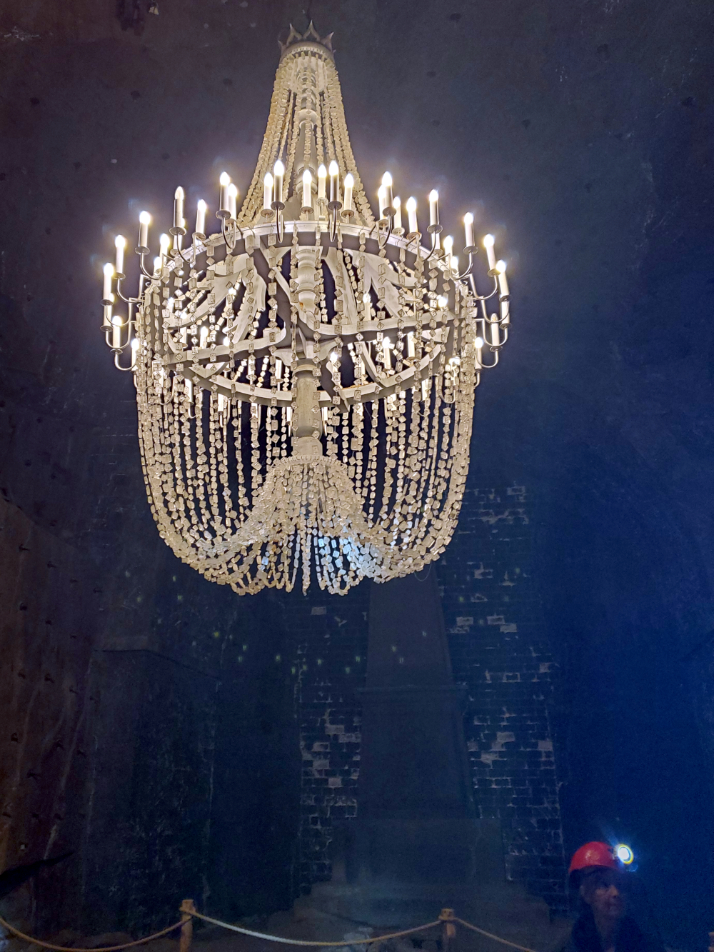 Near the end of our route, we’re ushered into one of the 40 underground chapels that miners hewed out and used over the centuries. This one, like another one we visited on the Tourist Route, has a chandelier — made, like everything else down here, out of rock salt.