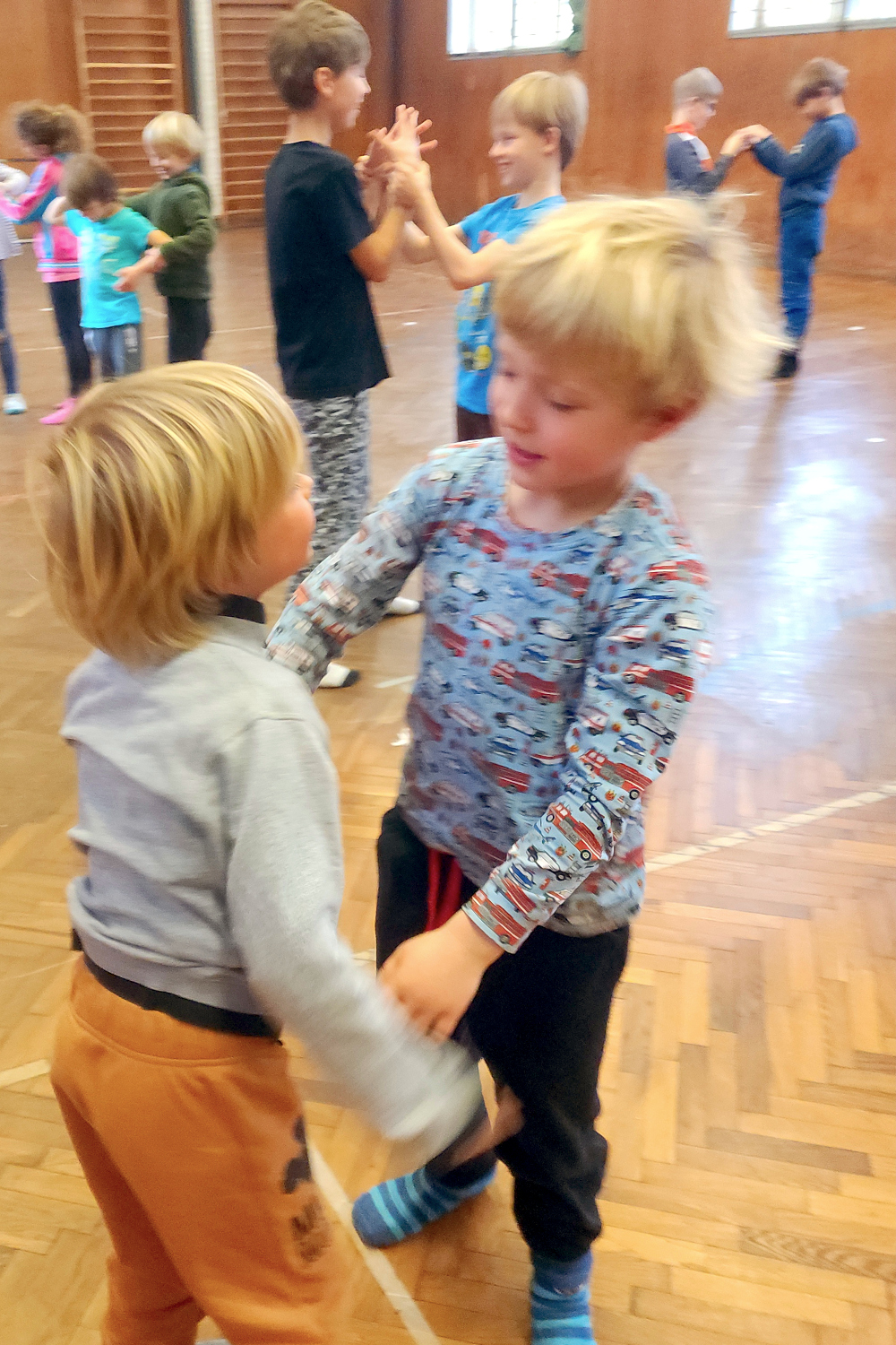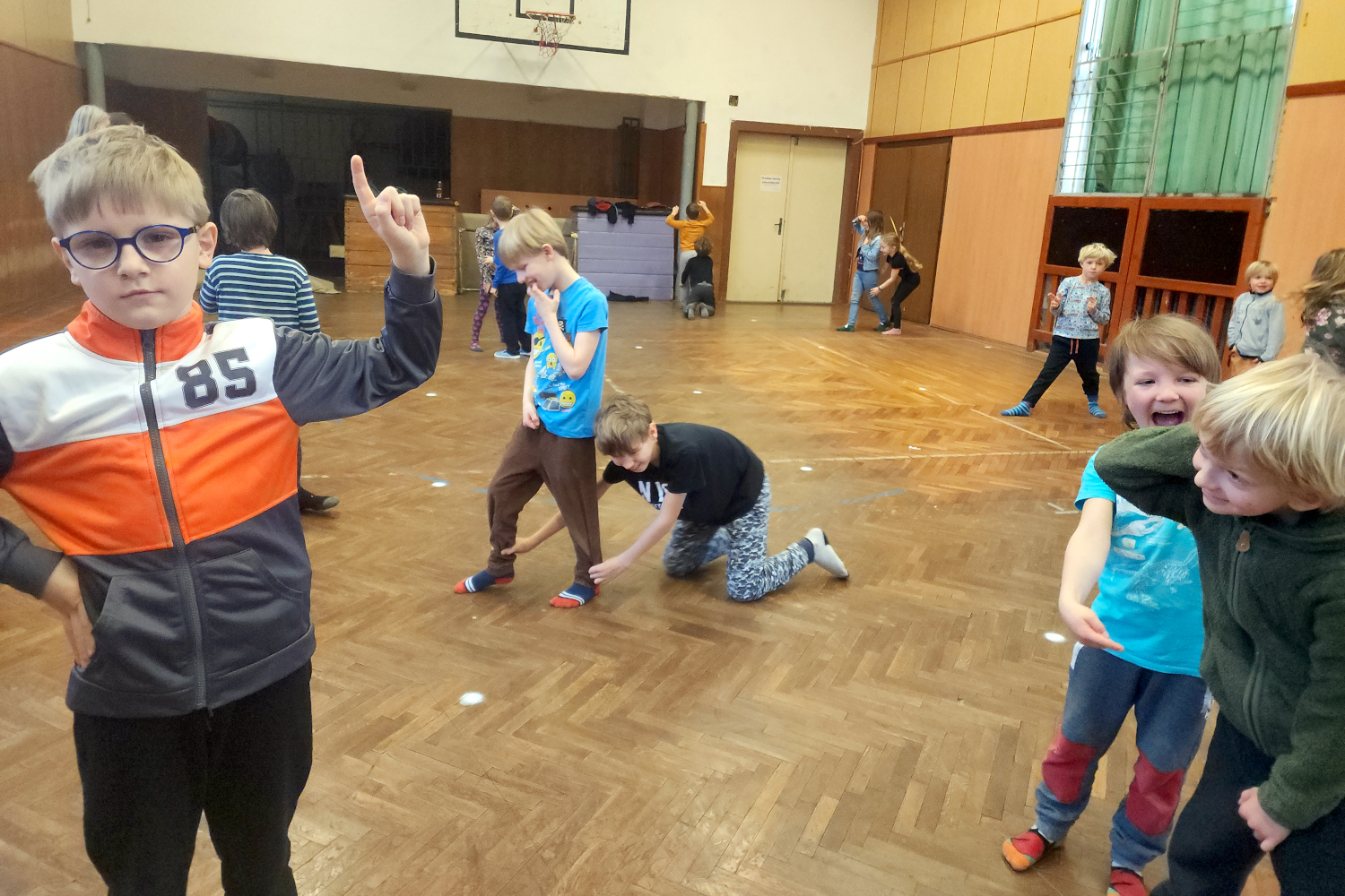 Following that, we all traipse over to a nearby gym where we hold the theatrical part. The kiddos have a ball and do some very good stuff. Altogether, a smashing success.