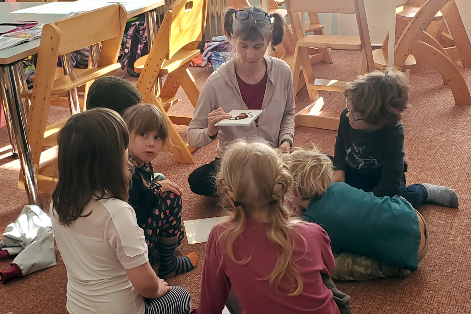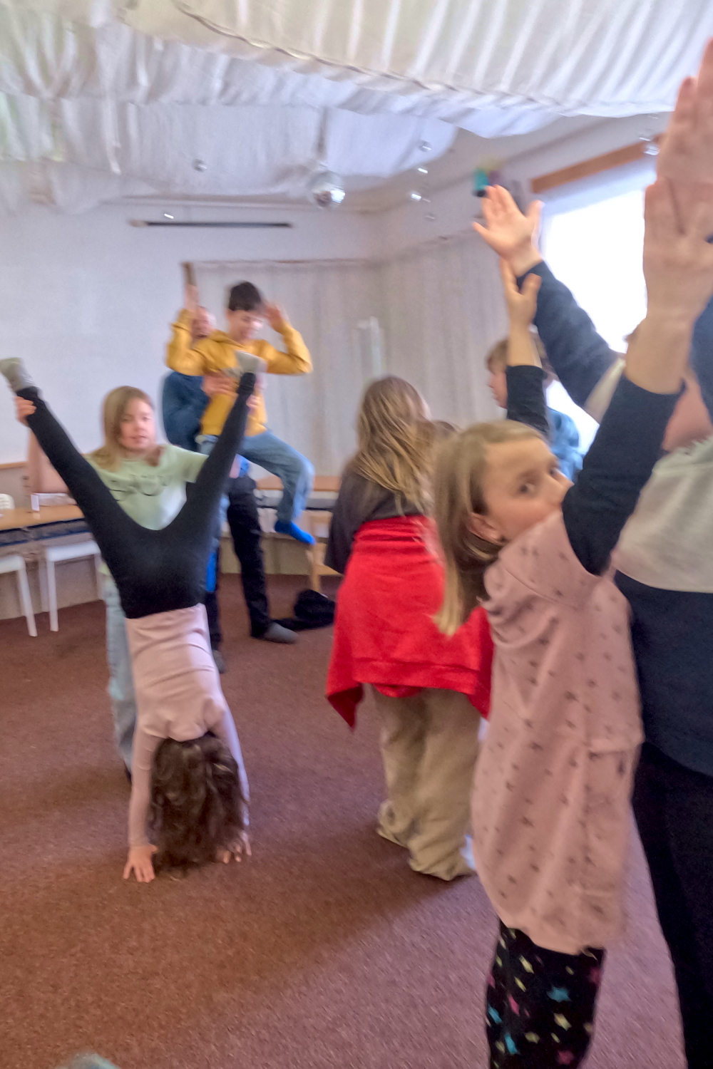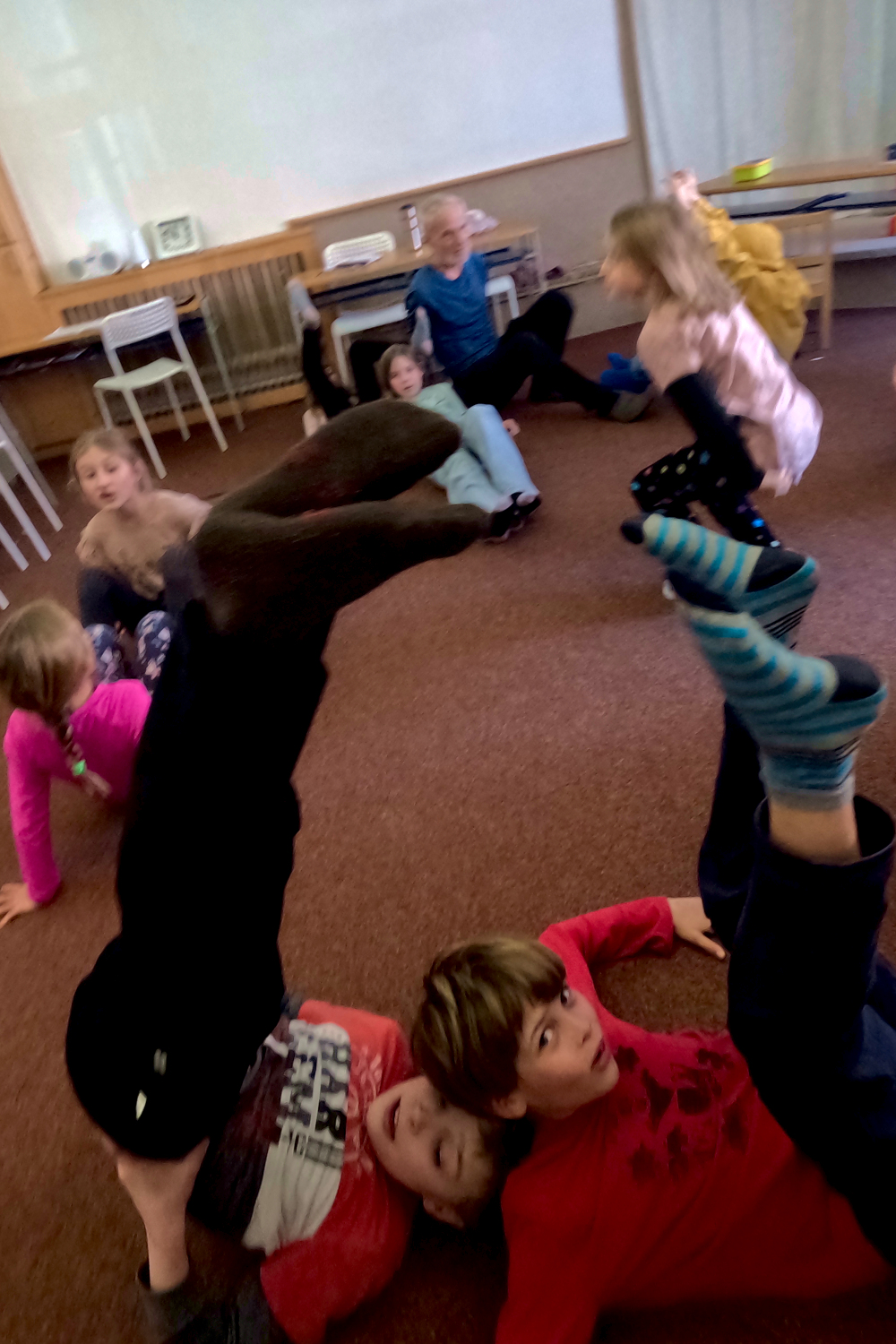 Later in the afternoon, we drop in at the arts school in town – and we’re delighted to see that there is an arts center in such a small town, a school from which the sound of a violin can sometimes be heard wafting as you pass in the street. Our purpose is to audit a theatre class taught by a tall young man to a group of 6 youngsters, including 2 from our school. He leads them through variants of some of the same theatre games and activities that we’ve taught. participated in, or considered in the past (with our years of experience, we’ve pretty much seen them all). And he puts a novel twist on some of them, resulting in a refreshing little session that the kids really enjoy. As do we.