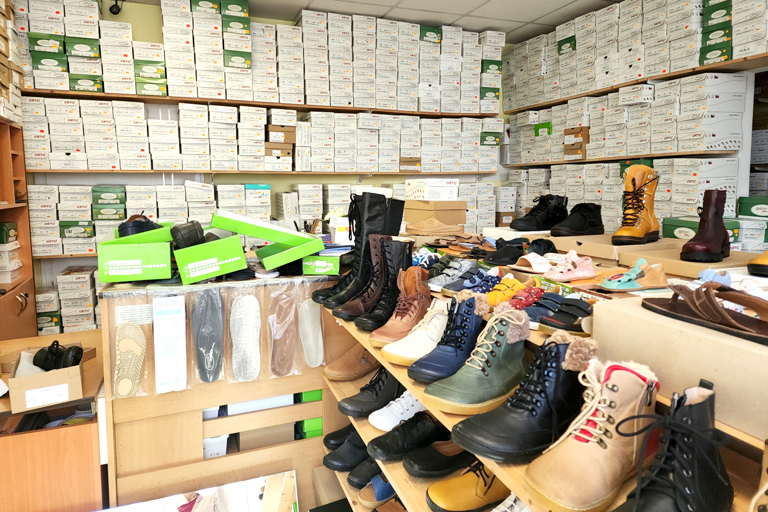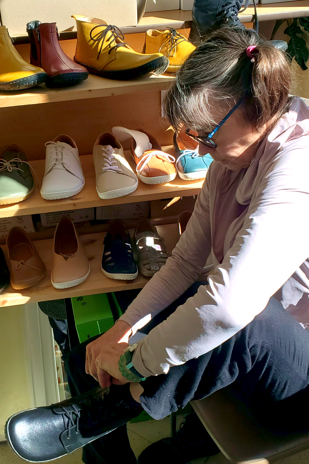 The company we drop in on is called Orto, as in Orthopedic, because their focus seems to be therapeutic footwear. But they also have quite a few smart-looking barefoot shoes on display, in a variety of colors, in the tiny showroom. There are several that appeal to our eye, but are not quite right for our clod flippers. Not to worry, the helpful saleslady goes back to the warehouse (and/or factory) to retrieve more for us to try. Well… those are not quite right, either. So she goes to fetch more again. And then again. Finally, after about an hour of her patiently tolerating and indulging us, we have a bingo. Both of us. Which is quite a miracle. It’s a miracle enough that Dennis found appropriate shoes for his duck feet, but for Kimberly to find some at the same time is astronomically improbable. Yet here we are, both happy hikers.