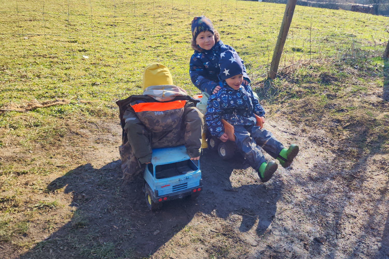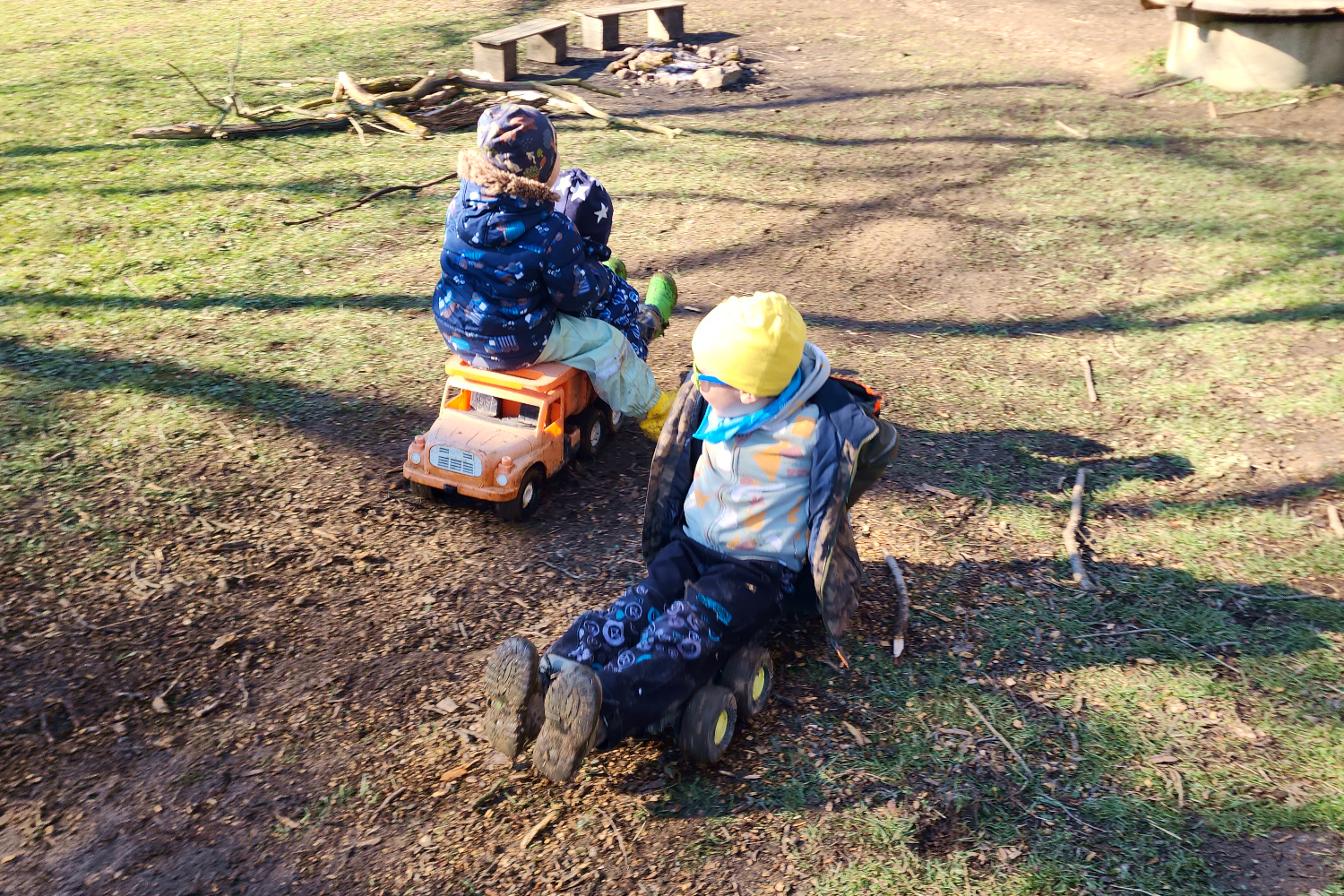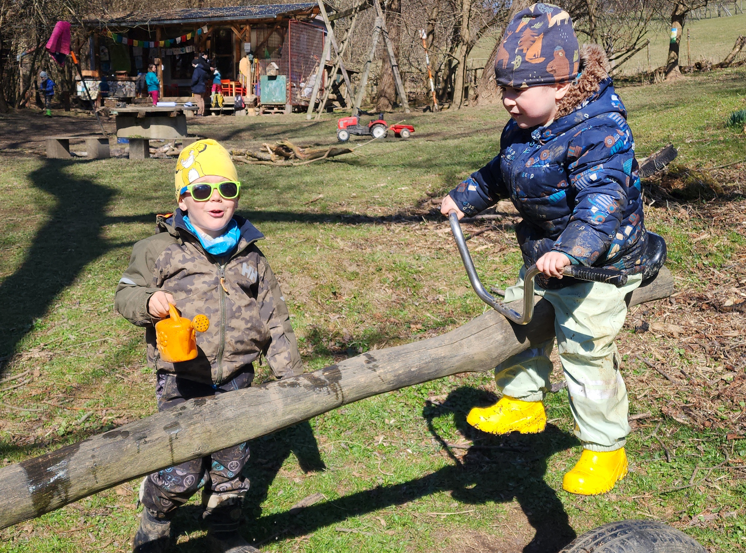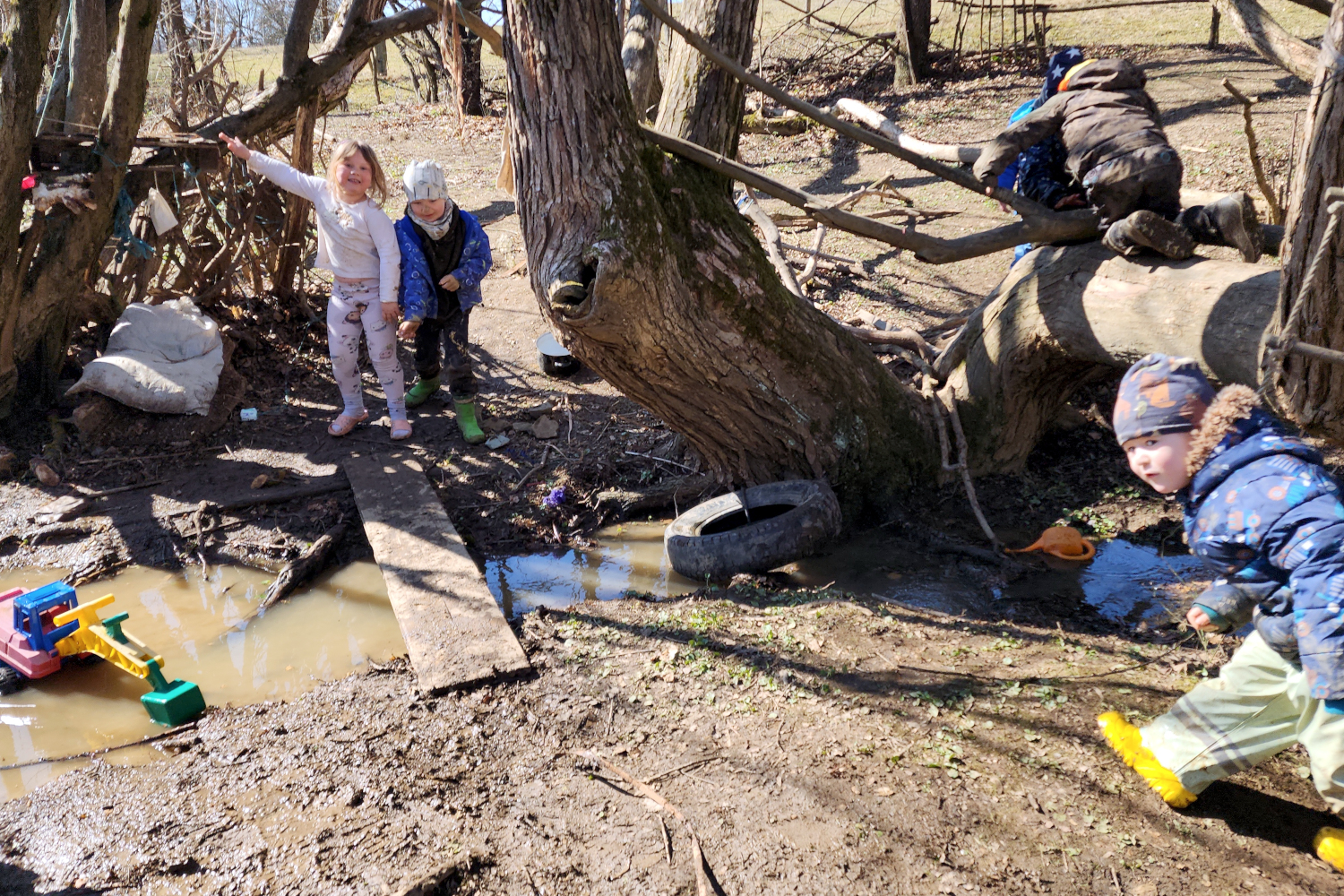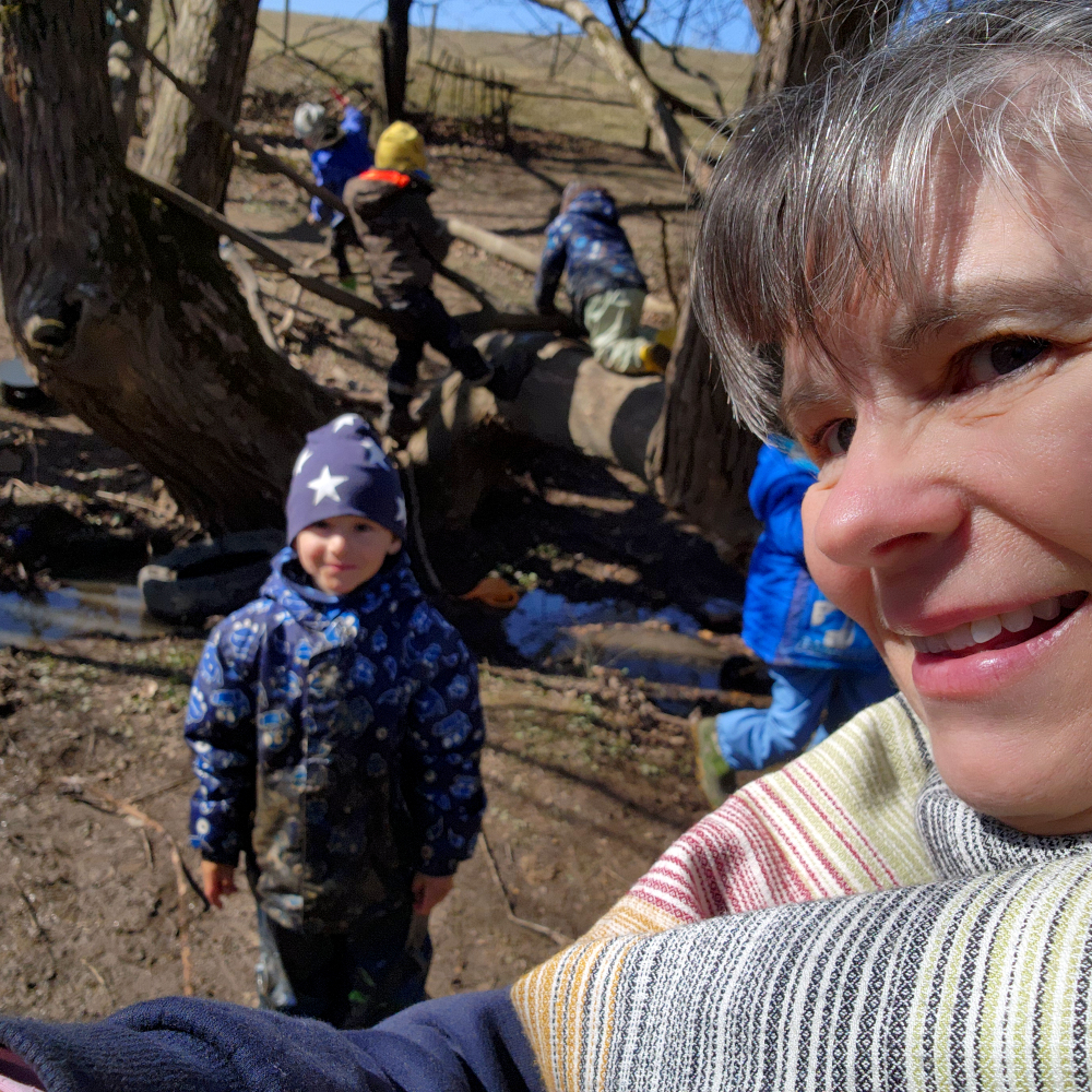 Speaking of kid stuff, Kimberly has another morning with the kindergarten at their hideout called The Forest. Which is not exactly a forest, but it is a hike away from the campus, in a tree-ish spot with a tree house, swings, a sandbox, and many other dream features for a toddler. Even a deliciously muddy stream they can cavort in with the rain boots they all wear every day. How much better could being a kid get?
