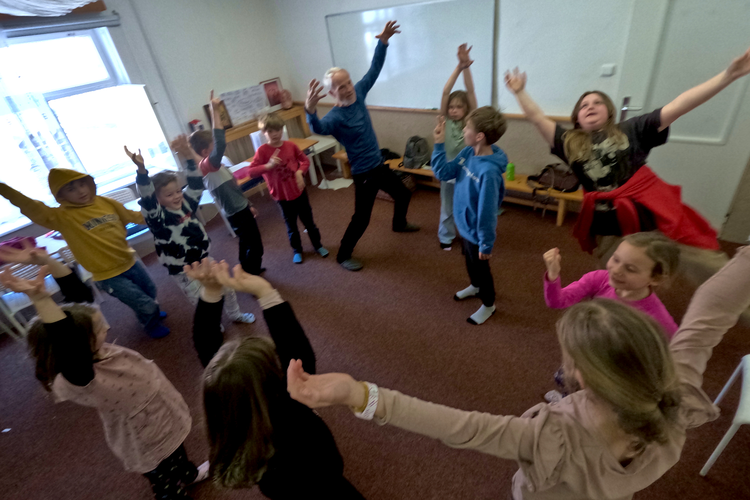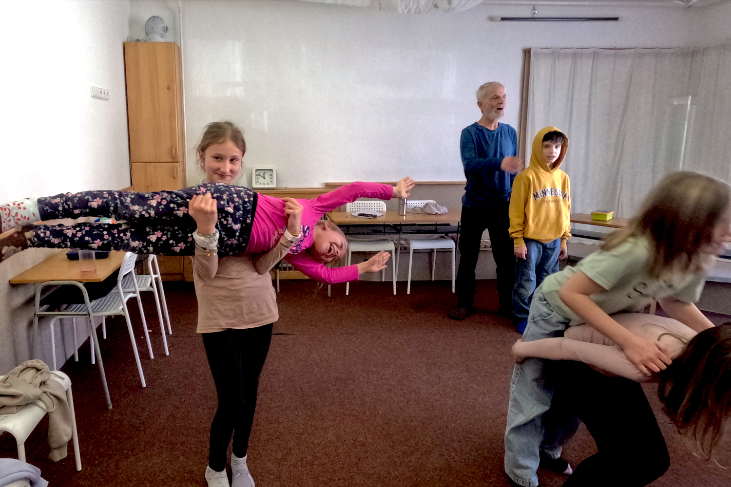 The younger students — not the kindergarten, but the lower grades — again rehearse their performance of “The Boy Who Cried Wolf”, which they’ll be presenting at a school event the following week. And they do quite smashingly, despite the cramped classroom that serves as their rehearsal space. They also run through some exercises that involve making letters with their bodies, and have a blast doing it. Later in the week, we’ll be rehearsing the upper grades for another story, which we call “The Silly Boy”.